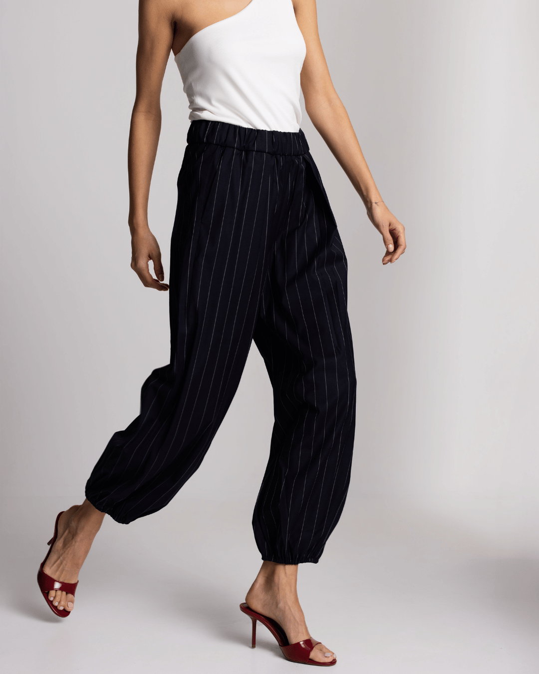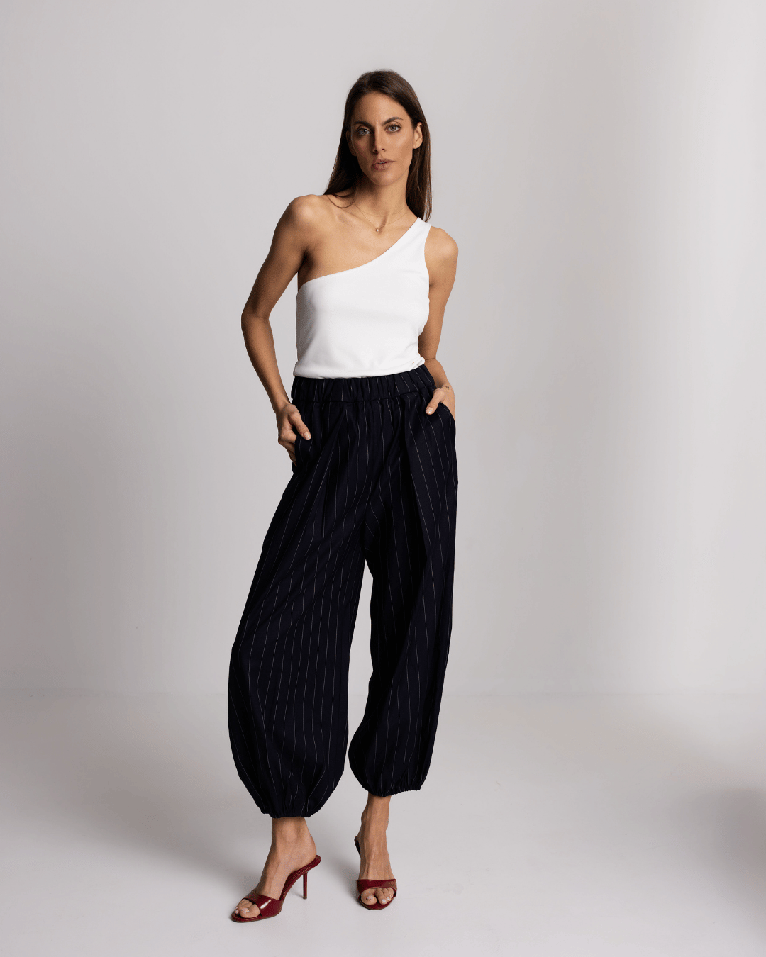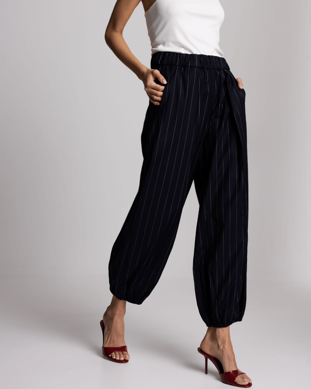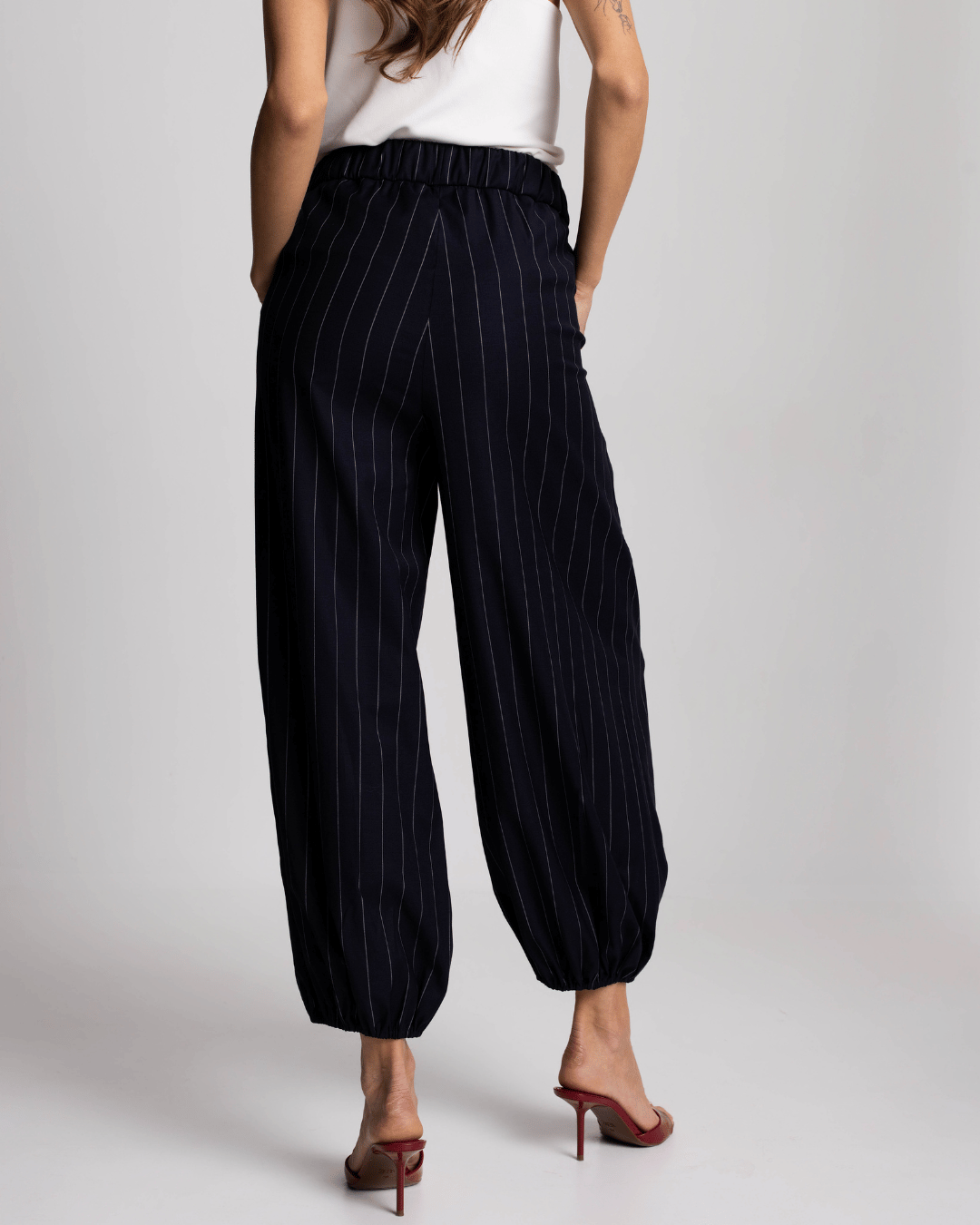 Ženske balon pantalone u teget nijansi sa belim prugama, modernog kroja i elegantno opuštene siluete, idealne za posao, večere i urbane dnevne kombinacije