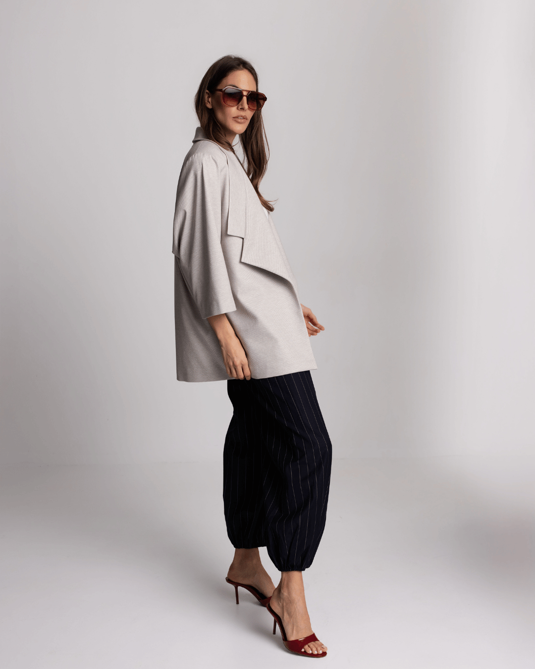 Materijal: 60% runska vuna, 36% viskoza, 4% elastin Ballon pantalone teget boje sa belim prugama brenda People Like Us spajaju upečatljiv kroj i lakoću nošenja u komadu koji odmah podiže ceo outfit. Širi volumen u nogavicama, sužavanje ka članku i kontrastne bele pruge daju im moderan, sofisticiran izgled, dok mešavina runske vune, viskoze i elastina doprinosi udobnosti i lepom padu materijala. Lako se kombinuju uz košulje, bluze, topove i sako, pa su odličan izbor za posao, večere, prolećne izlaske i city styling kada želiš nešto drugačije, a nosivo. Održavanje: hemijsko čišćenje, peglanje na niskoj temperaturi, ne izbeljivati