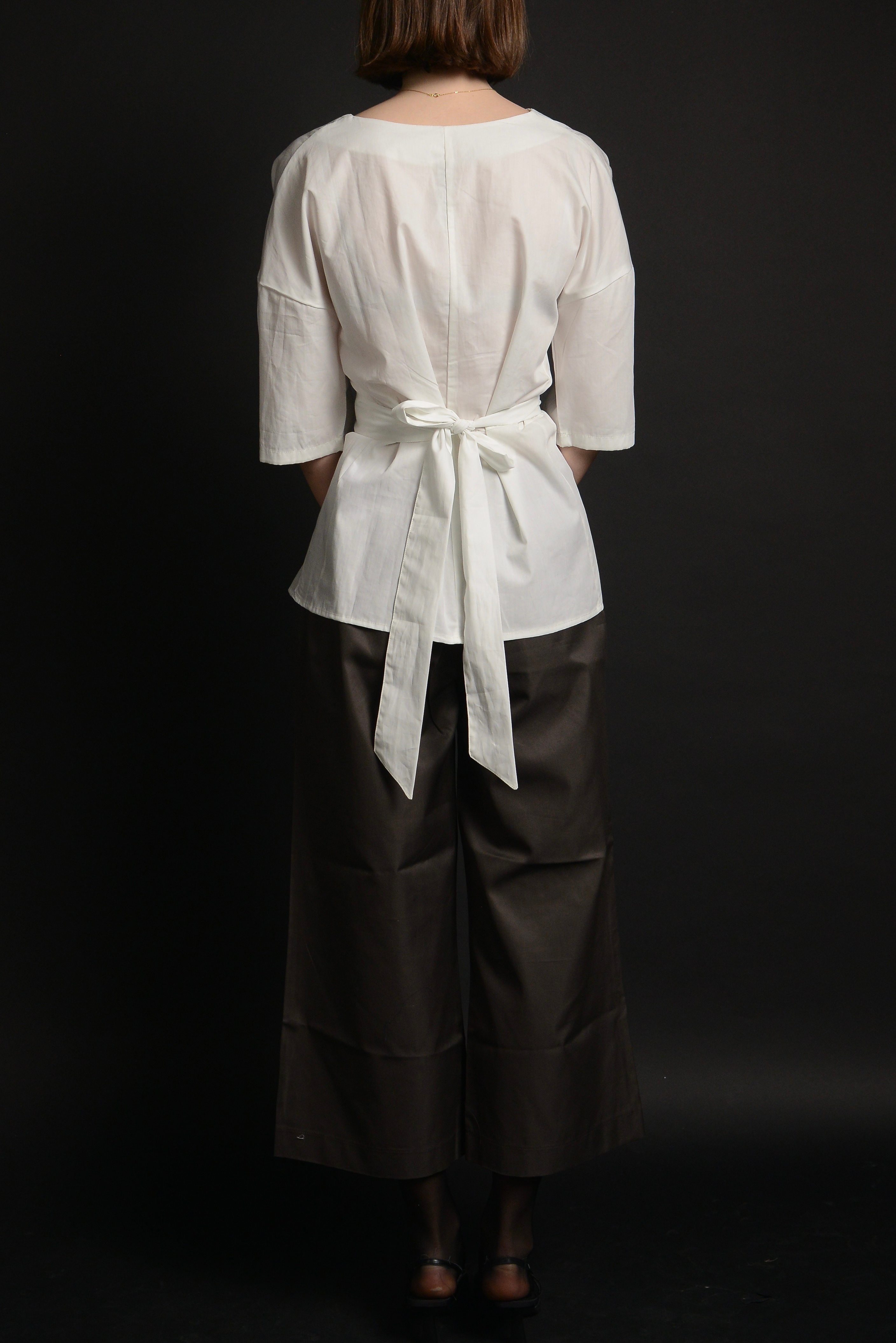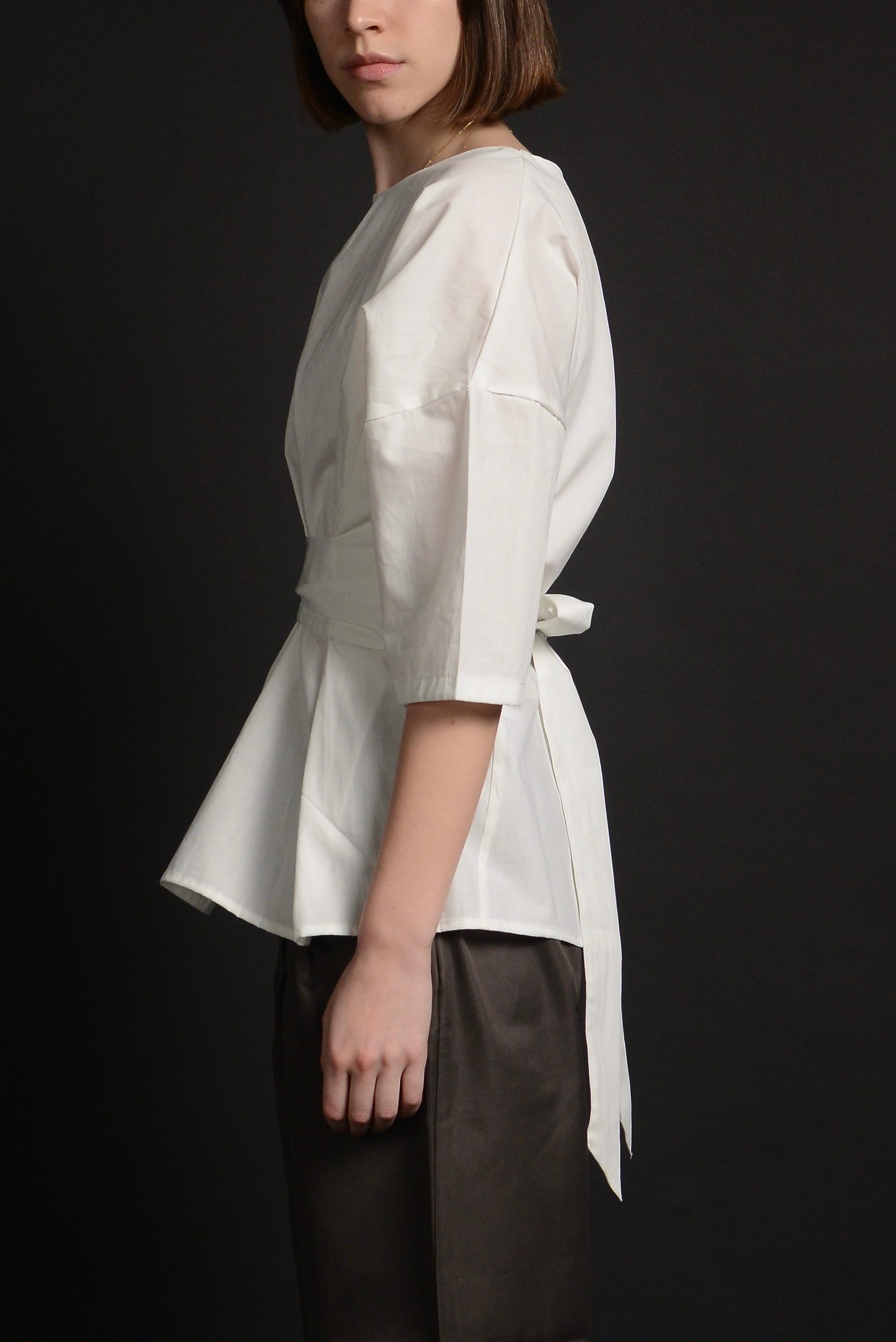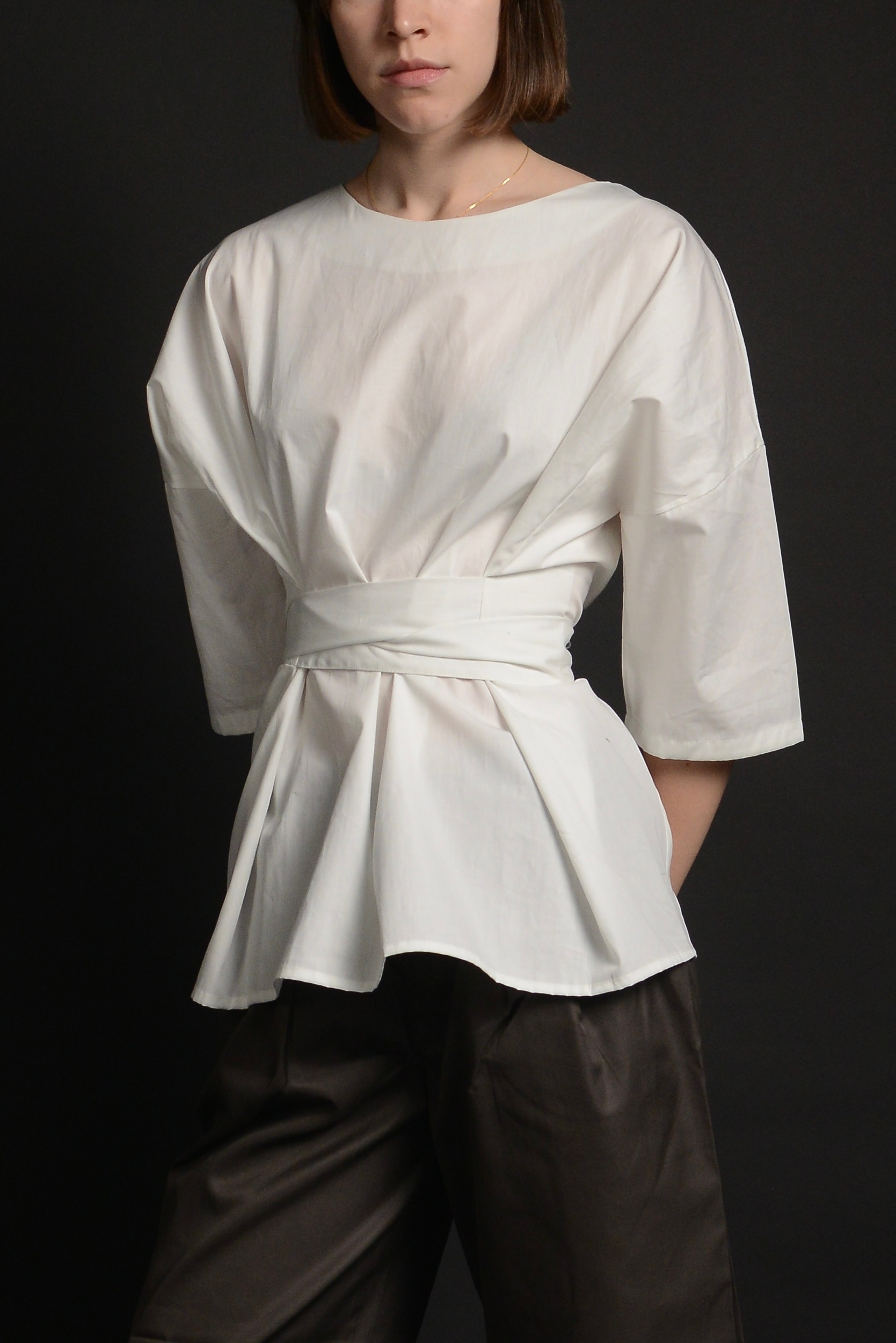 ONE SIZE bluza od pamučnog puplina sa okruglim štircanim izrezom, vezivanjem oko struka i tri čevrt rukavima. Odgovara veličinama od S-L.