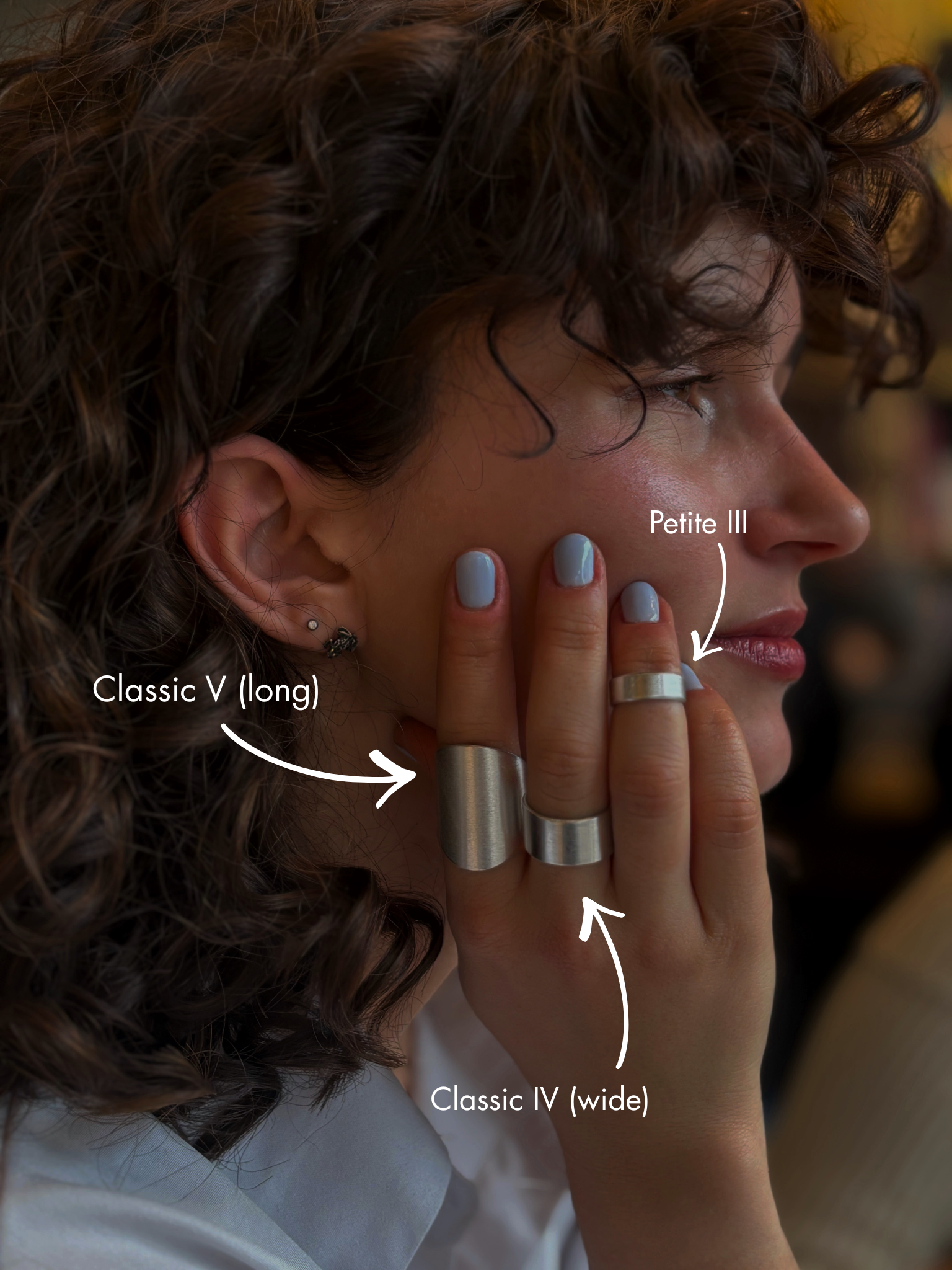 MATERIJAL: Prsten je pravljen od laganog i izdržljivog aluminijuma. DIMENZIJE: Prsten je kružnog preseka. - 18mm - 19mm - 20mm ODRŽAVANJE: Otporan na koroziju. Nakit se ne menja u kontaktu sa vodom, kozmetičkim preparatima ili sredstvima za održavanje higijene ruku. Ne ostavlja tragove na koži. NAPOMENA: CLASSIC V (short) se od CLASSIC V (long) razlikuje u dužini. Za više informacija obratite nam se putem chat box-a ili email-a artonstudiomne@gmail.com