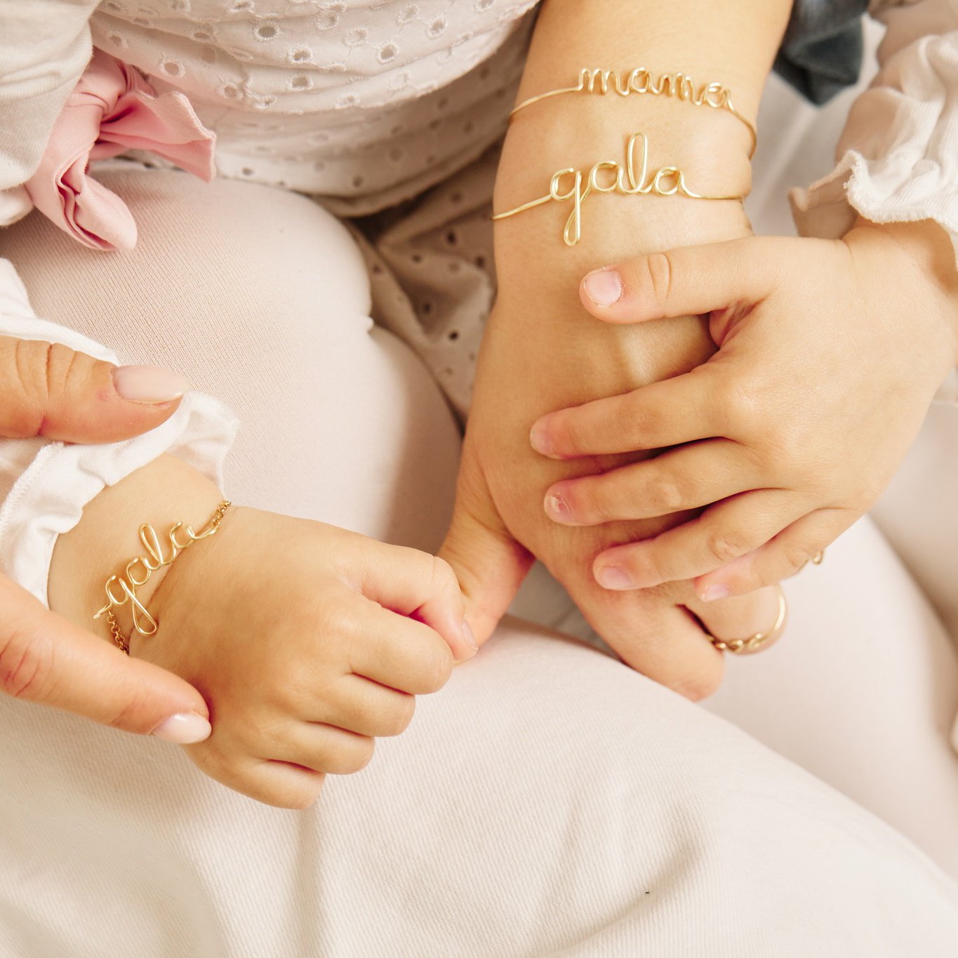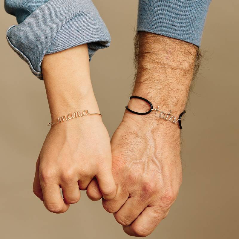 Narukvica na ručno oblikovanoj žici od valjanog zlata. Na narukvici je ispis MAMA.