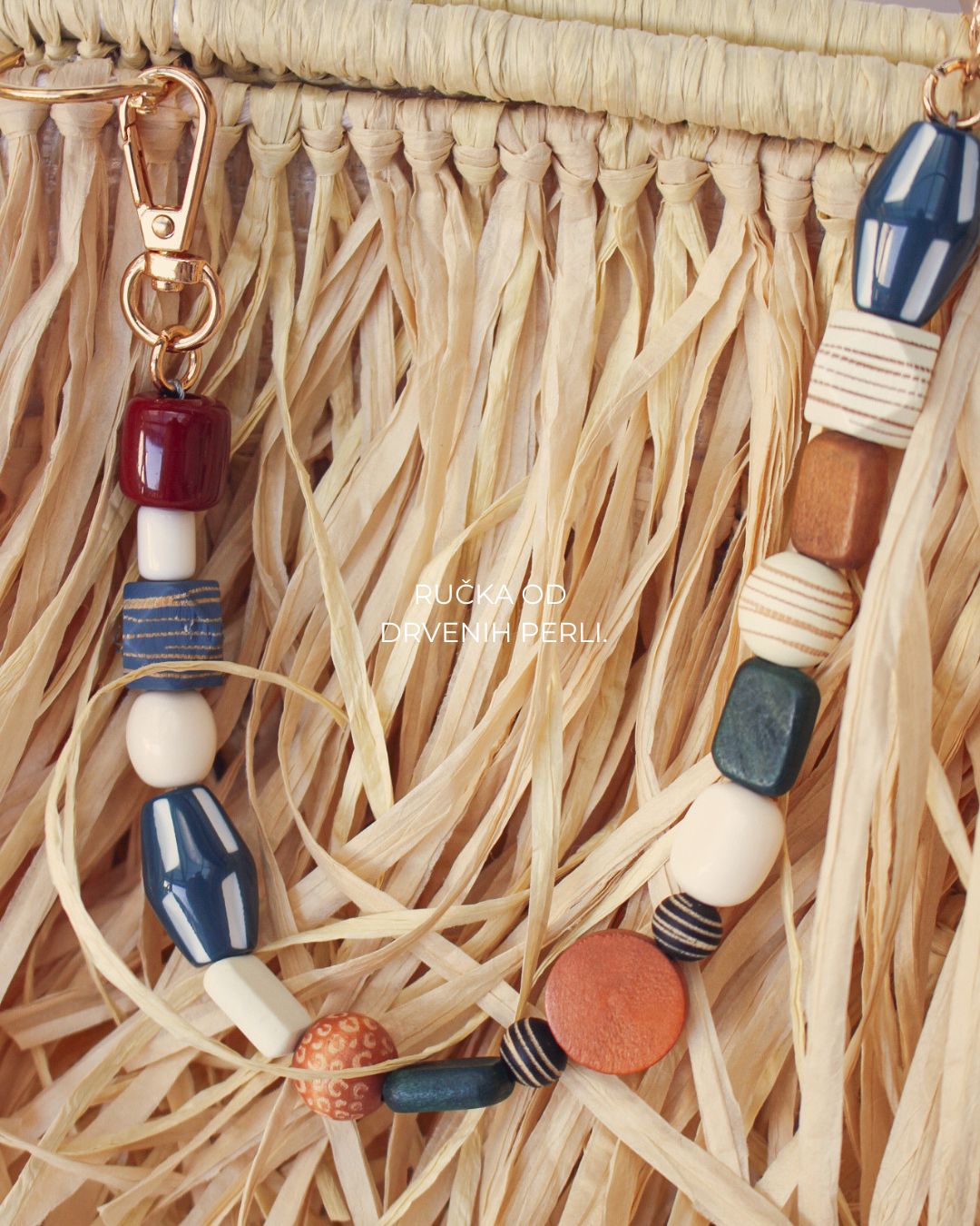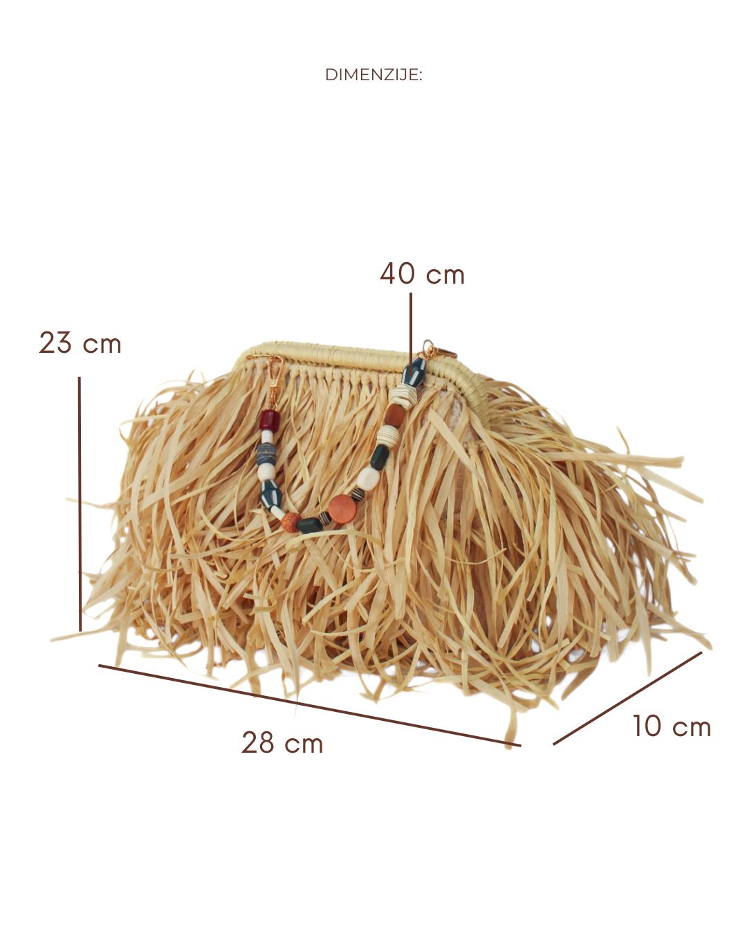 MATERIJAL: Rafija, drvene perle, metalna galanterija, unutrašnja podstava DIMENZIJE: dužina 28 cm × visina 23 cm × širina 10 cm x dužina ručke 40 cm OPIS: Ručno rađena torba, sa resama od rafije, u krem boji. Torba ima ručku u boho stilu, od drvenih perli. Metalna galanterija je u boji zlata a torba ima unutrašnju pamučnu podstavu, kao i unutrašnje ojačanje, tako da je čvrste forme i neće se deformisati tokom nošenja. Prostrana, lagana i udobna za nošenje, ova torba može poneti sve ono što vam je svakodnevno potrebno. Dizajn je unikatan.