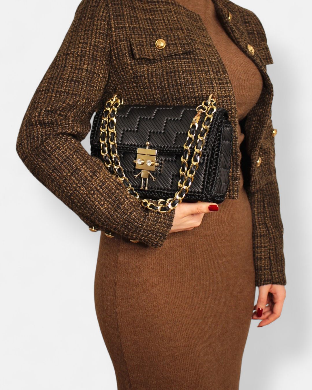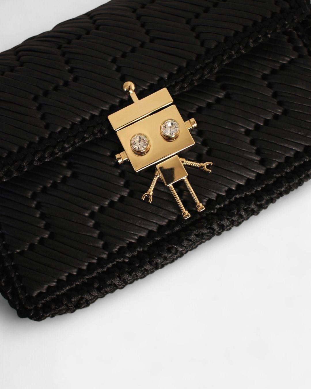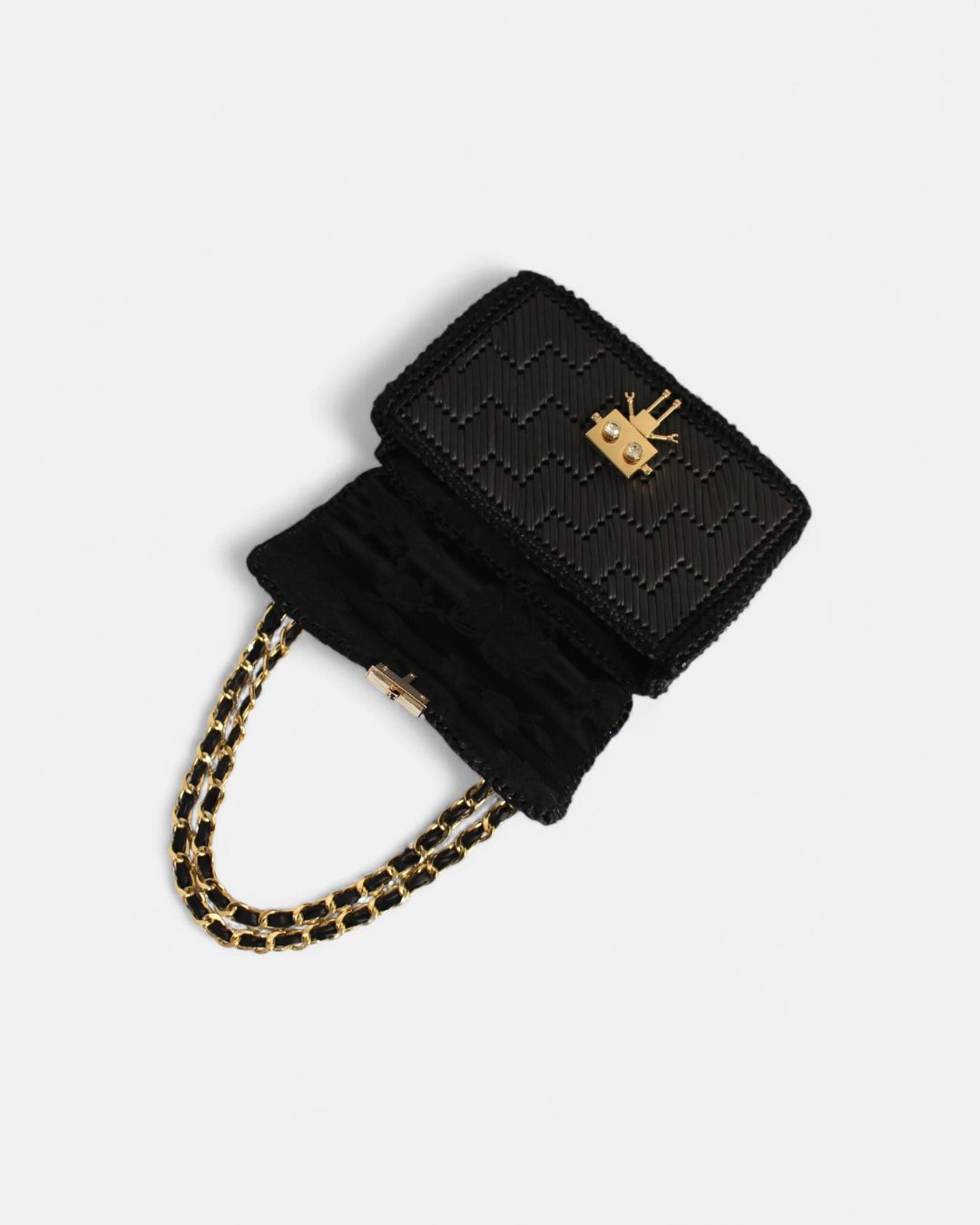 Handmade torba, u crnoj boji, vezena od trakica veštačke kože, sa metalnom galanterijom u boji zlata.