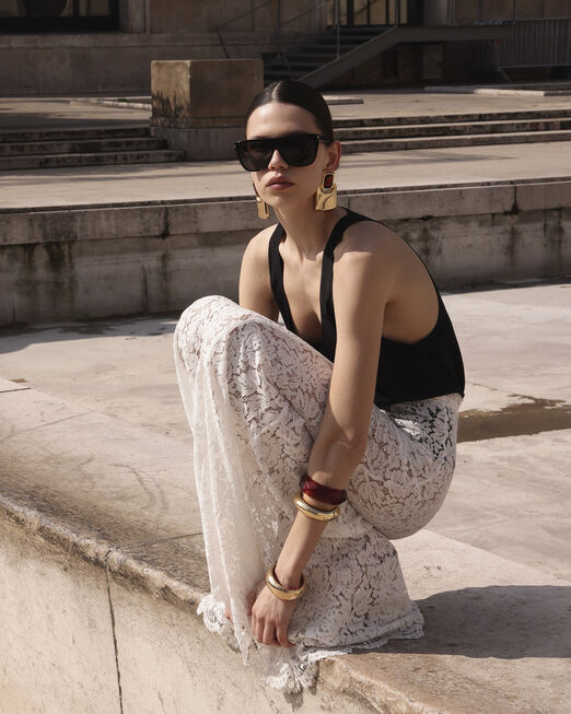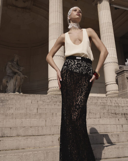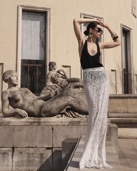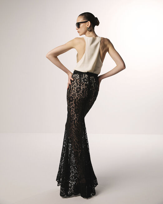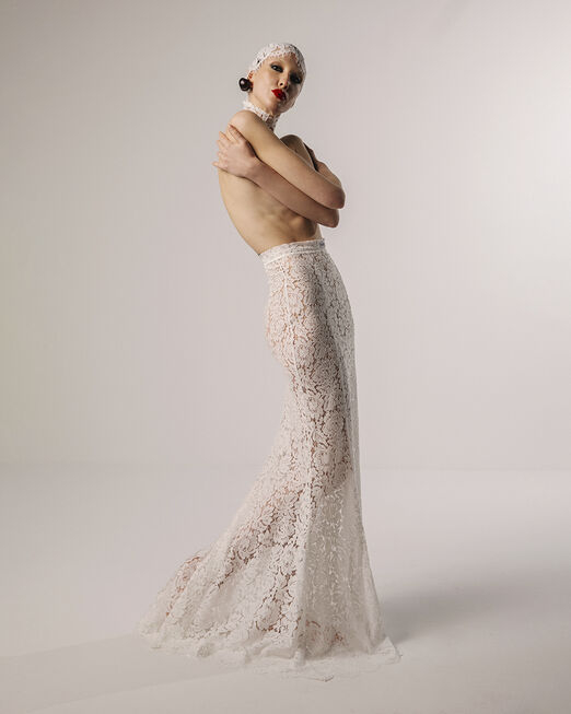 MATERIJAL: 100 % čipka ODRŽAVANJE: Ručno pranje hladnom vodom i sličnim bojama. OPIS: Italijanska čipka, sirena kroj. Zaobljene ivice ljube pod dok je skriveni rajsfešlus na ledjima čini elegantnom i sofisticiranom. Ženstvena, fluidna i oštra gde treba – ova suknja je napravljena da bude primećena. NAPOMENA: VELIČINE XS I L SE RADE PO NARUDŽBINI // Biće spreman za slanje u roku od 5 radnih dana.