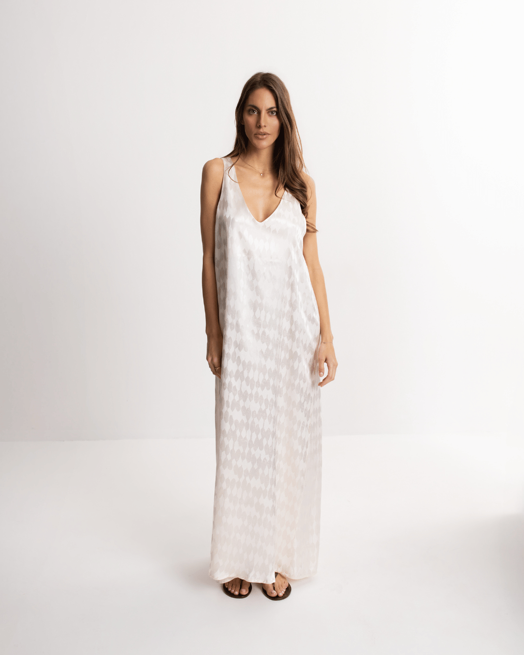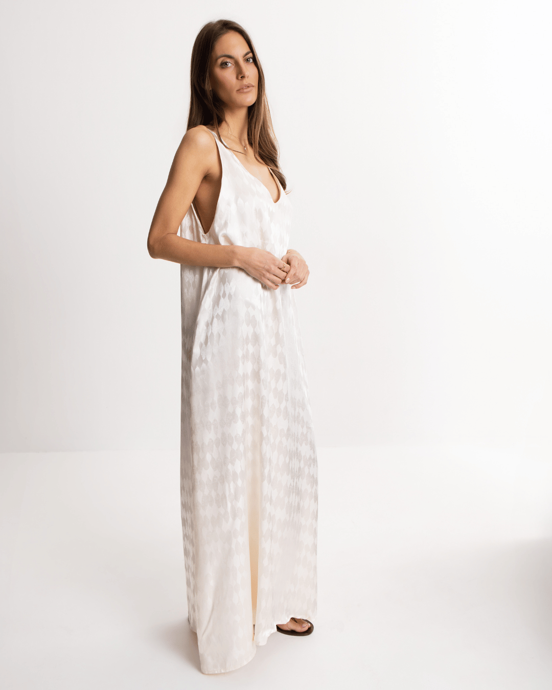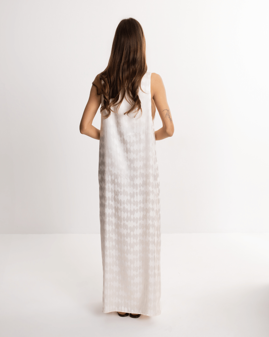 Elegantna duga haljina od viskoze u bisernoj nijansi, laganog pada i ženstvene siluete, idealna za letnje večeri, odmor i posebne prilike.