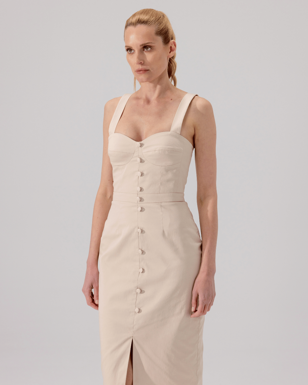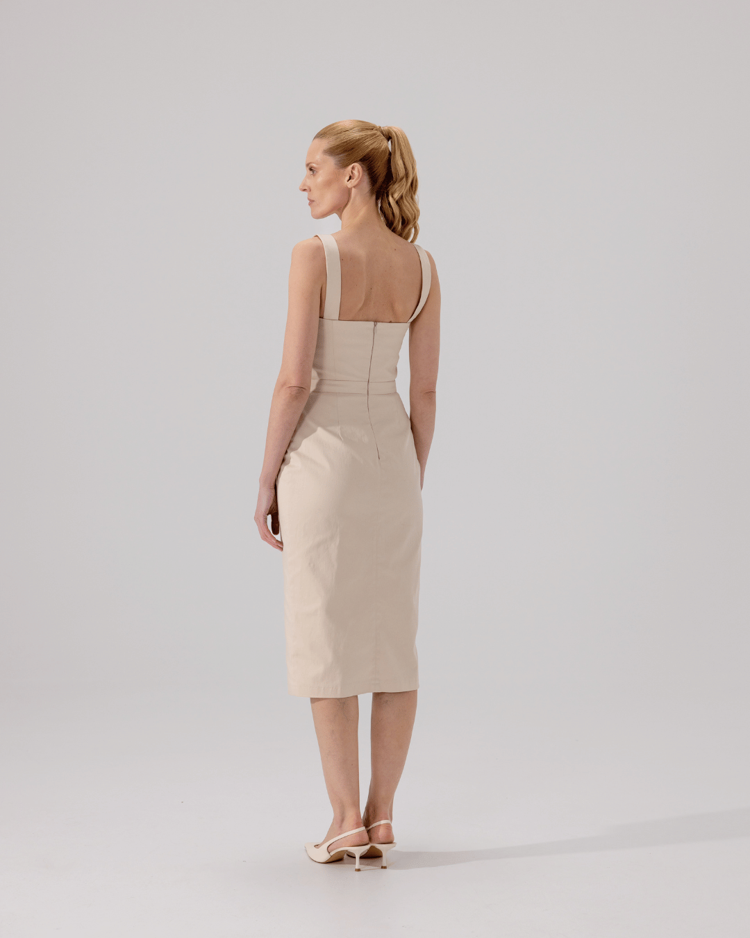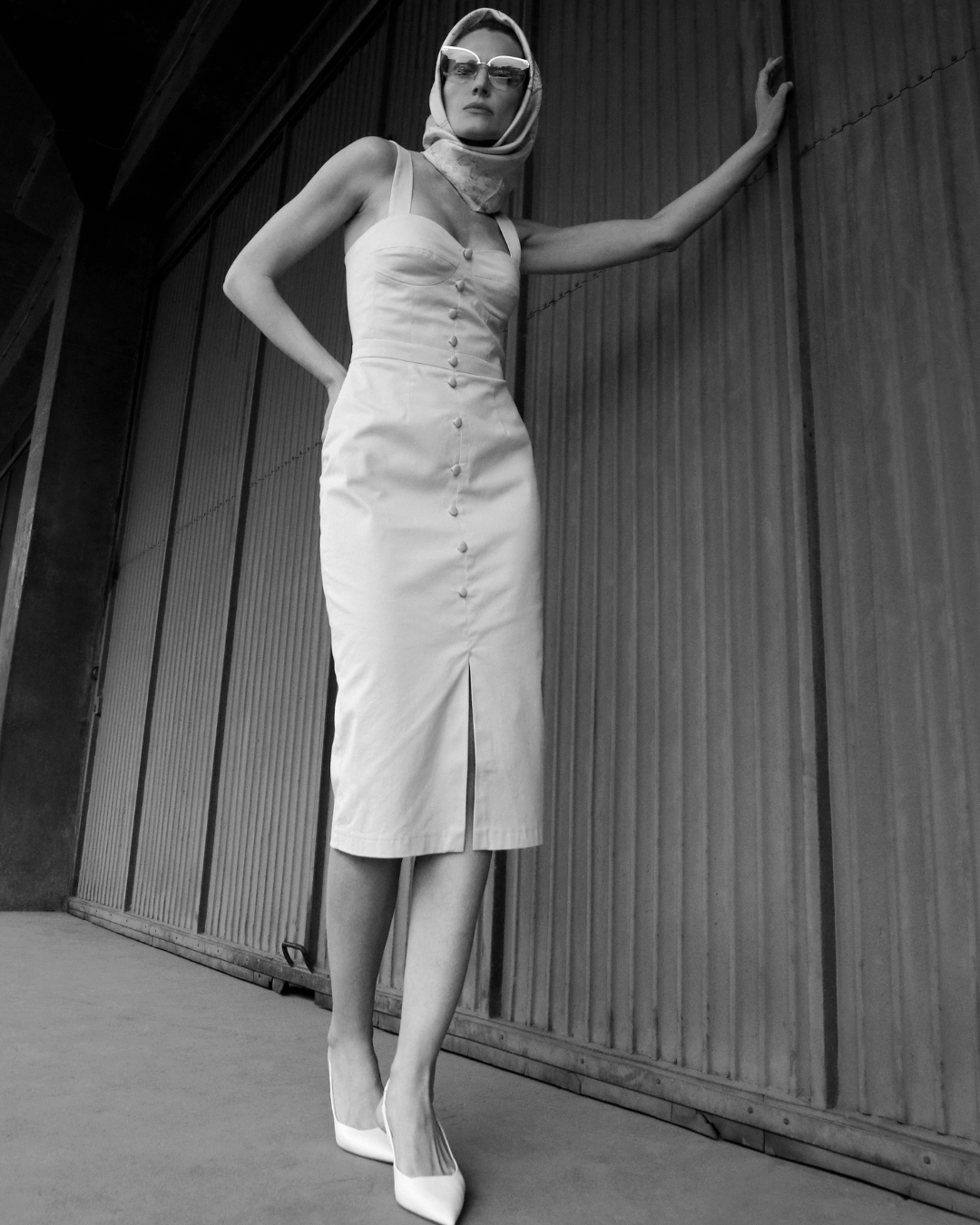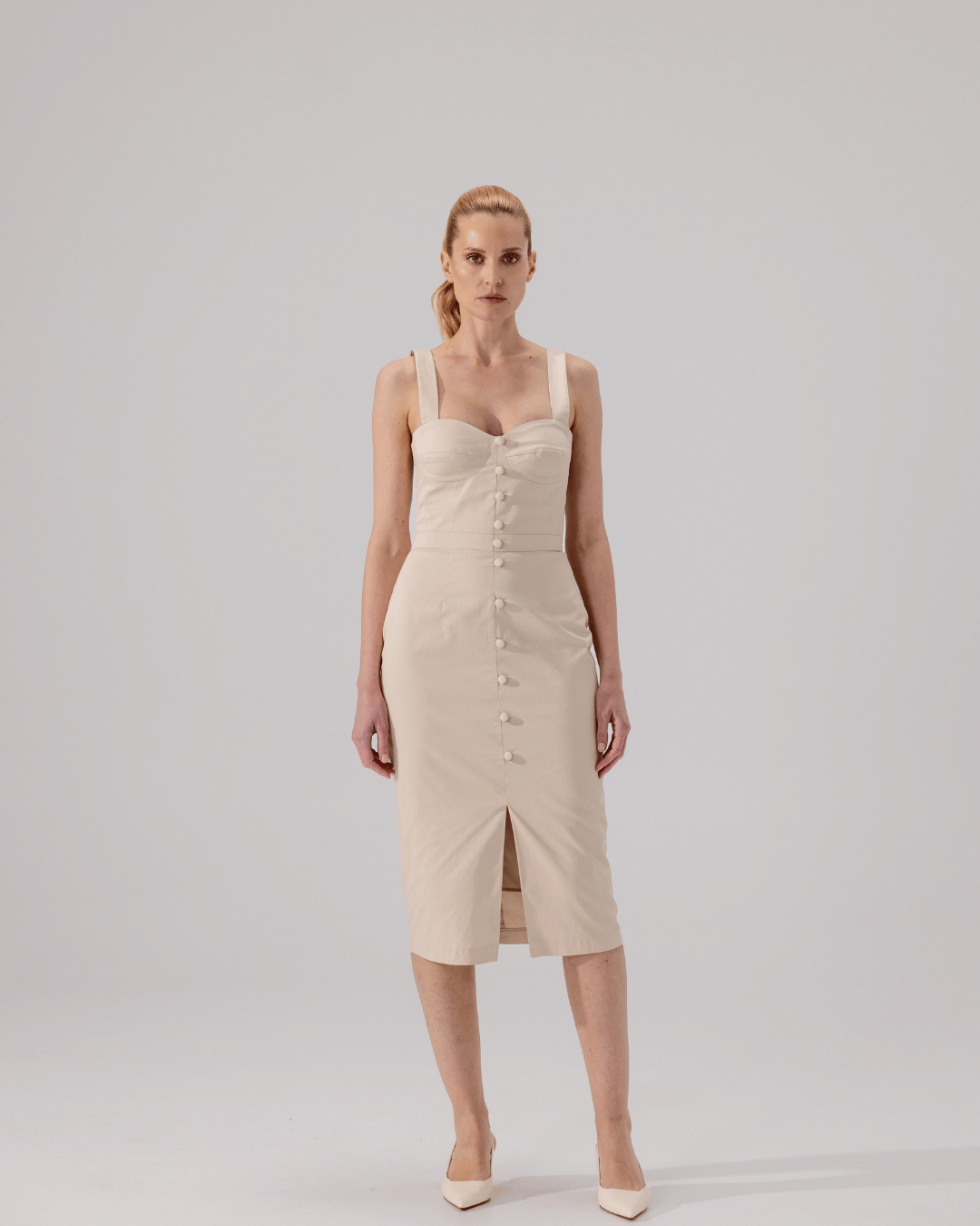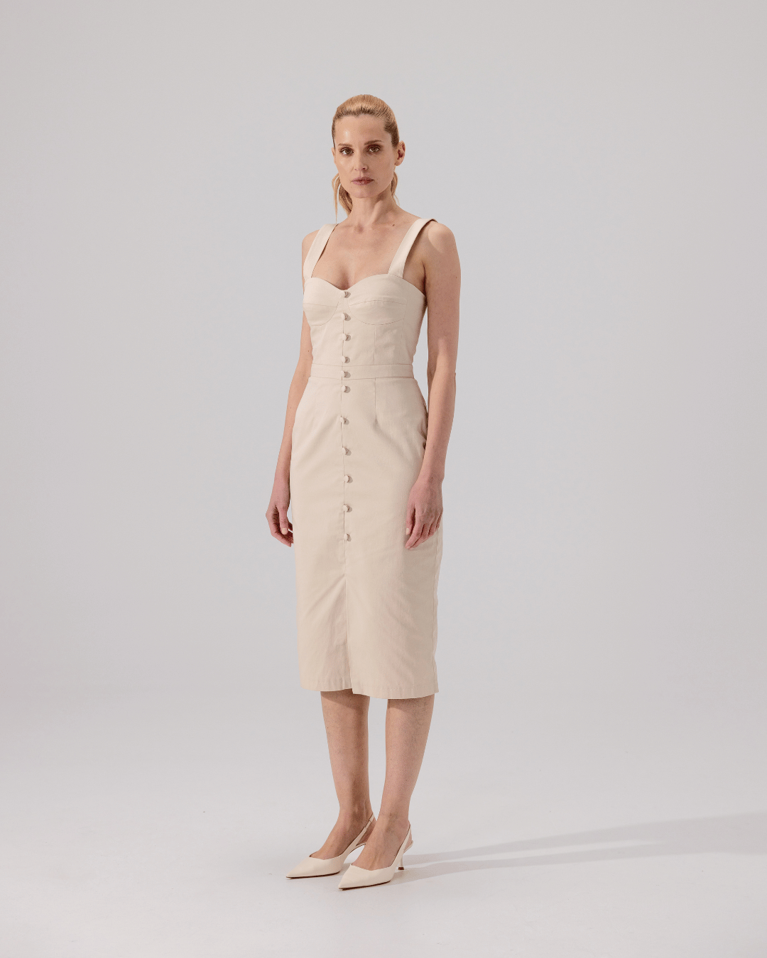 Haljina od pamučnog poplina, dizajnirana da istkane figuru. Duž prednjeg dela ima prekrivene dugmiće što joj daje prefinjen i sofisticiran izgled.