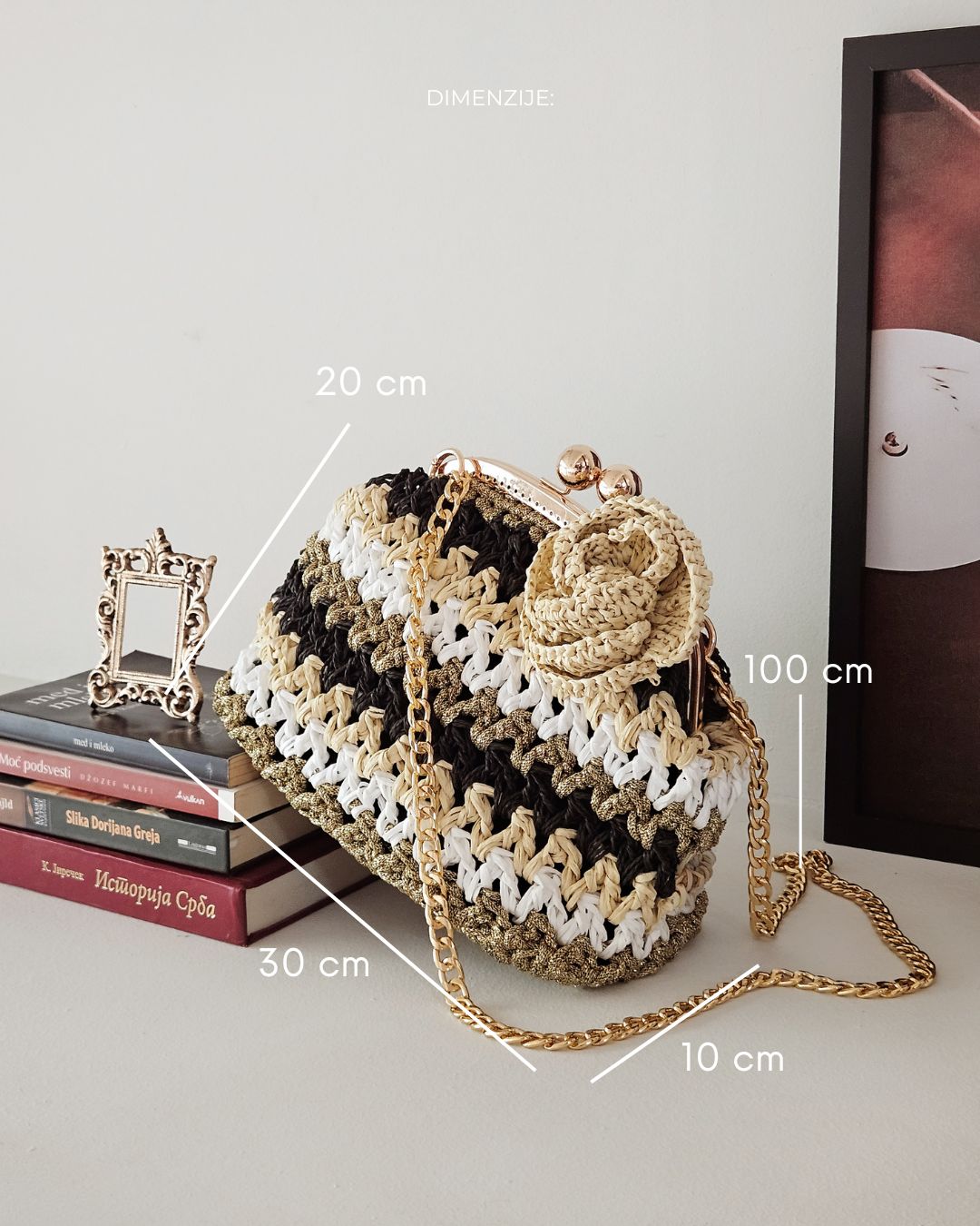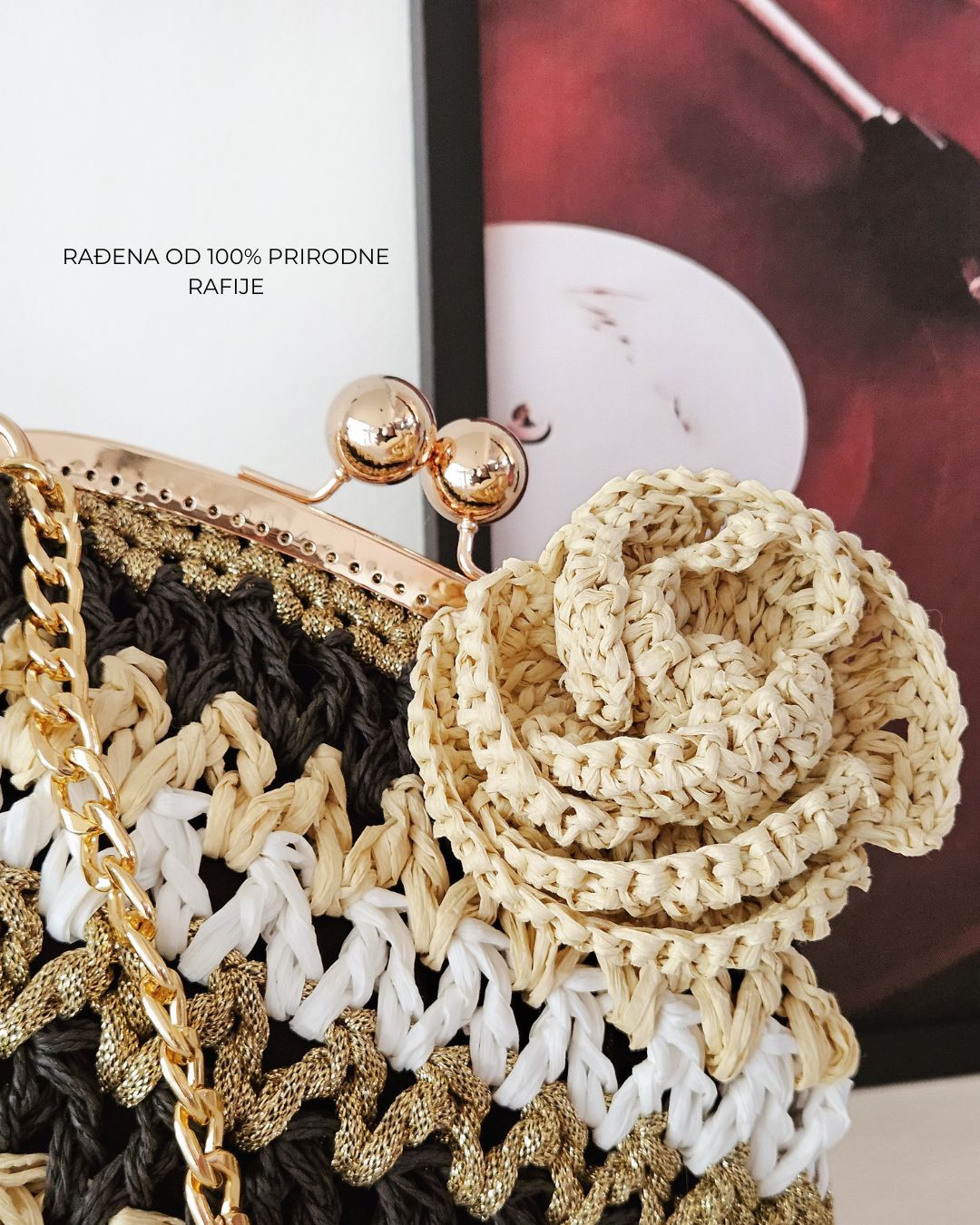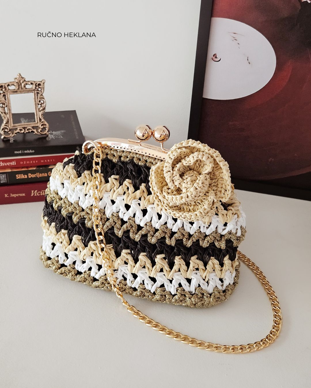 MATERIJAL: Rafija, akrilni konac, metalna galanterija, unutrašnja podstava DIMENZIJE: dužina 30 cm × visina 20 cm × širina 10 cm OPIS: Ručno heklana clutch torba, od 100% prirodne rafije, u crnoj, krem, zlatnoj i beloj boji, sa heklanim cvetom u krem boji. Metalna galanterija je u boji zlata a torba ima unutrašnju pamučnu podstavu, kao i unutrašnje ojačanje, tako da je čvrste forme i neće se deformisati tokom nošenja. Pored toga, ima i lanac pa se može nositi u ruci ili preko ramena . Prostrana, lagana i udobna za nošenje, ova torba može poneti sve ono što vam je svakodnevno potrebno. Dizajn je unikatan.