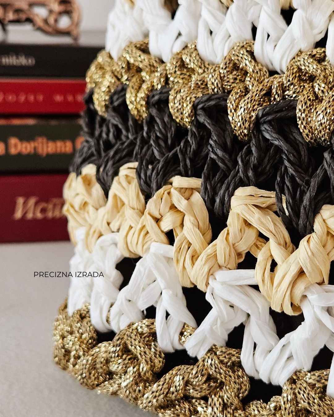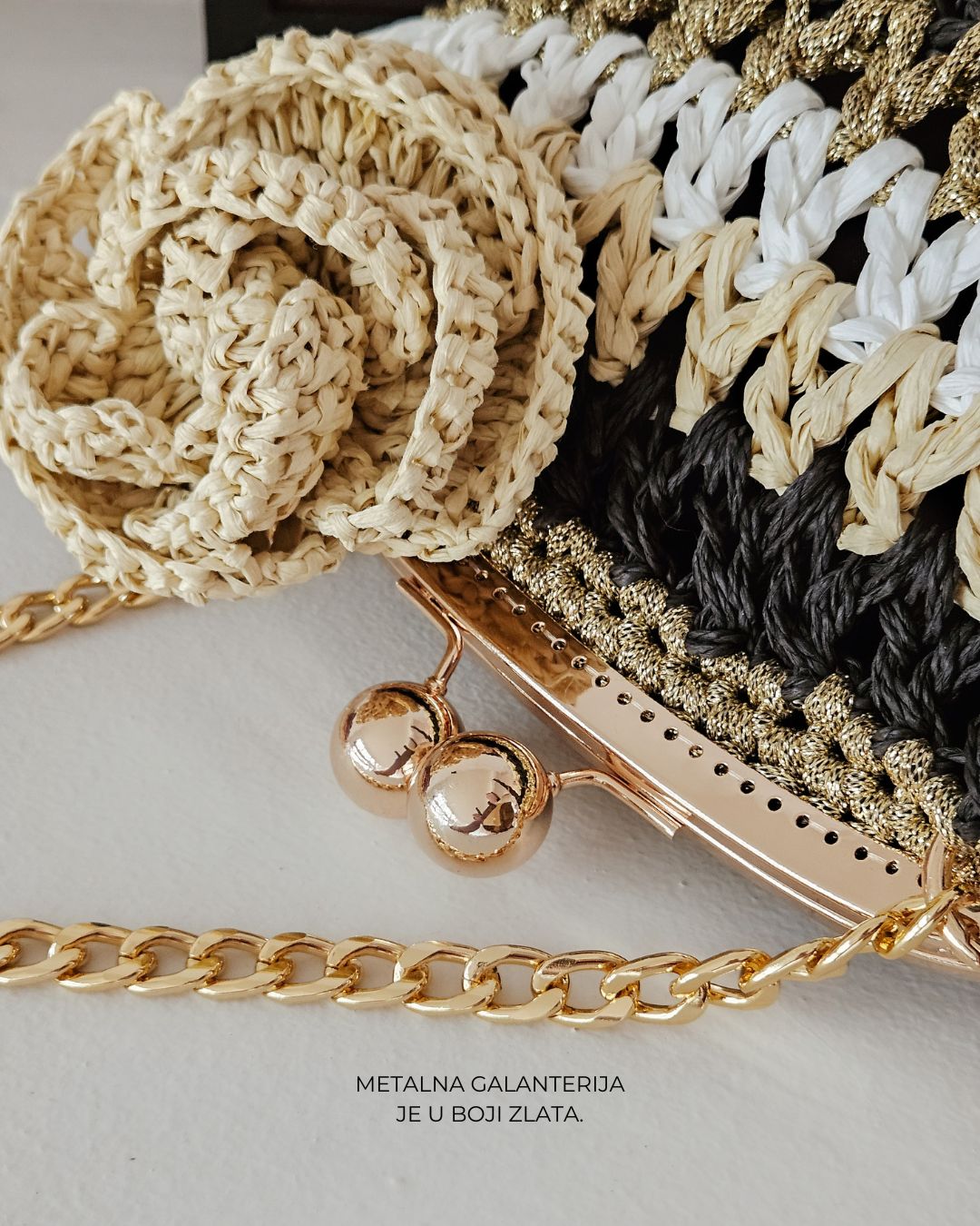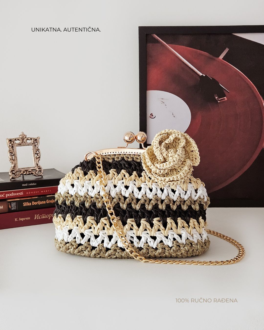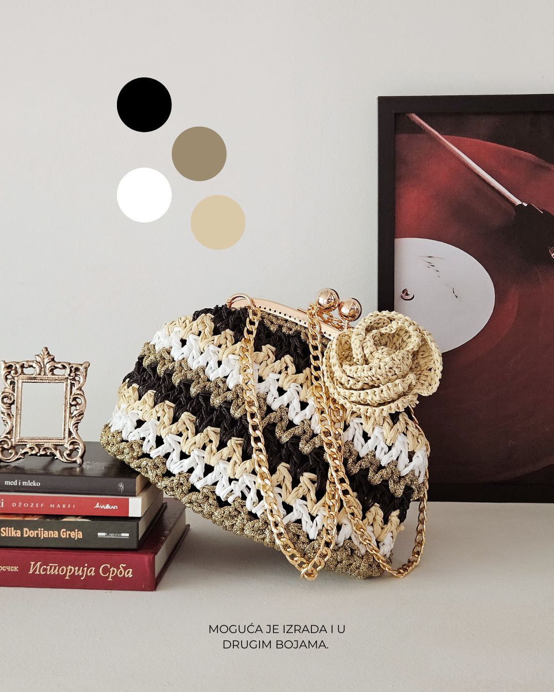 MATERIJAL: Rafija, akrilni konac, metalna galanterija, unutrašnja podstava DIMENZIJE: dužina 30 cm × visina 20 cm × širina 10 cm OPIS: Ručno heklana clutch torba, od 100% prirodne rafije, u crnoj, krem, zlatnoj i beloj boji, sa heklanim cvetom u krem boji. Metalna galanterija je u boji zlata a torba ima unutrašnju pamučnu podstavu, kao i unutrašnje ojačanje, tako da je čvrste forme i neće se deformisati tokom nošenja. Pored toga, ima i lanac pa se može nositi u ruci ili preko ramena . Prostrana, lagana i udobna za nošenje, ova torba može poneti sve ono što vam je svakodnevno potrebno. Dizajn je unikatan.