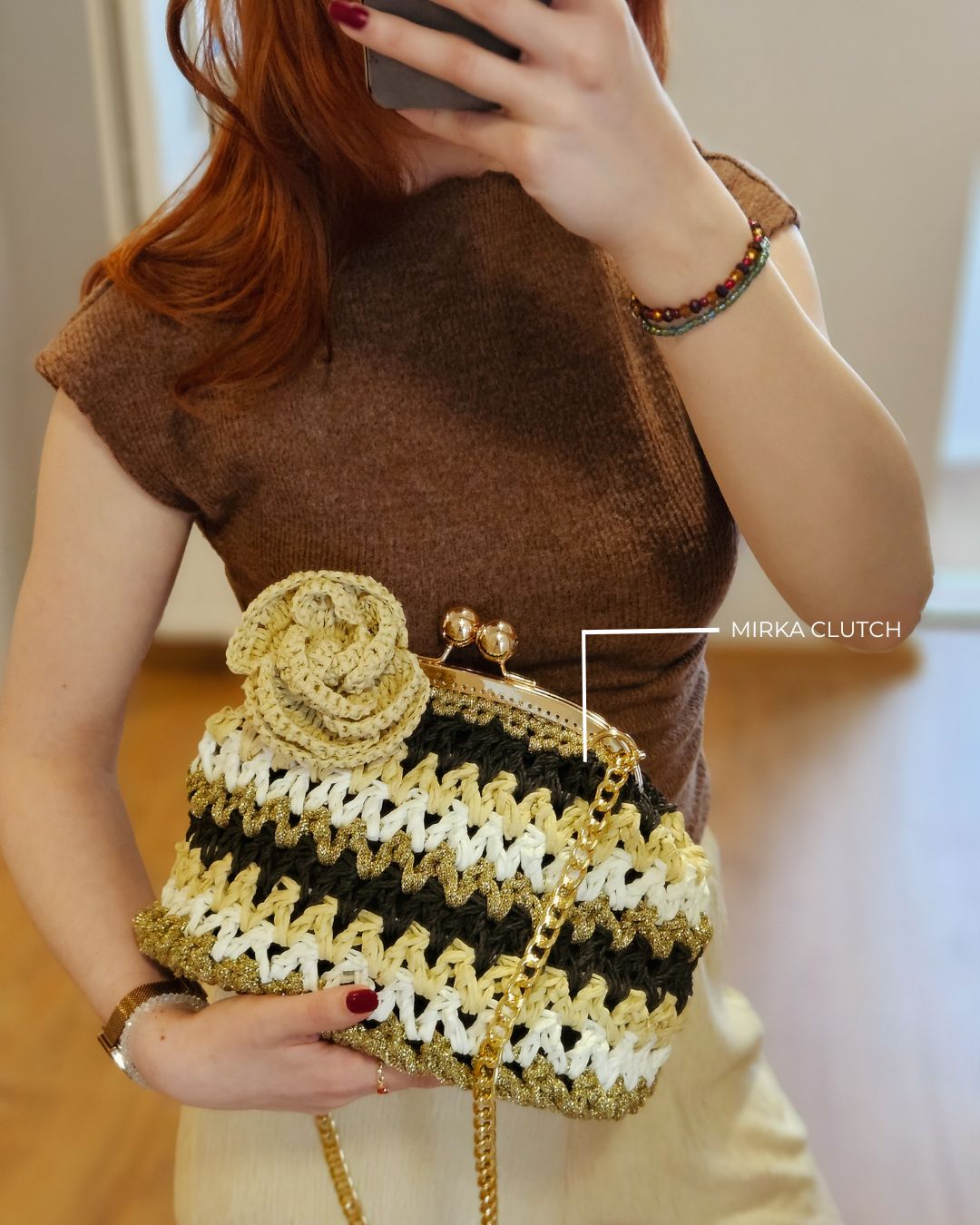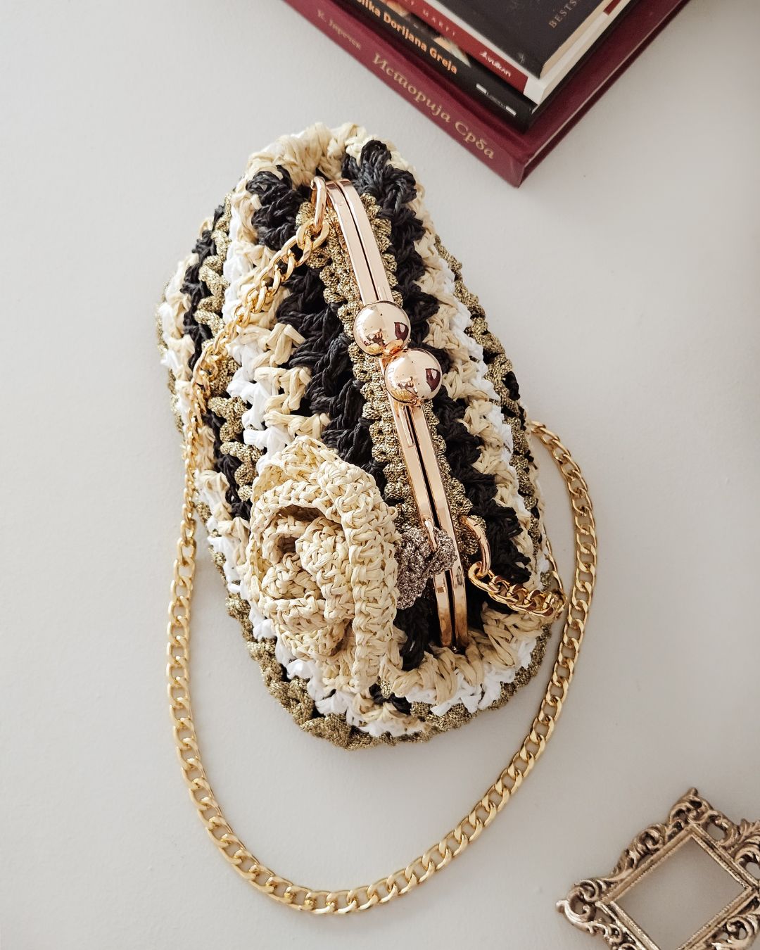 učno heklana clutch torba, od 100% prirodne rafije, u crnoj, krem, zlatnoj i beloj boji, sa heklanim cvetom u krem boji.