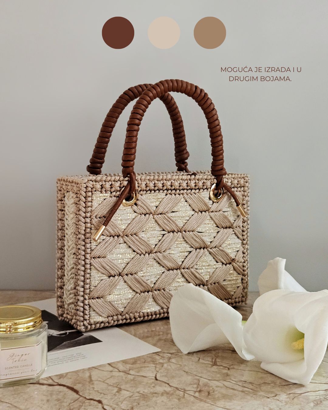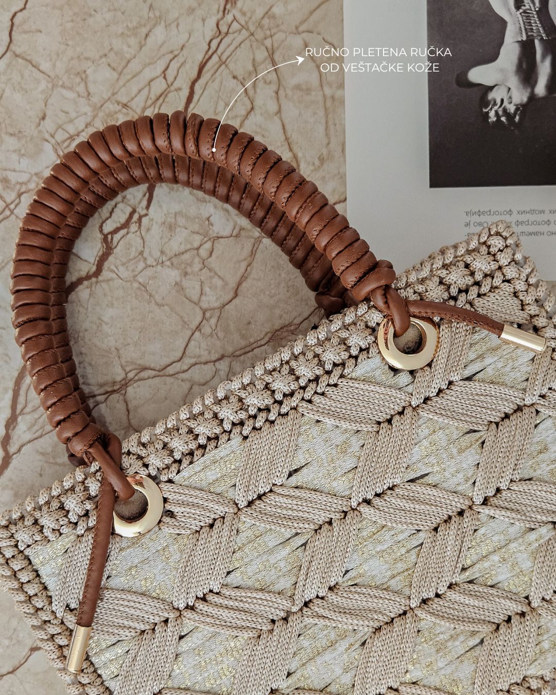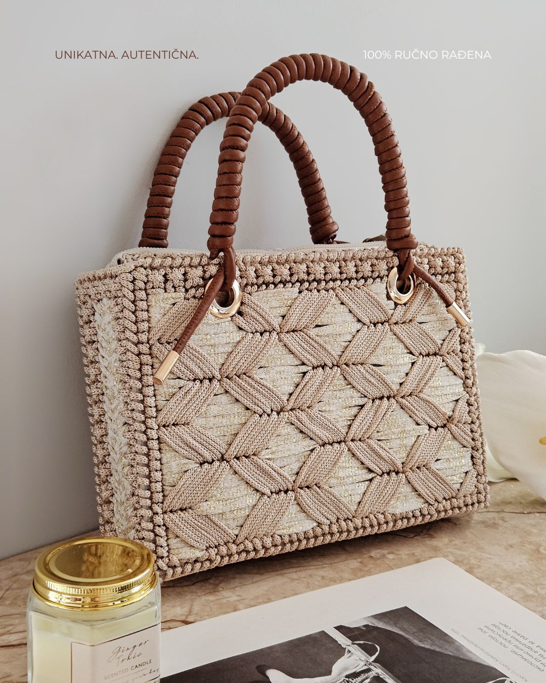 MATERIJAL: Akrilni konac, veštačka koža, metalna galanterija, unutrašnja podstava DIMENZIJE: dužina 25 cm × visina 17,5 cm × širina 5,5 cm OPIS: Ručno rađena torba, od akrilnog konca u dve nijanse krem boje, za zlatnim šimerom i ručkom od veštačke kože. Metalna galanterija je u boji zlata a torba ima unutrašnju pamučnu podstavu, kao i unutrašnje ojačanje, tako da je čvrste forme i neće se deformisati tokom nošenja. Prostrana, lagana i udobna za nošenje, ova torba može poneti sve ono što vam je svakodnevno potrebno. Dizajn je unikatan.