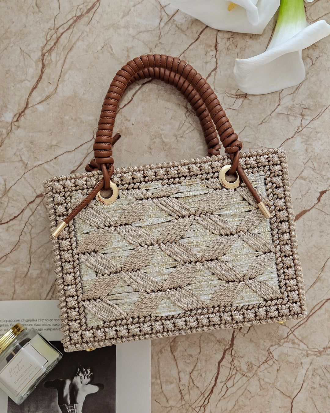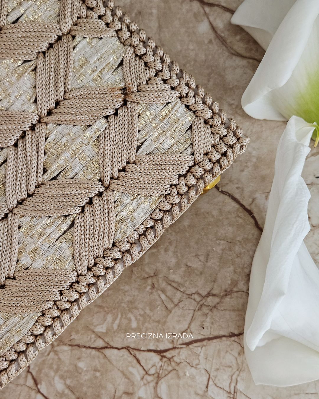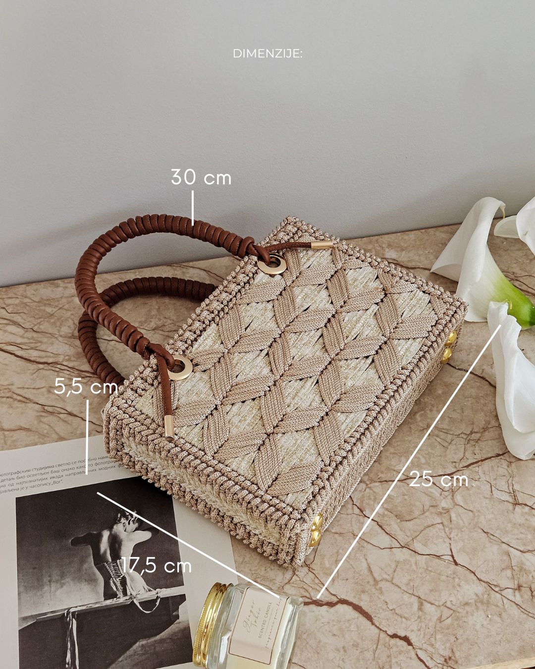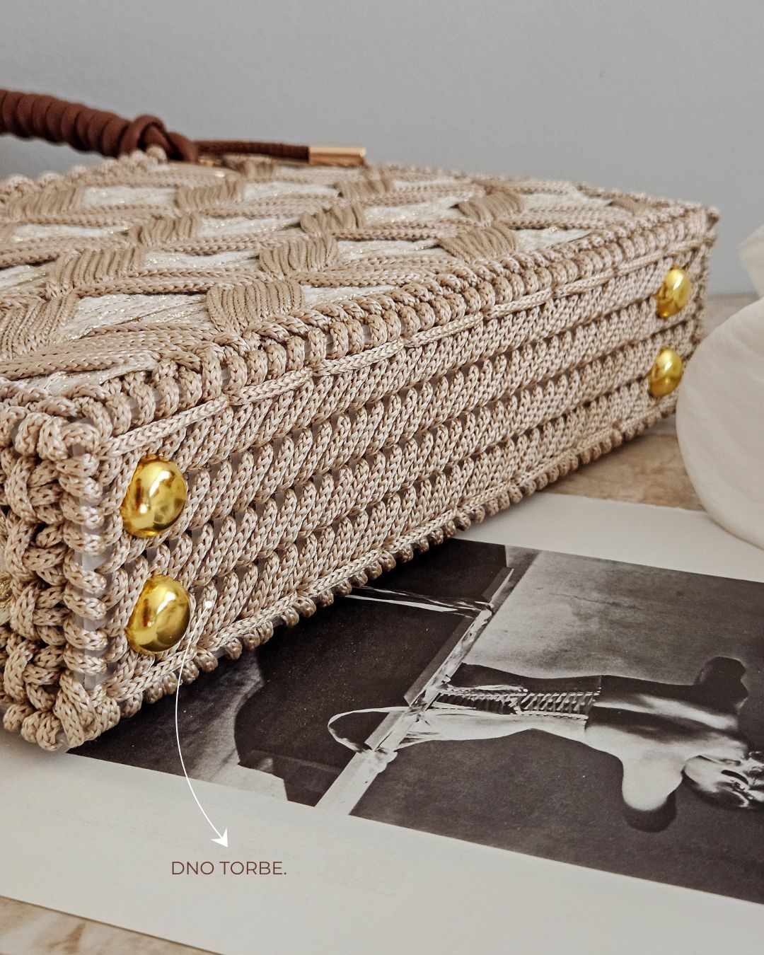 MATERIJAL: Akrilni konac, veštačka koža, metalna galanterija, unutrašnja podstava DIMENZIJE: dužina 25 cm × visina 17,5 cm × širina 5,5 cm OPIS: Ručno rađena torba, od akrilnog konca u dve nijanse krem boje, za zlatnim šimerom i ručkom od veštačke kože. Metalna galanterija je u boji zlata a torba ima unutrašnju pamučnu podstavu, kao i unutrašnje ojačanje, tako da je čvrste forme i neće se deformisati tokom nošenja. Prostrana, lagana i udobna za nošenje, ova torba može poneti sve ono što vam je svakodnevno potrebno. Dizajn je unikatan.