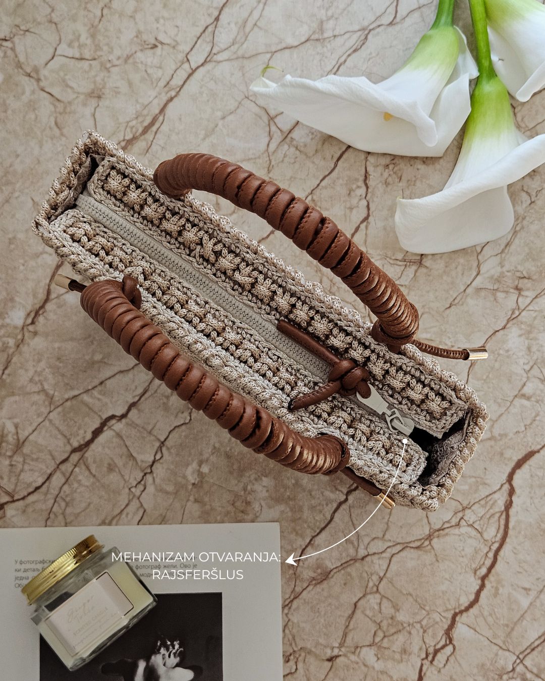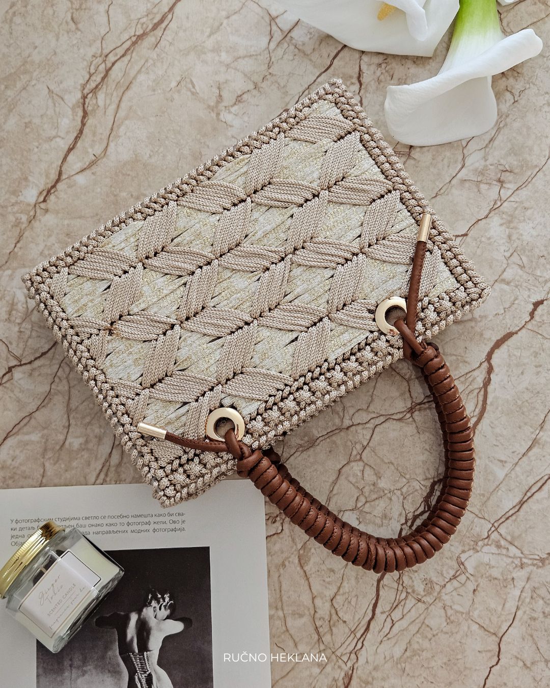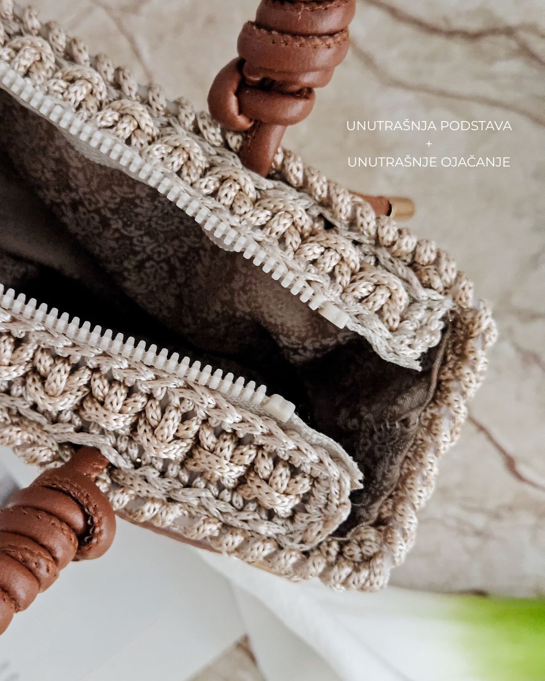 Heklana torba sa ručno rađenom ručkom od veštačke kože.