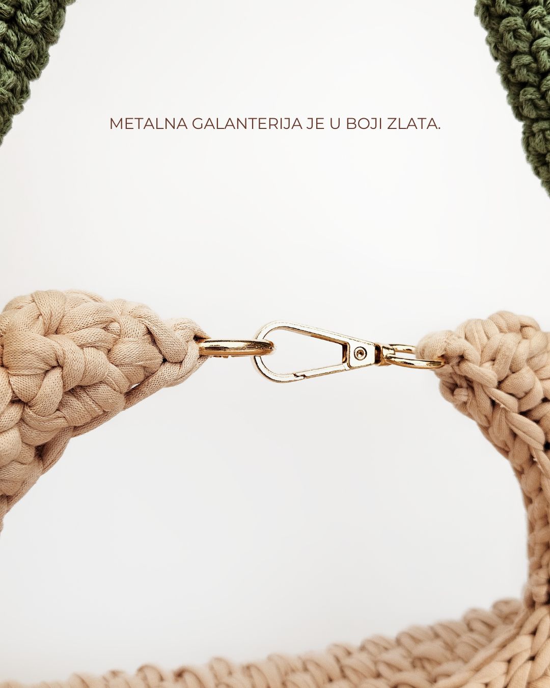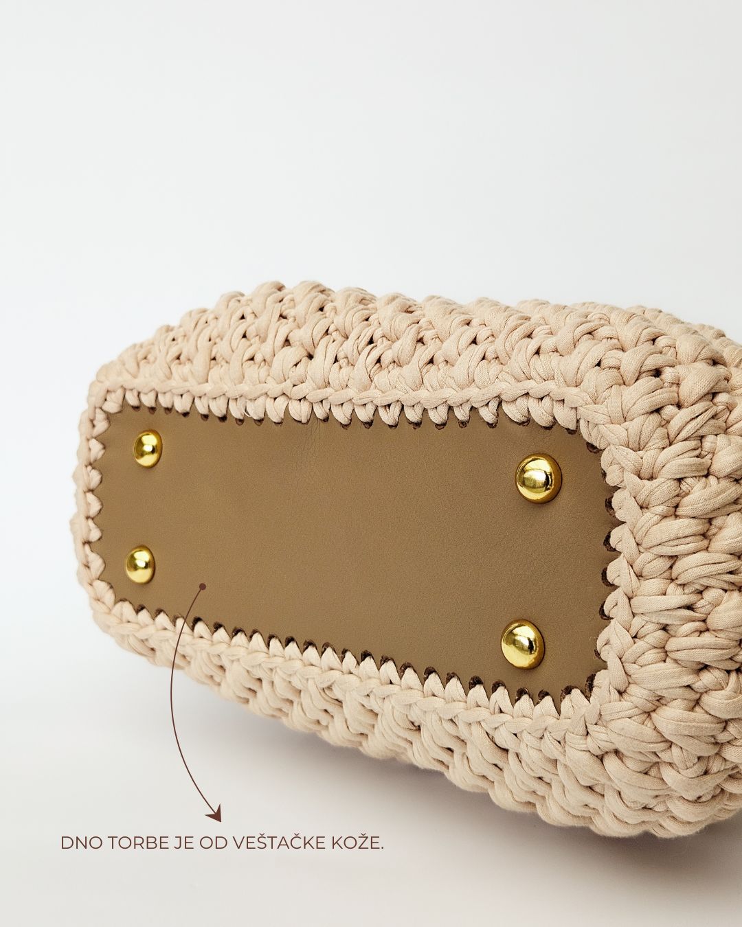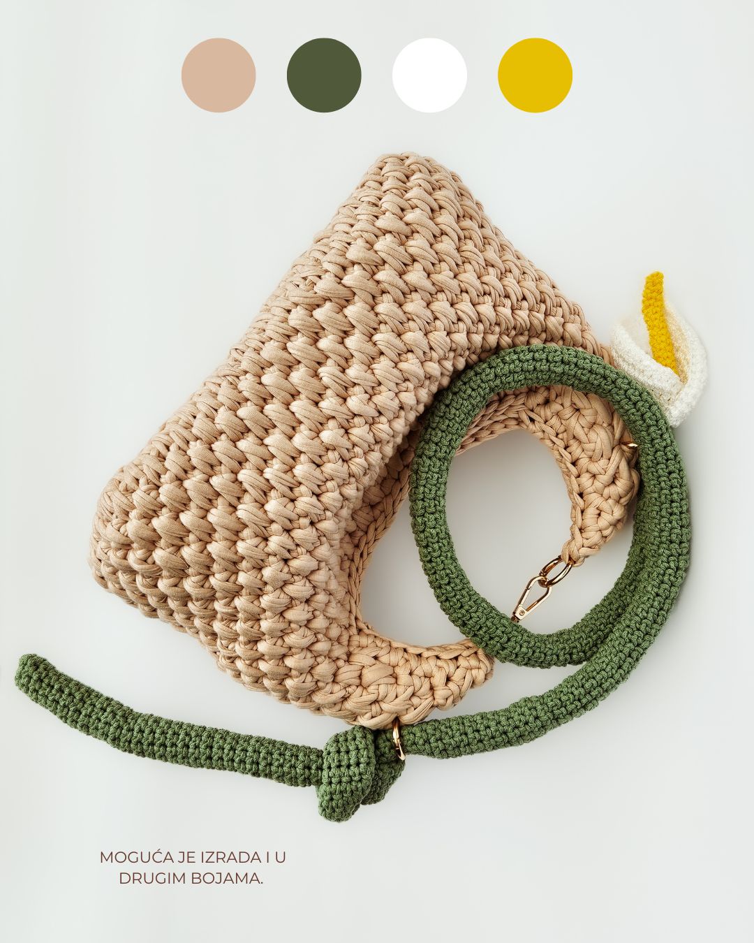 MATERIJAL: Reciklirane pamučne trake, metalna galanterija, unutrašnja podstava DIMENZIJE: dužina 34 cm × visina 25 cm × širina 8 cm × dužina kaiša 85 cm OPIS: Ručno rađena torba, u krem boji, sa heklanim ramenim kaišem u obliku kale. Metalna galanterija je u boji zlata a torba ima unutrašnju pamučnu podstavu, kao i unutrašnje ojačanje, tako da je čvrste forme i neće se deformisati tokom nošenja. Prostrana, lagana i udobna za nošenje, ova torba može poneti sve ono što vam je svakodnevno potrebno. Dizajn je unikatan.