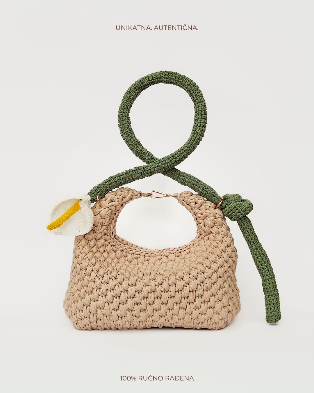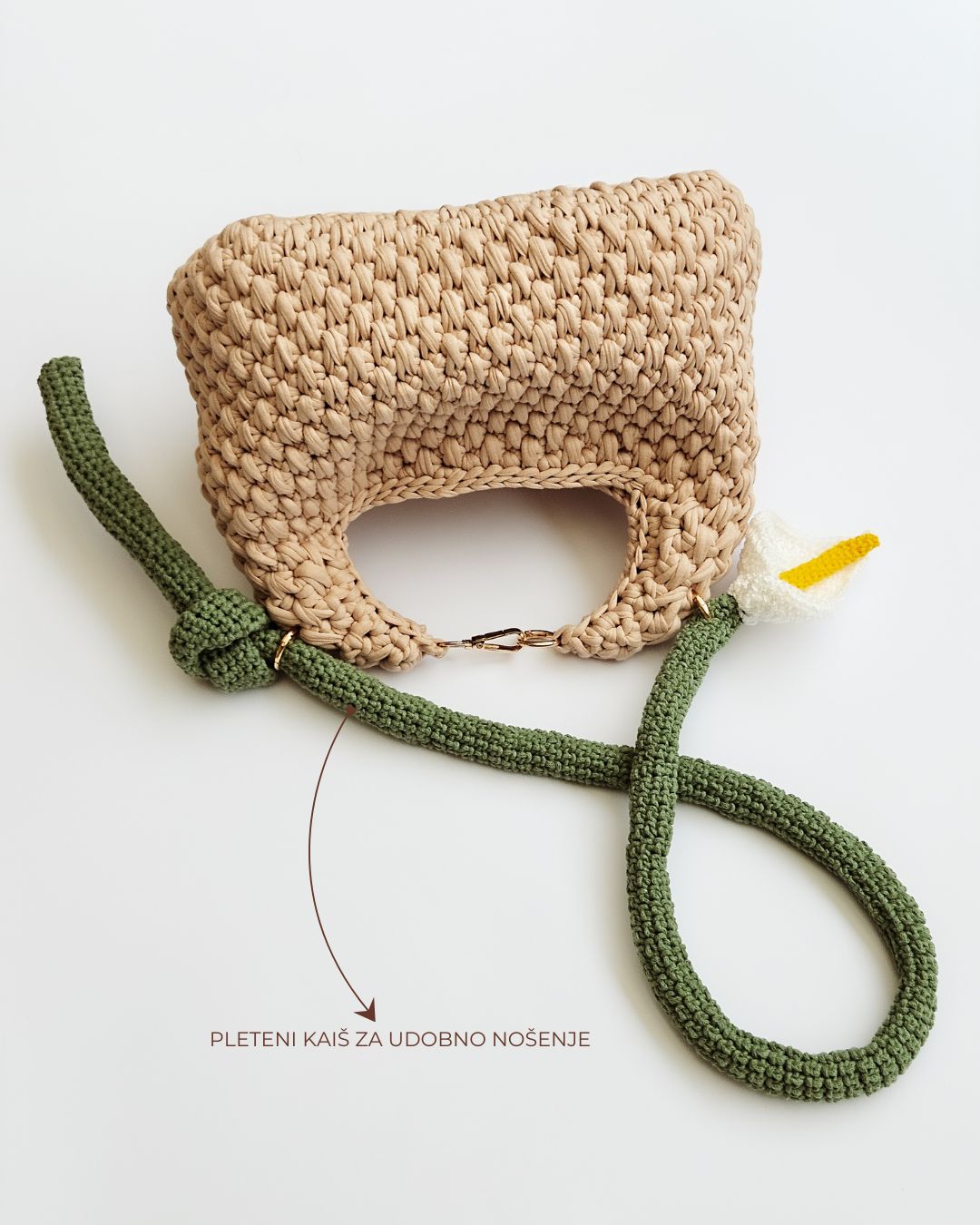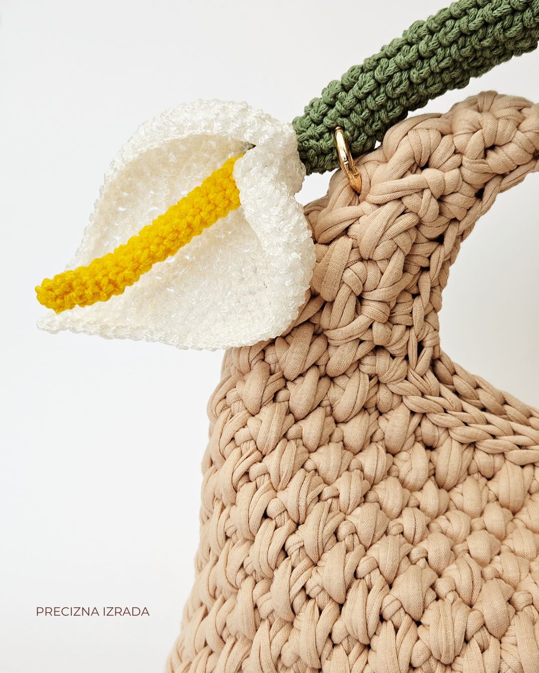 Heklana torba od recikliranih pamučnih traka, sa ručkom u obliku cveta kale.
