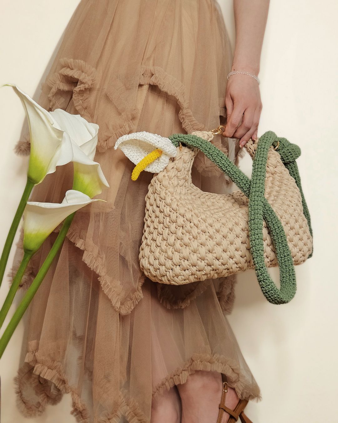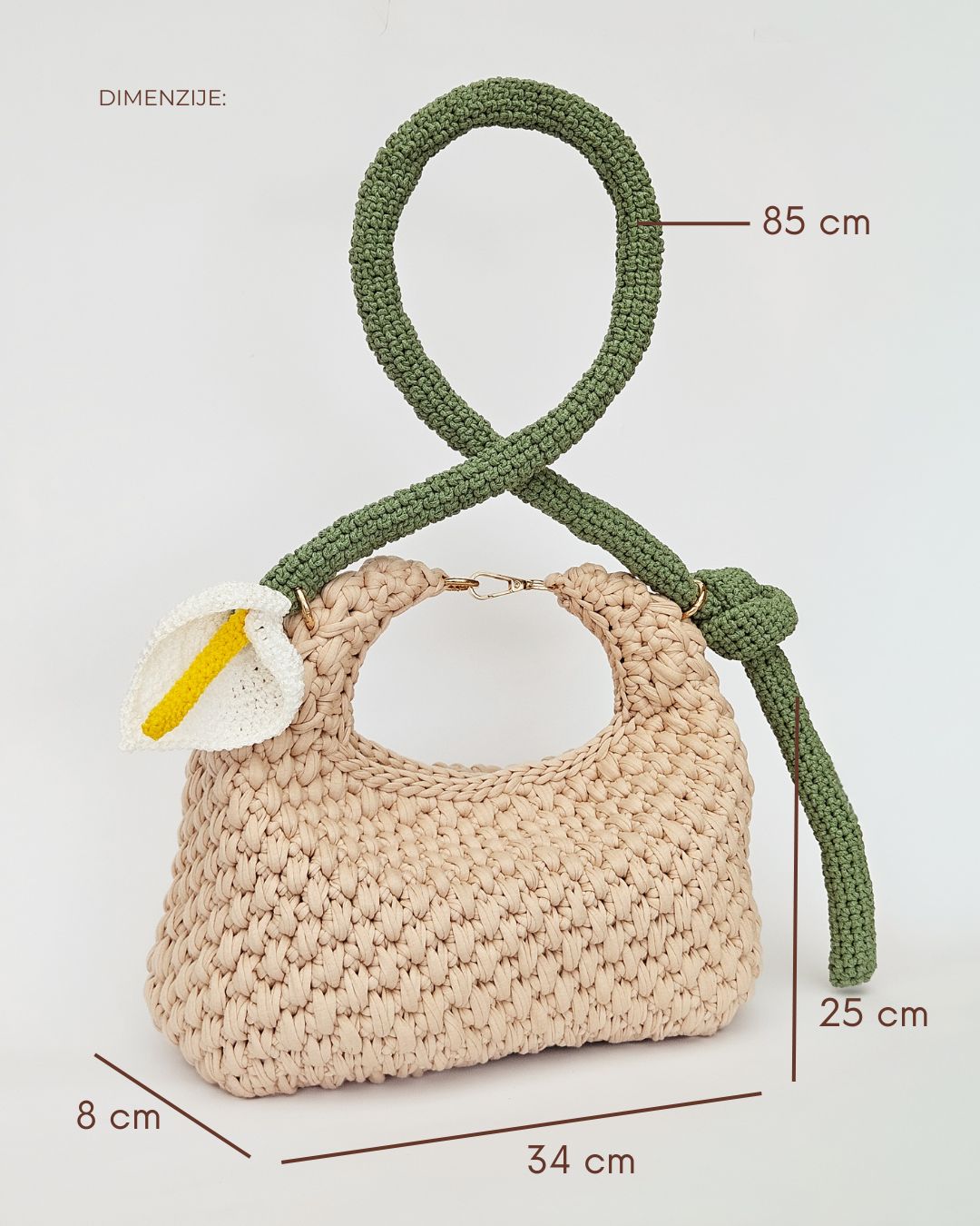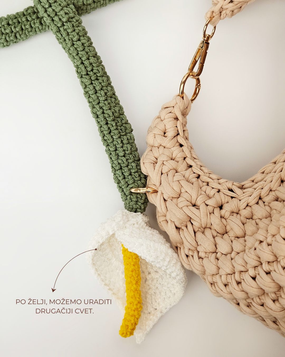 Heklana torba od recikliranih pamučnih traka, sa ručkom u obliku cveta kale.