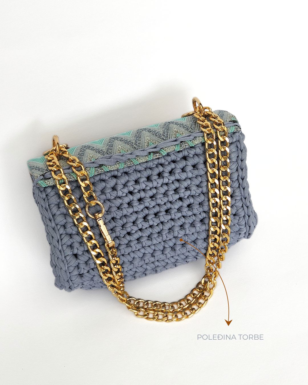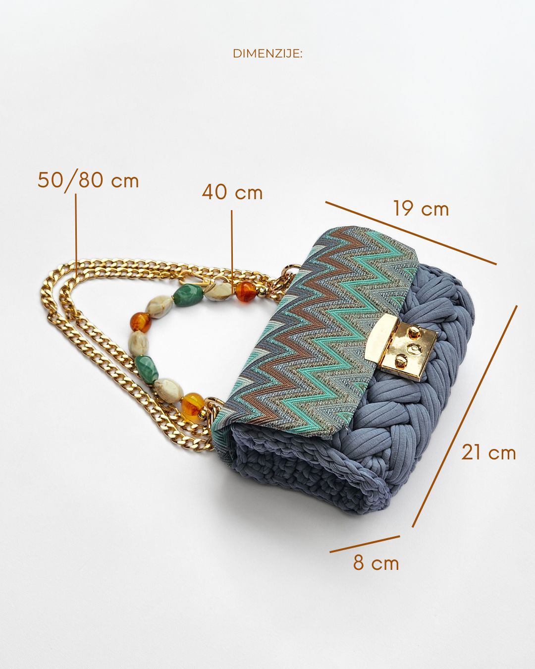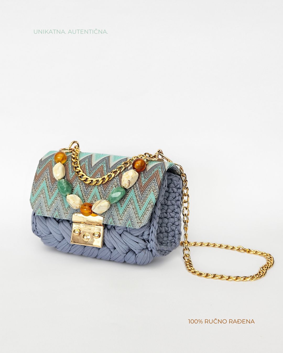 MATERIJAL: Reciklirane pamučne trake, visoko-kvalitetni štof, metalna galanterija, unutrašnja podstava DIMENZIJE: dužina 21 cm × visina 19 cm × širina 8 cm × dužina ručke 40 cm × dužina lanca 50/80 cm OPIS: Ručno rađena torba, u plavoj boji, sa poklopcem od visoko-kvalitetnog čvrstog štofa, sa ručkom od akrilnih perli i lanca, u boji zlata. Torba se može nositi u ruci, na ramenu ili preko tela. Metalna galanterija je u boji zlata a torba ima unutrašnju pamučnu podstavu, kao i unutrašnje ojačanje, tako da je čvrste forme i neće se deformisati tokom nošenja. Prostrana, lagana i udobna za nošenje, ova torba može poneti sve ono što vam je svakodnevno potrebno. Dizajn je unikatan.