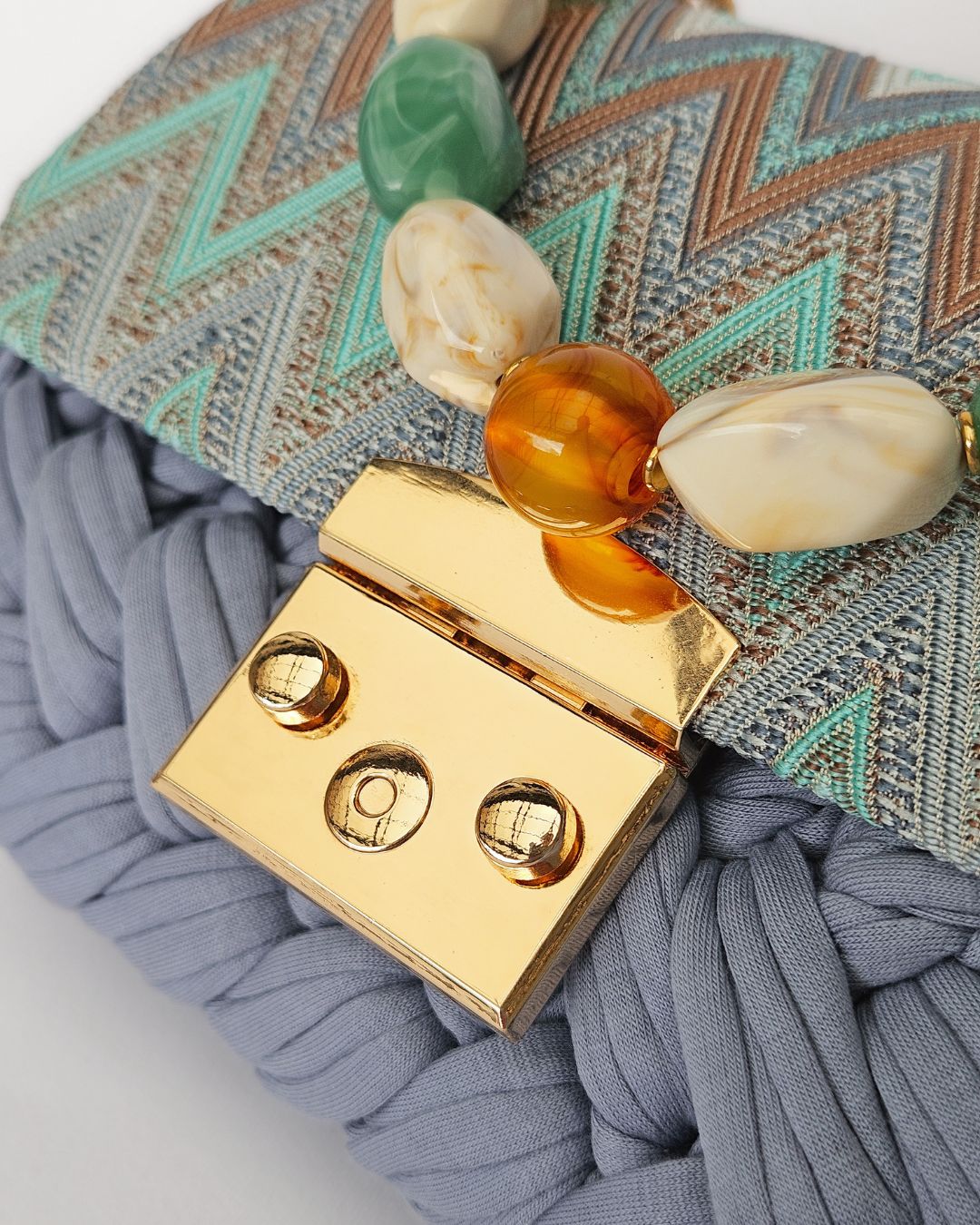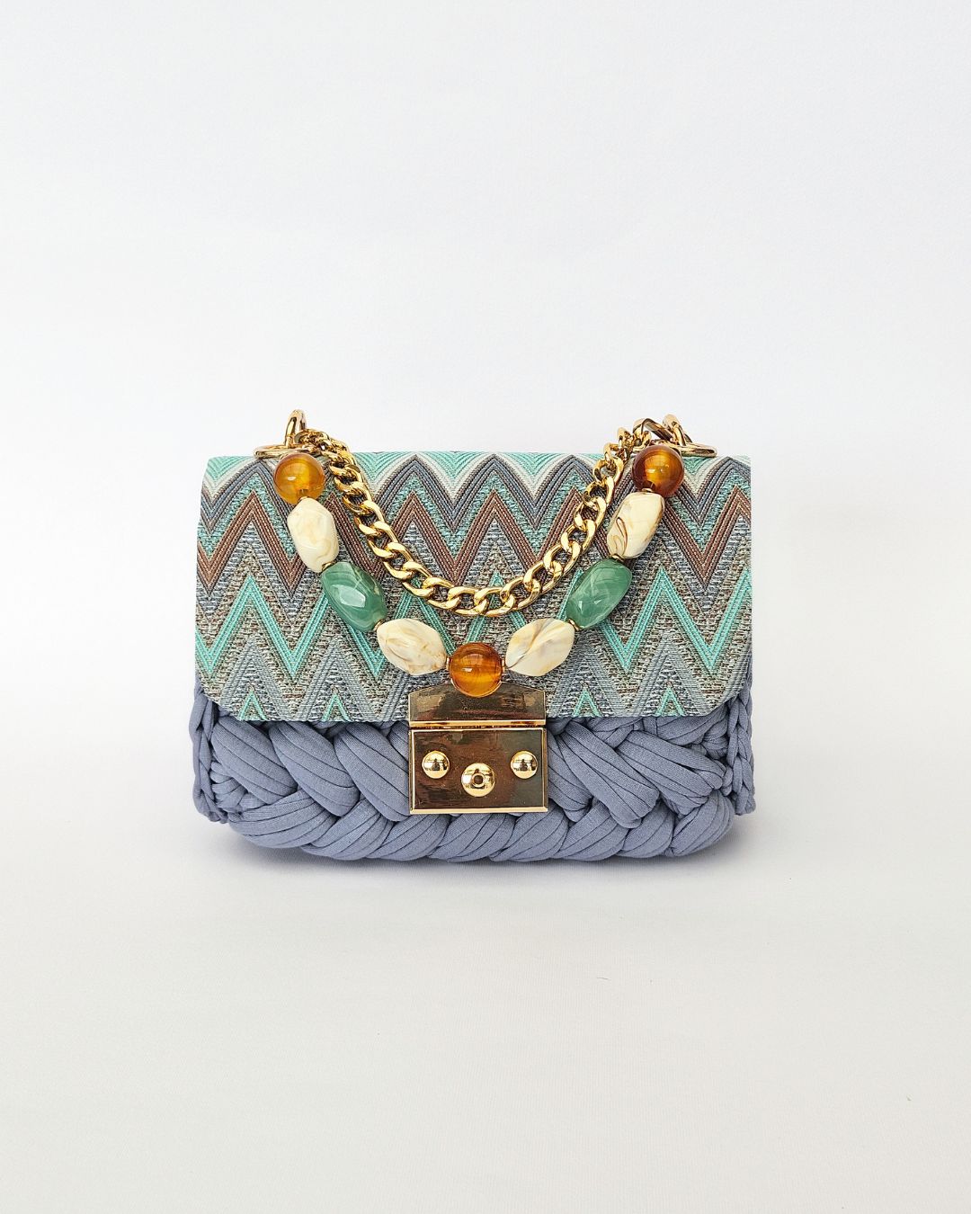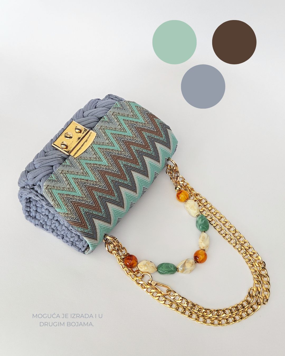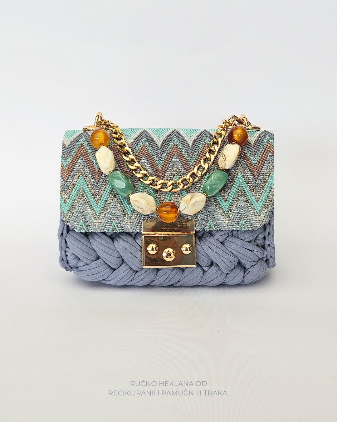 MATERIJAL: Reciklirane pamučne trake, visoko-kvalitetni štof, metalna galanterija, unutrašnja podstava DIMENZIJE: dužina 21 cm × visina 19 cm × širina 8 cm × dužina ručke 40 cm × dužina lanca 50/80 cm OPIS: Ručno rađena torba, u plavoj boji, sa poklopcem od visoko-kvalitetnog čvrstog štofa, sa ručkom od akrilnih perli i lanca, u boji zlata. Torba se može nositi u ruci, na ramenu ili preko tela. Metalna galanterija je u boji zlata a torba ima unutrašnju pamučnu podstavu, kao i unutrašnje ojačanje, tako da je čvrste forme i neće se deformisati tokom nošenja. Prostrana, lagana i udobna za nošenje, ova torba može poneti sve ono što vam je svakodnevno potrebno. Dizajn je unikatan.