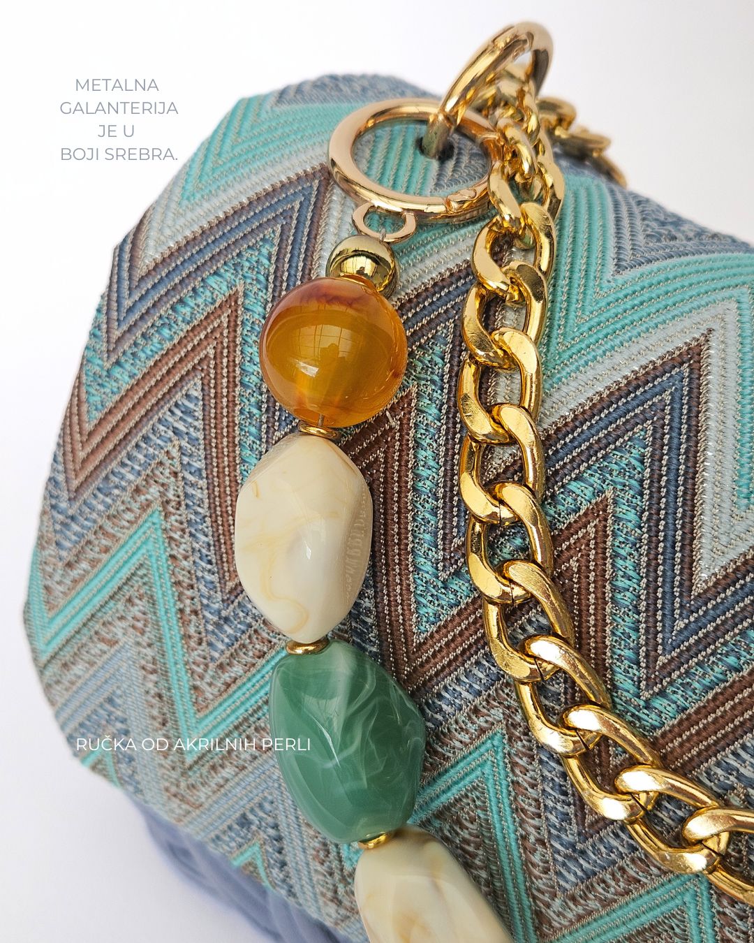 Ručno rađena torba, u plavoj boji, sa poklopcem od visoko-kvalitetnog čvrstog štofa, sa ručkom od akrilnih perli i lanca, u boji zlata.