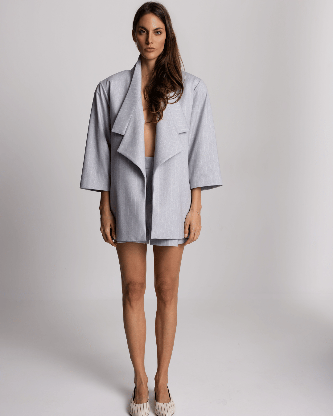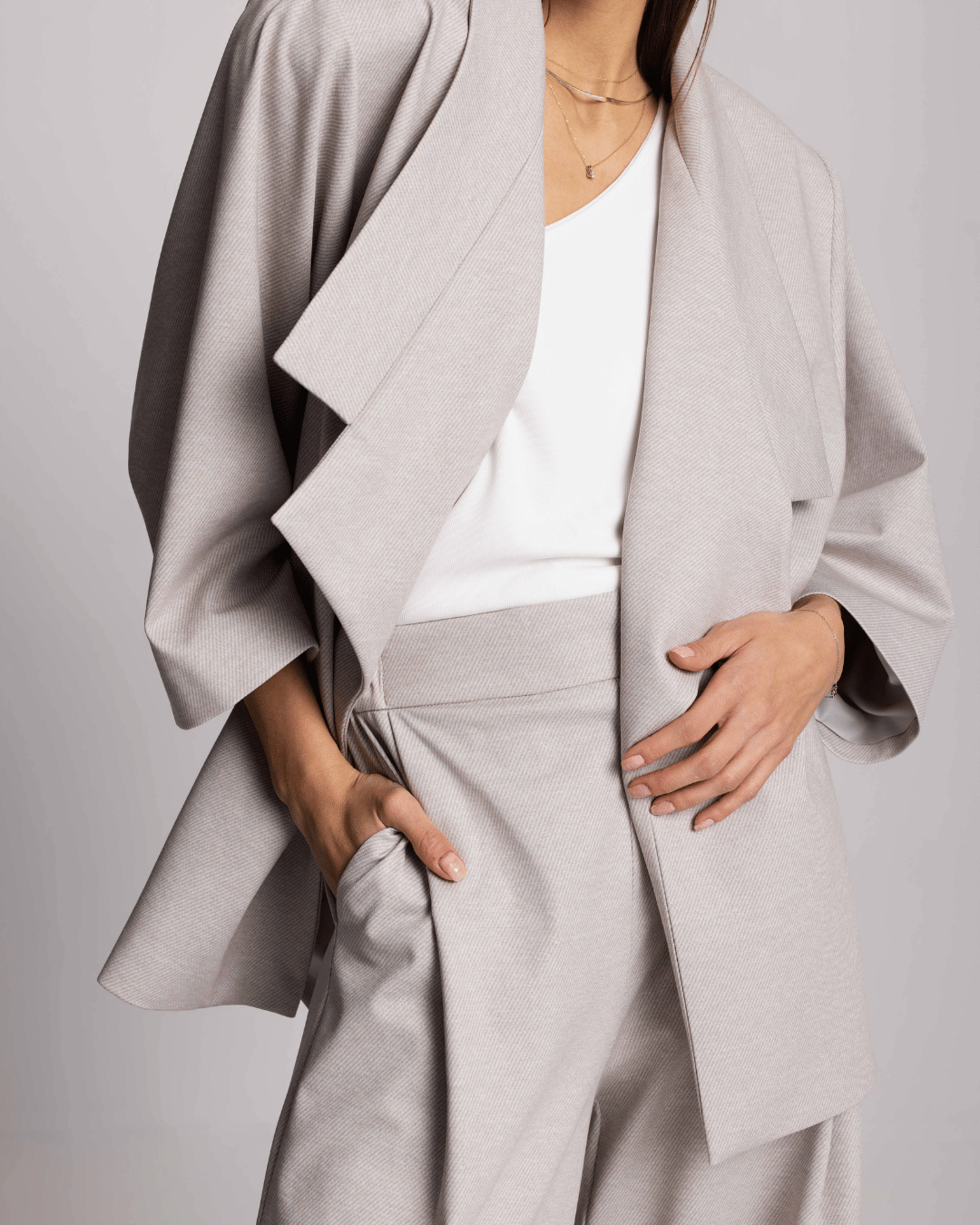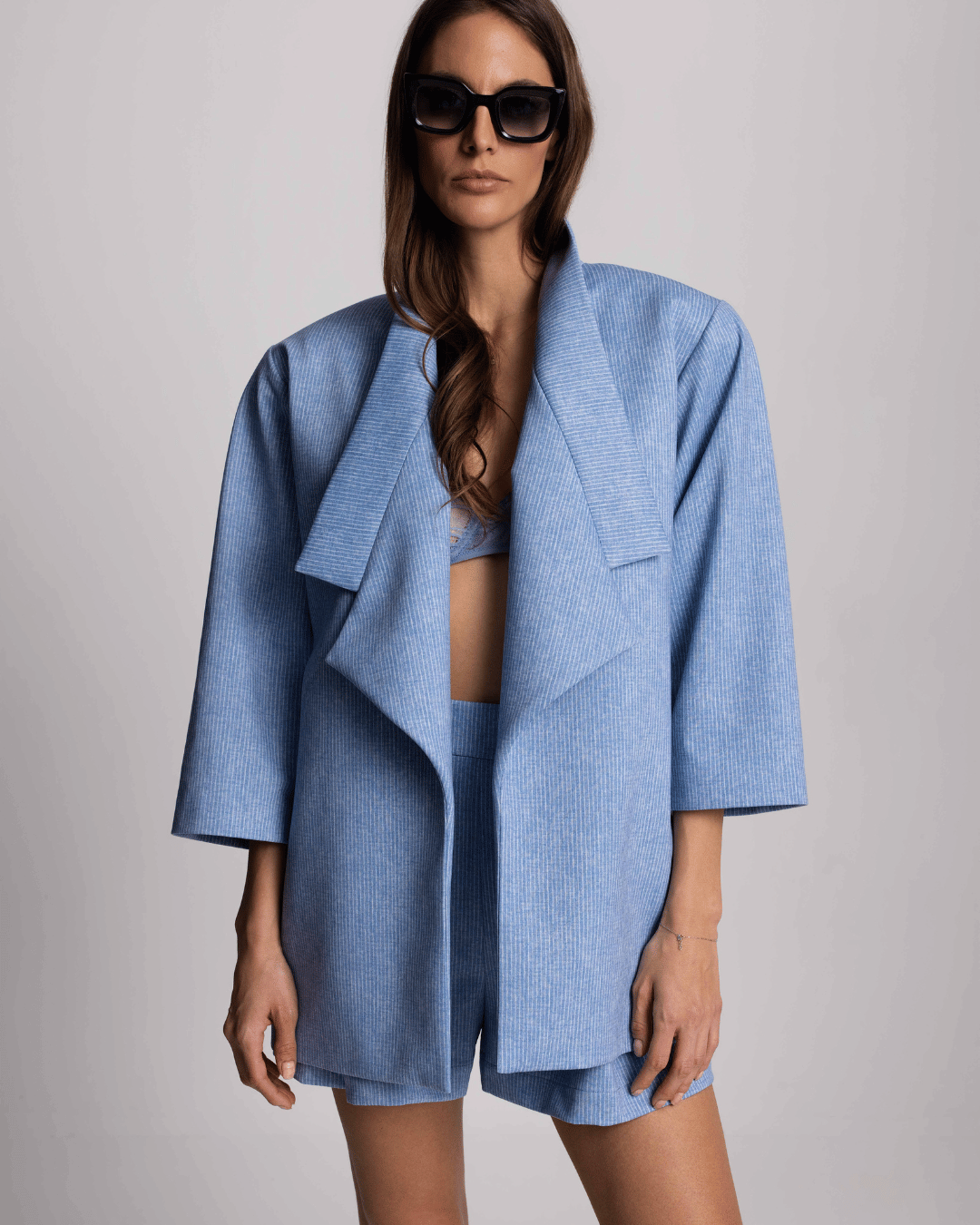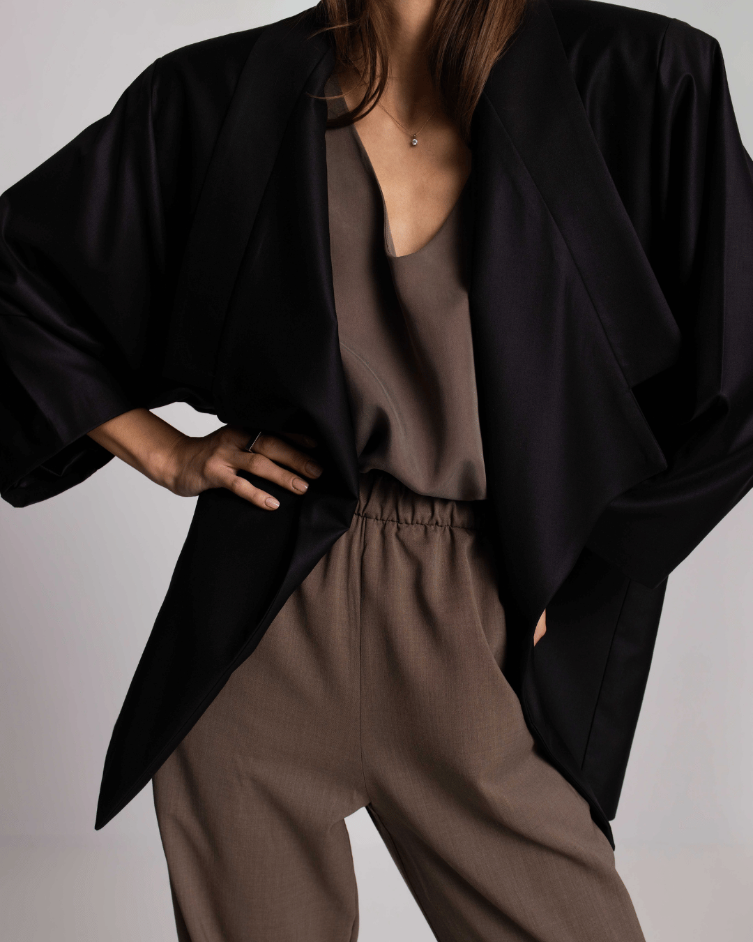 Elegantna ženska jakna u dostupna u pet boja, lagane strukture i opuštene siluete, izrađena od mešavine sirove svile i viskoze, idealna za dnevne i večernje kombinacije.