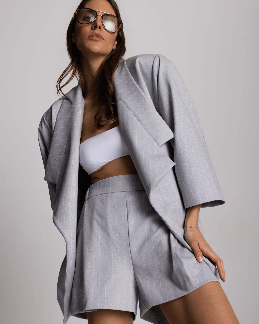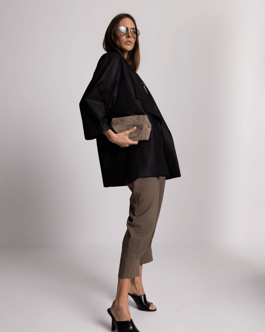 Materijal: 40% sirova svila, 60% viskoza Ikona jakna Black brenda People Like Us je lagana ženska jakna sa fluidnim padom i prepoznatljivim reverima, osmišljena za prilike kada želiš da izgledaš sređeno, ali bez previše truda. Izrađena je od mešavine sirove svile i viskoze, prijatna je za nošenje i lepo funkcioniše kao elegantan gornji sloj uz pantalone, haljine ili komplet u istom tonu. Može se nositi otvorena za opušteniji izgled ili strukirana kaišem za ženstveniju siluetu Napomena: Jakna IKONA sive boje na sebi ima bele štrafte.
