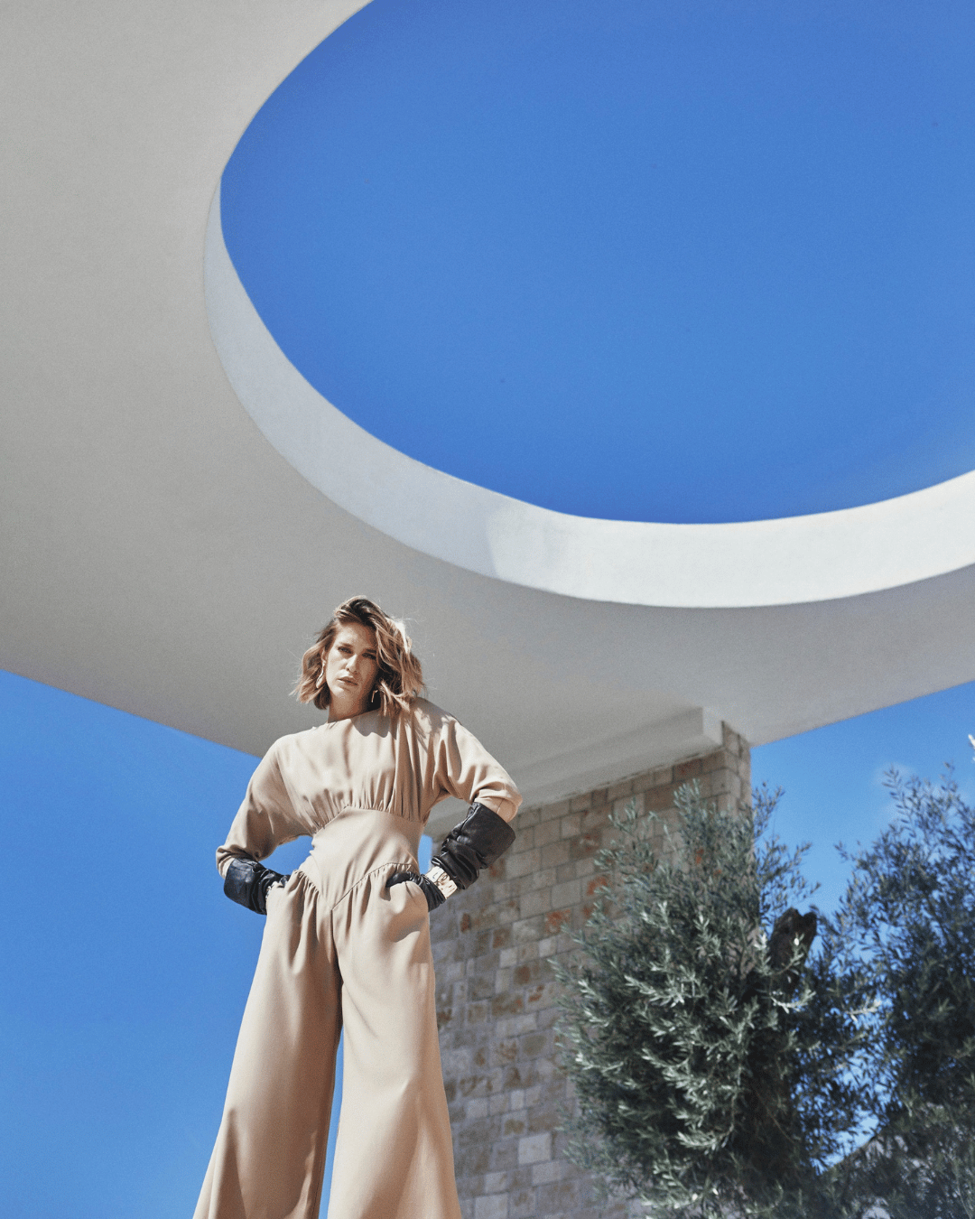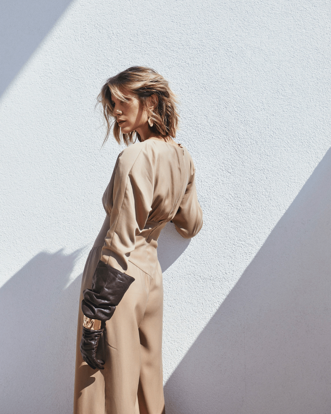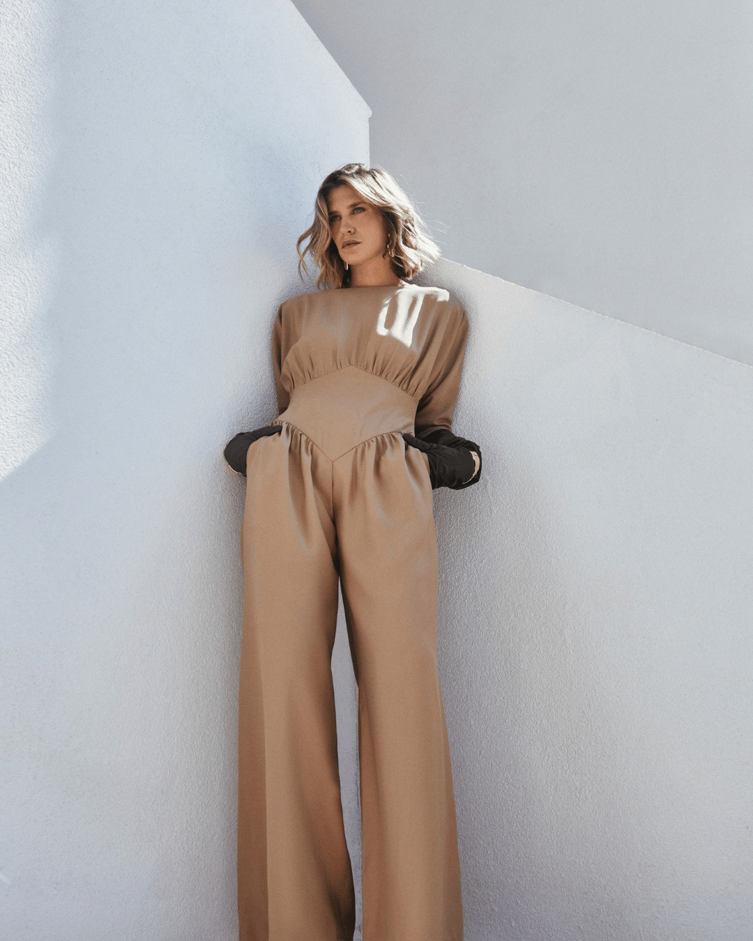 Kombinezon u toploj kamel nijansi izrađen ot prijatnog tencela, ističe ramena i stvara volumen u gornjem delu, dok se struk sužava integrisanim pojasom, naglašavajući ženstvenu siluetu. Nogavice se šire, pružajući slobodu pokreta i elegantan, produženi efekat figure.