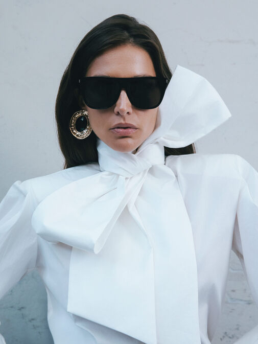 Predimenzionirana košulja sa naglašenim ramenima i trakom za vezivanje oko vrata.