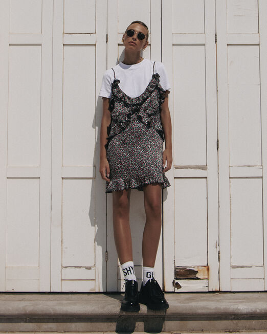 Mini haljina sa cvetnim dezenom od meke svile sa V izrezom i volanima.