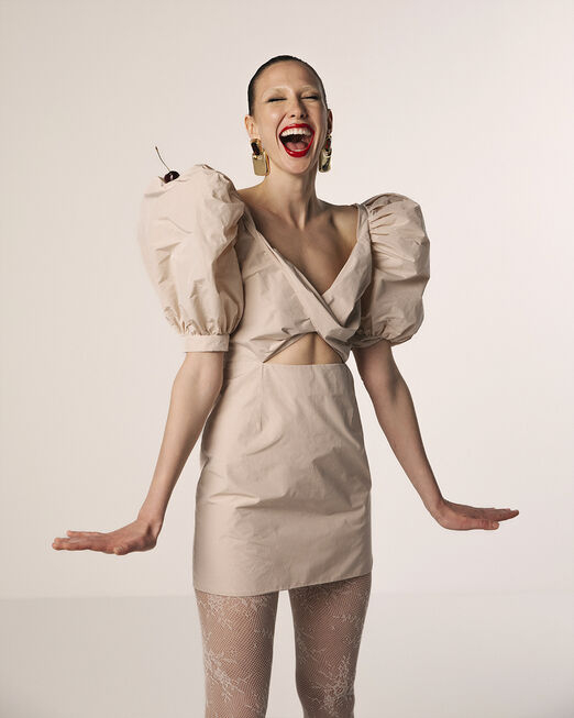 Pamučna mini haljina sa V izrezom i uvrnutim čvorom napred. Kratki puf rukavi sa manžetnama i ženstven kroj.
