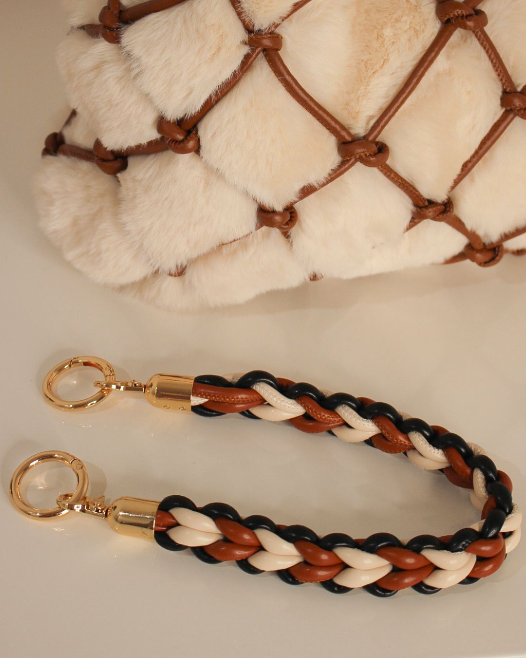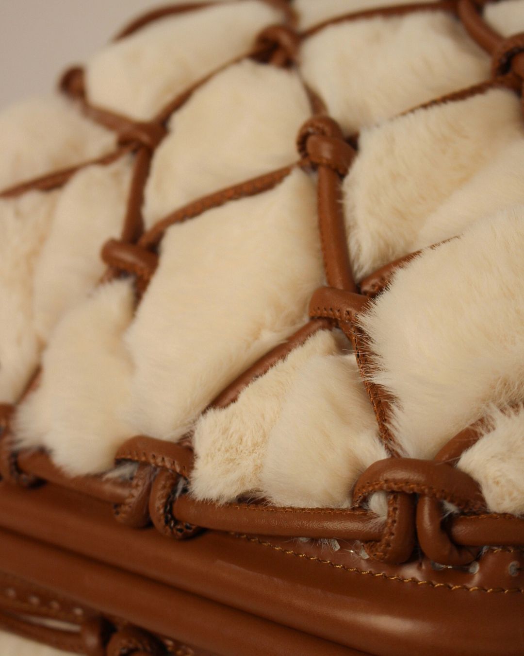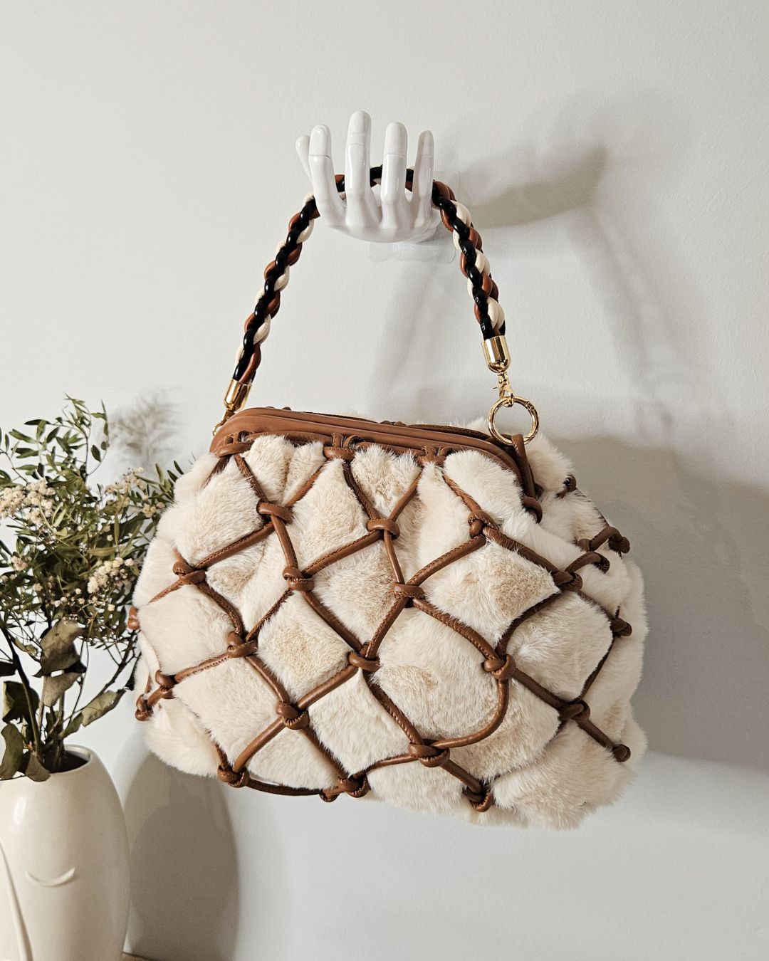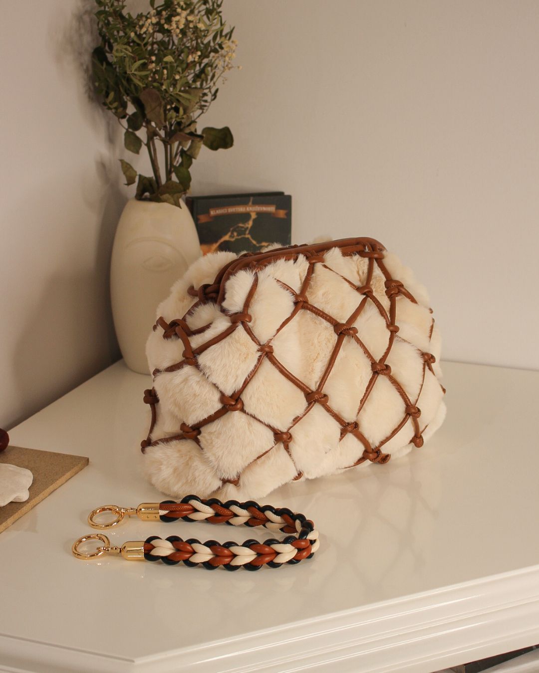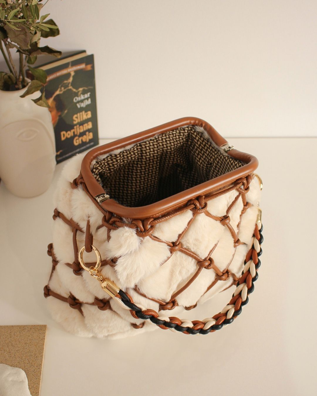 Torba od krzna, off white boje, sa biglom od veštačke kože, macrame mrežom i ručkom od veštačke kože.