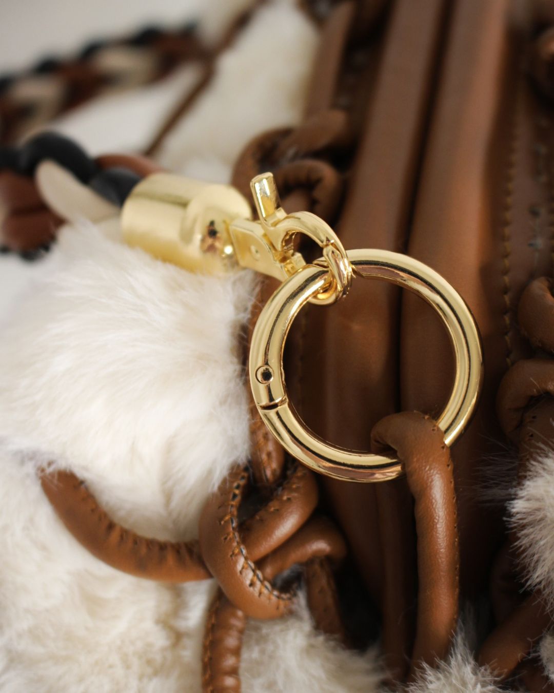 MATERIJAL: Veštačko krzno, bigl od veštačke kože, trake od veštačke kože, pamučna podstava DIMENZIJE: dužina 40 cm × visina 27 cm × širina 11 cm × dužina ručke 50 cm OPIS: Torba je ručno rađena od izuzetno kvalitetne imitacije krzna, u off white boji. Veštačko krzno je jako mekano, prijatno na dodir, ne linja se i ne ostavlja tragove po garderobi. Torba poseduje ručku od veštačke kože, kao i macrame mrežu od kožnih traka. Torbu možete nositi u ruci ili preko ramena. Ima unutrašnju podstavu, kao i unutrašnje ojačanje, tako da se neće deformisati tokom nošenja. Mehanizam otvaranja je bigl, od veštačke kože. Vrlo je prostrana i lagana, pa je idealna za svakodnevno nošenje. Dizajn je unikatan.