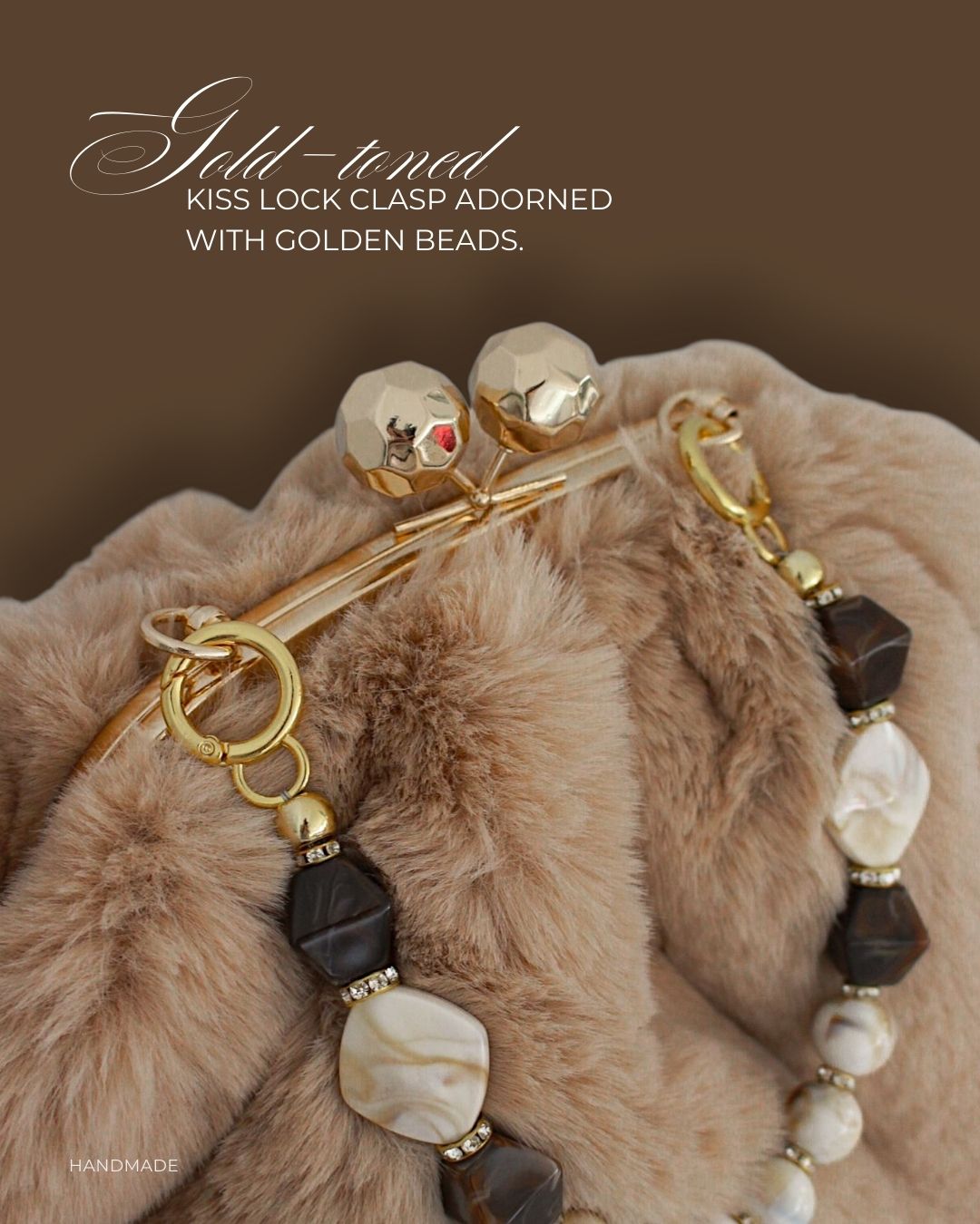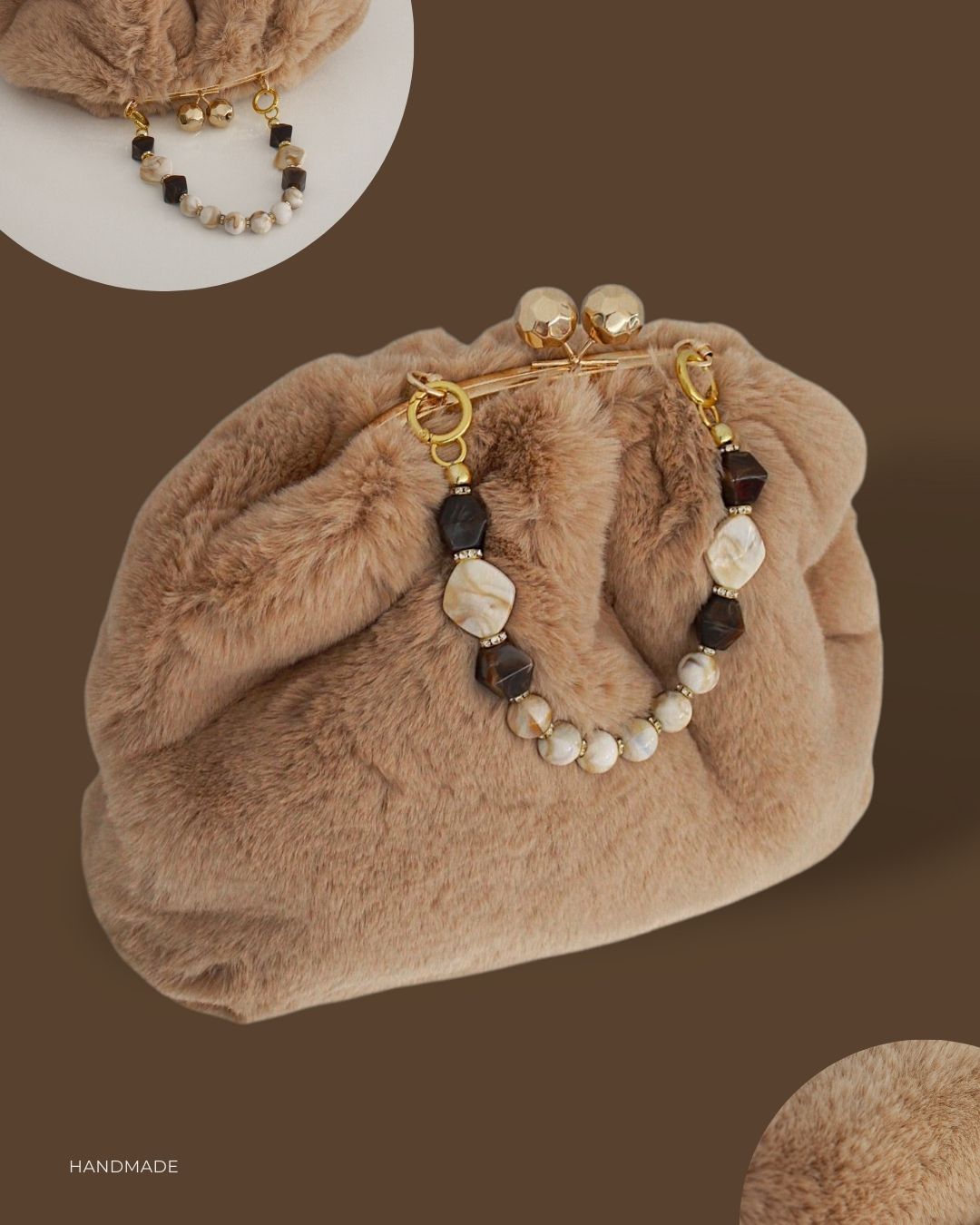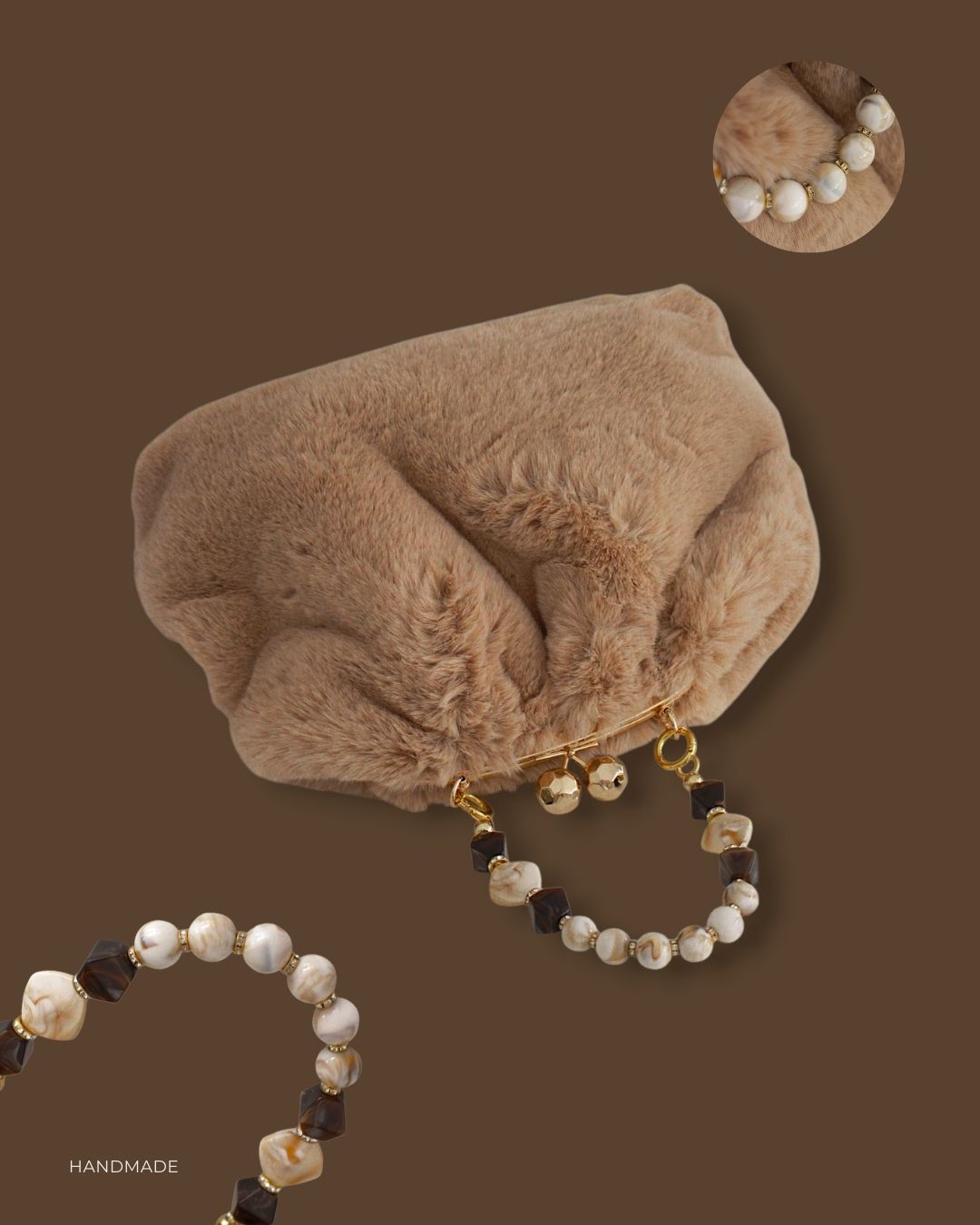 Torba od krzna, kapućino boje, sa elegantnim metalnim biglom u boji zlata i ručkom od bisernih perli.