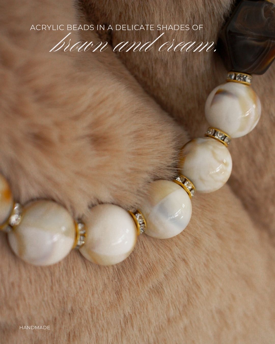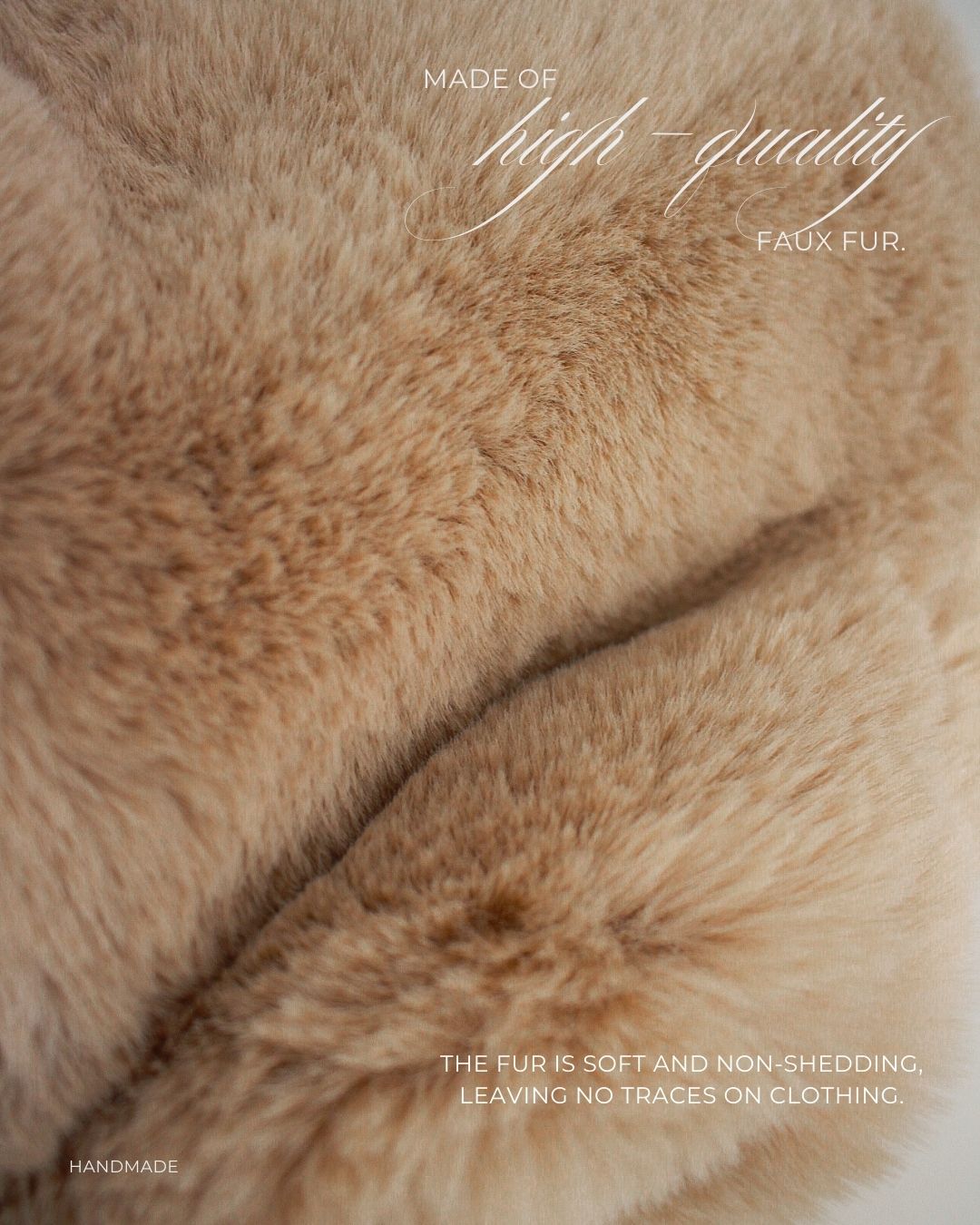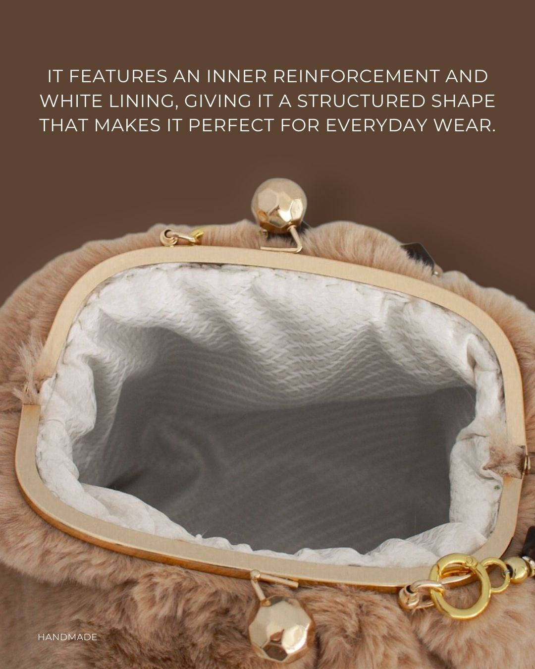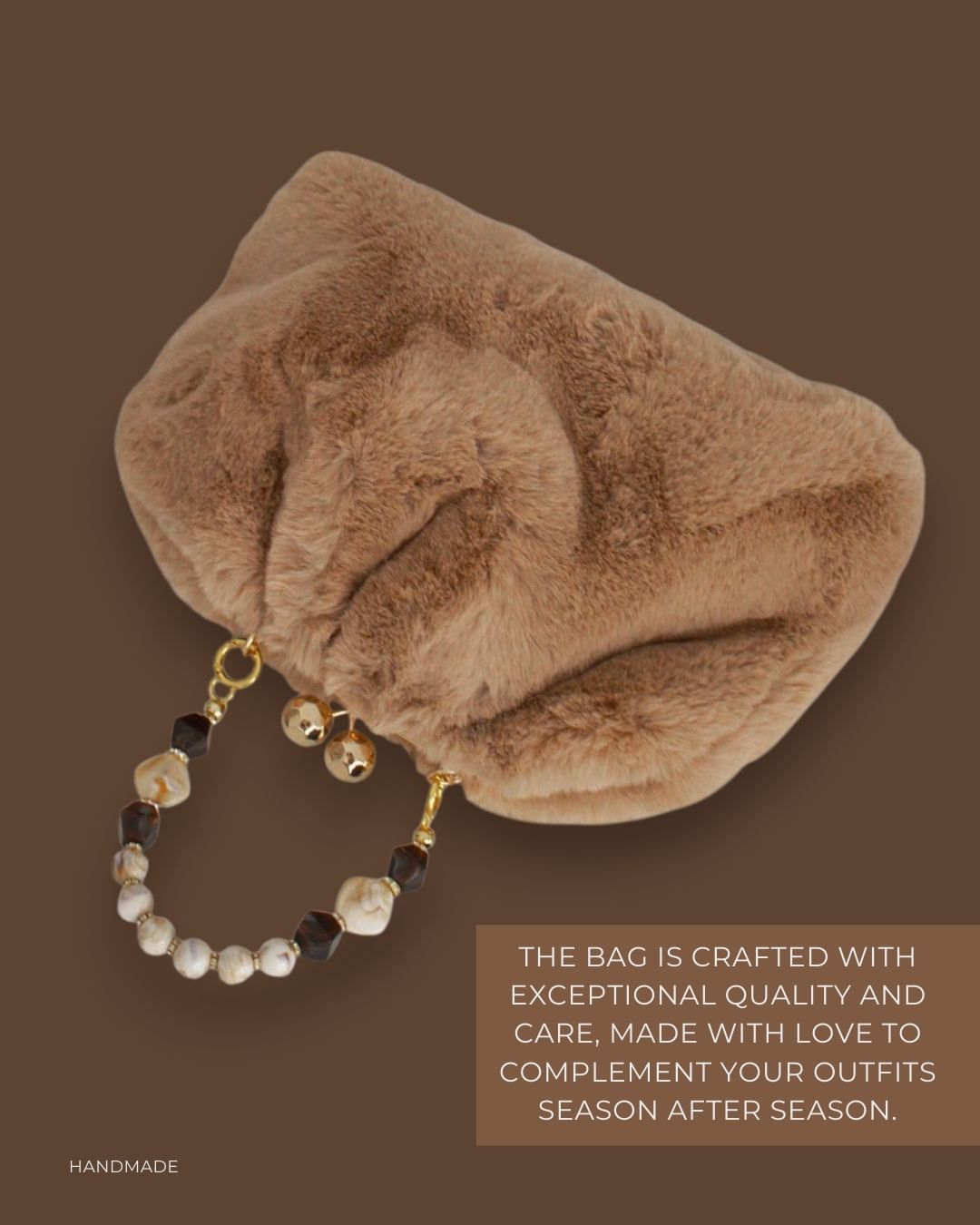 MATERIJAL: Veštačko krzno, metalni bigl, biserne perle, satenska podstava, unutrašnje ojačanje DIMENZIJE: dužina 38 cm × visina 30 cm × širina 10 cm × dužina ručke 40 cm OPIS: Torba je ručno rađena od izuzetno kvalitetne imitacije krzna, u kapućino boji. Veštačko krzno je jako mekano, prijatno na dodir, ne linja se i ne ostavlja tragove po garderobi. Torba poseduje ručku od bisernih perli, ima unutrašnju podstavu, kao i unutrašnje ojačanje, tako da se neće deformisati tokom nošenja. Mehanizam otvaranja je elegantan metalni bigl, u boji zlata. Vrlo je prostrana i lagana, pa je idealna za svakodnevno nošenje. Dizajn je unikatan.