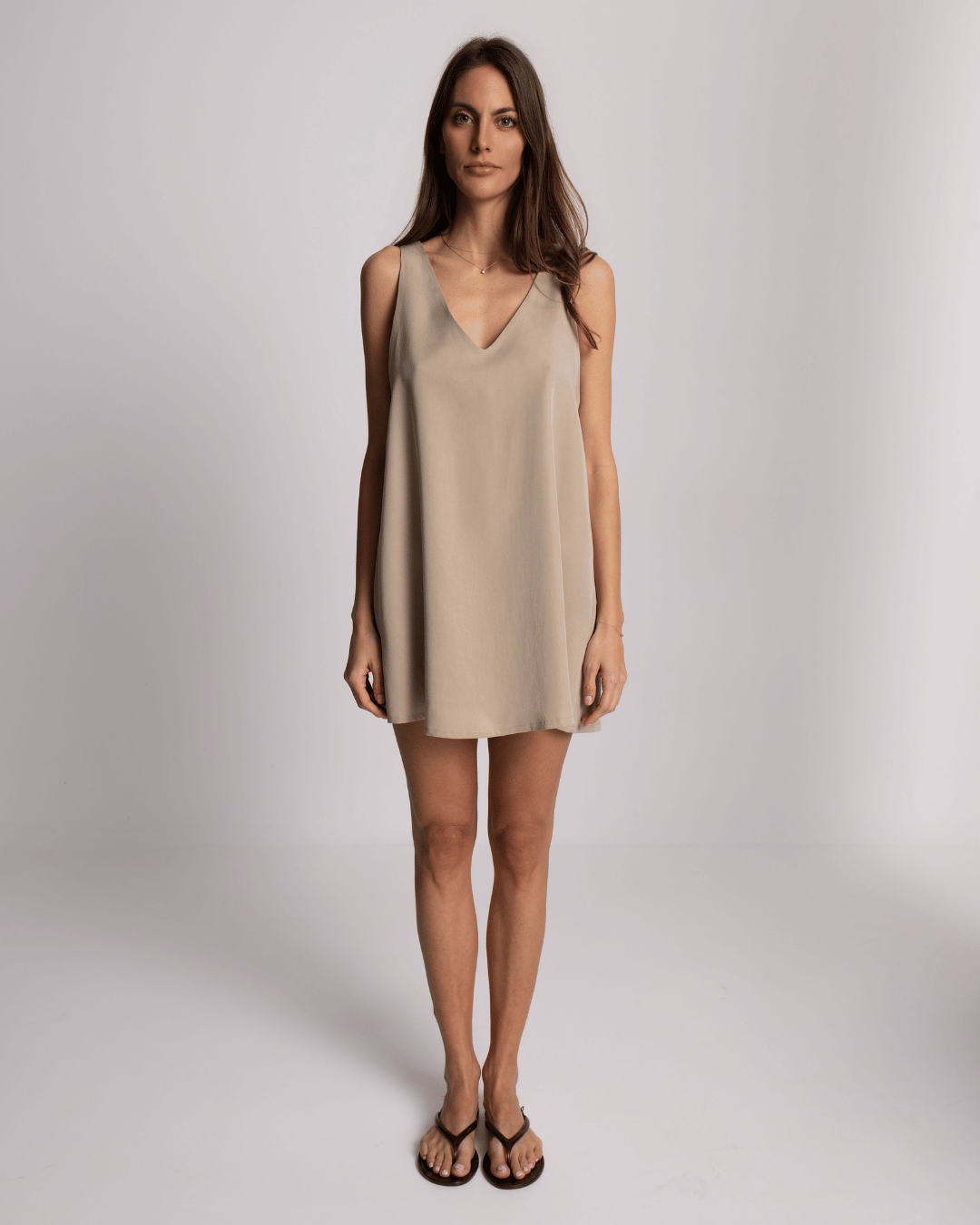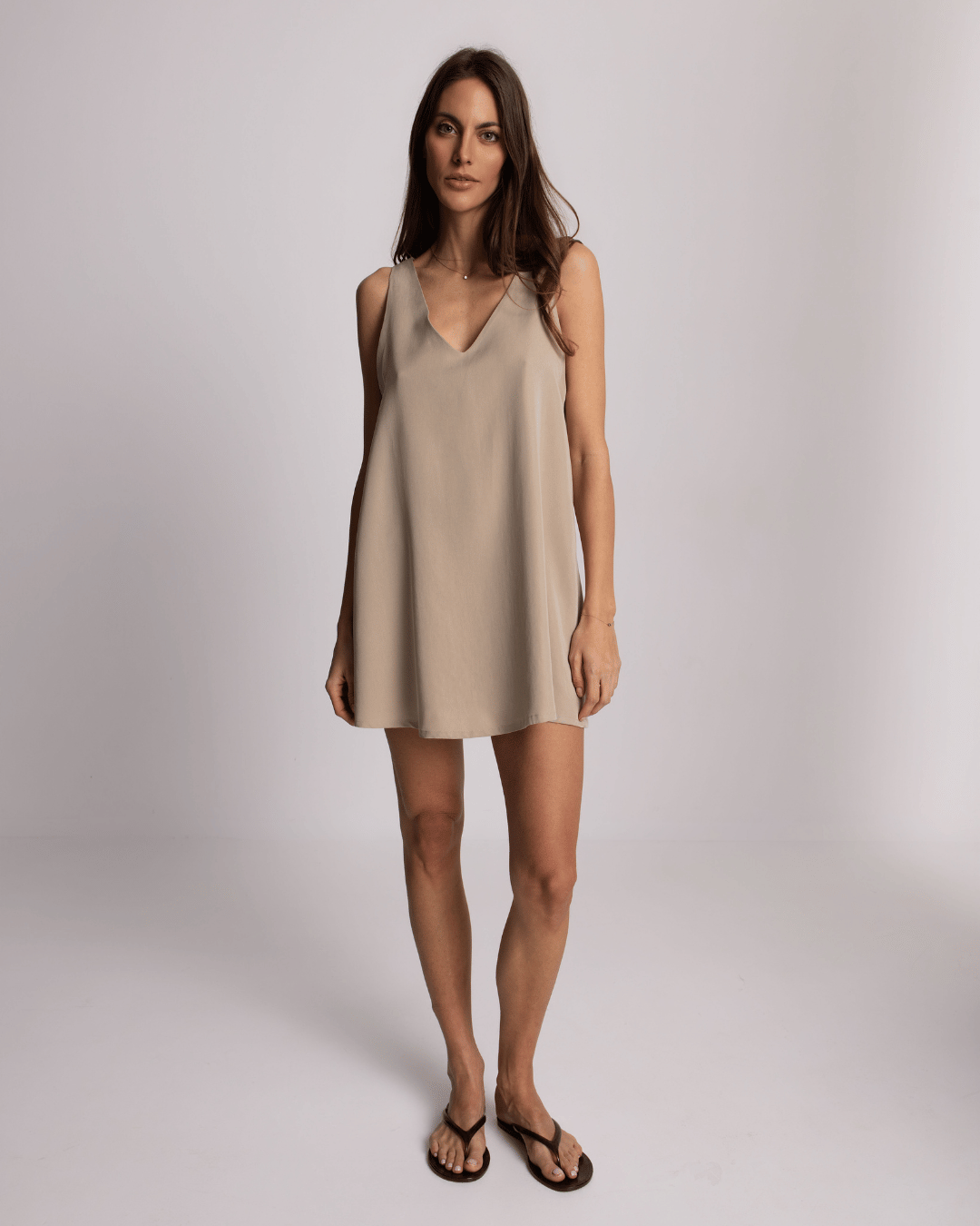 Lagana mini haljina sa V izrezom, izrađena od 100% liocela, idealna za letnje dane, putovanja i elegantne dnevne ili večernje kombinacije.