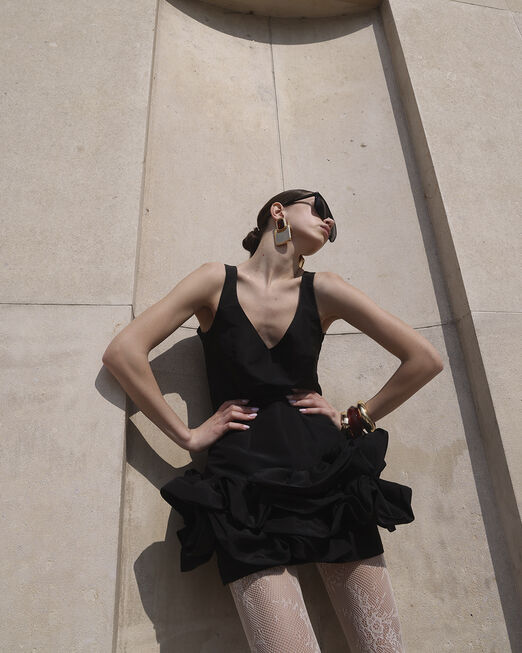 Svilena kratka haljina sa dubokim V izrezom i skrivemin rajsfešlus na ledjima. Donji deo hanjine je od karnera.