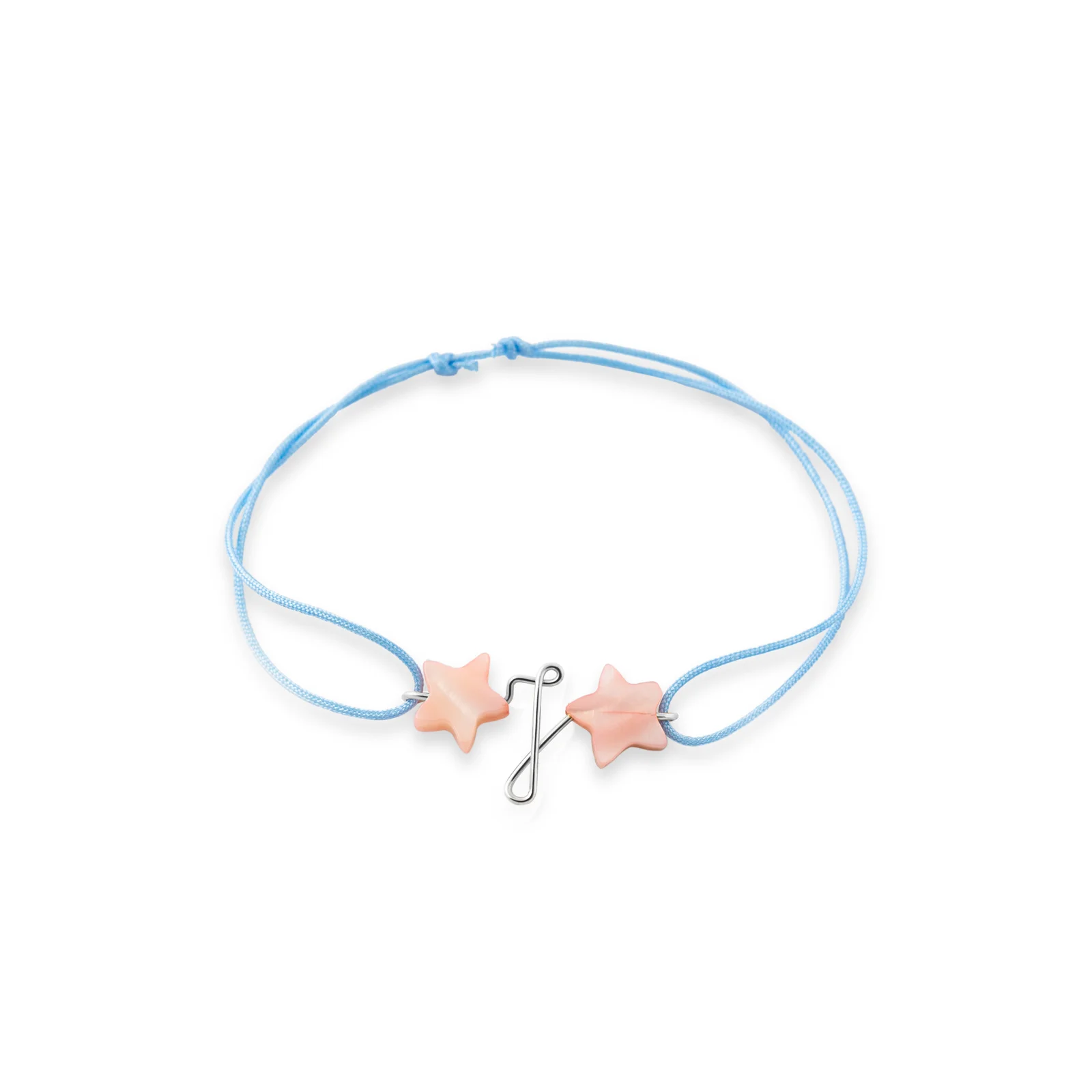 Narukvica na koncu sa dve sedef zvezde. Birate boju konca i slovo od srebra koje želite na narukvicu. Pri kupovini dodati u Napomeni koje slovo želite da se ispiše na narukvici.