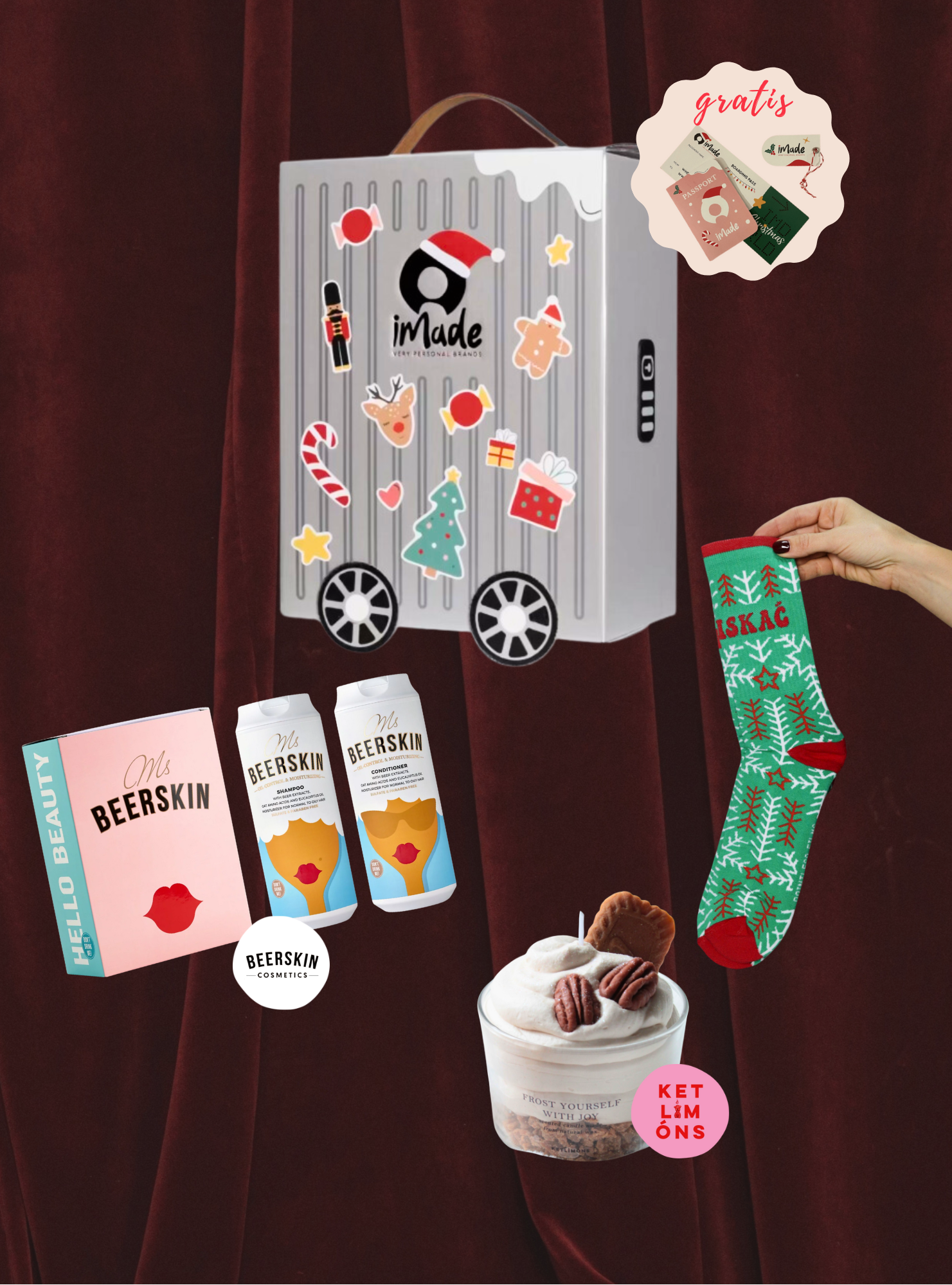 Poklon set sadrži: - IMADE koferčić + čestitka u obliku pasoša, karta i name tag - Ketlimóns sveća - YUGODISKAĆ Novogodišnje čarape - BEERSKIN Ženski set