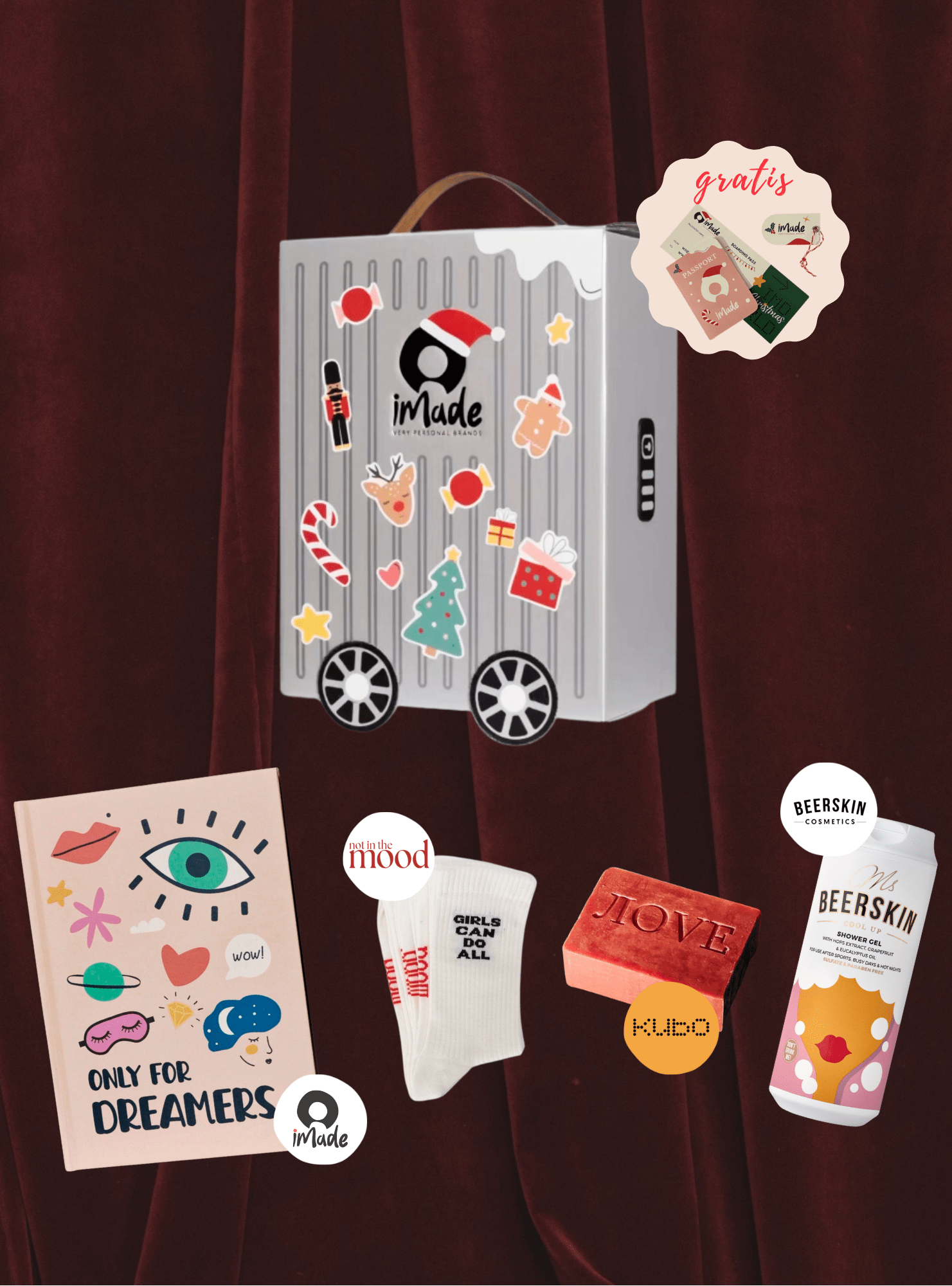 - NOT IN THE MOOD Čarape GIRLS CAN DO ALL Materijal: 85% pamuk, 10% poliamid, 5% elastin - KUBO SOAPS sapun ЛОVE Osnovni sastojci: ulje elaeis guineensis, olea europea (maslinovo) voćno ulje, cocos nucifera (kokosovo) ulje, ulje semena ricinus communis, maslac na biljnoj bazi, eterična ulja + više od ljubavi - BEERSKIN Ms Beerskin Cool Up gel za tuširanje - 440ml osvežavajuči gel za tuširanje ​Formula ne sadrži sulfate, parabene, veštačke mirise ili parfeme. - IMADE Only for dreamers rokovnik: A5 format, 96 listova - IMADE Kutija u obliku kofera, dimenzije 212x120x275mm - Čestitka u obliku pasoša, karta, name tag