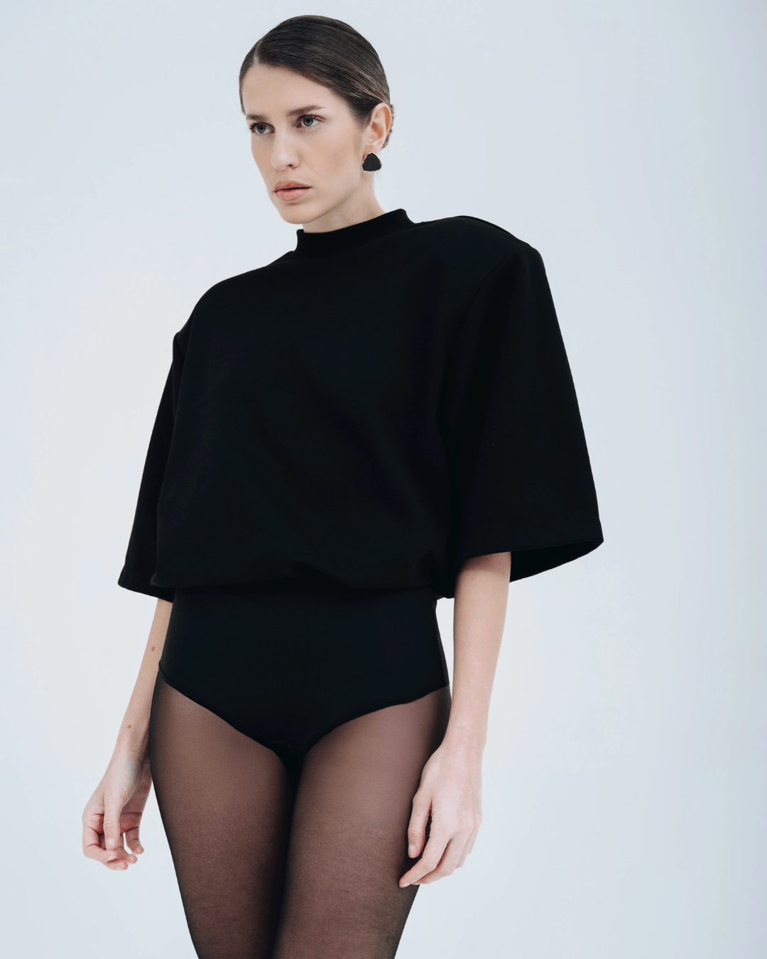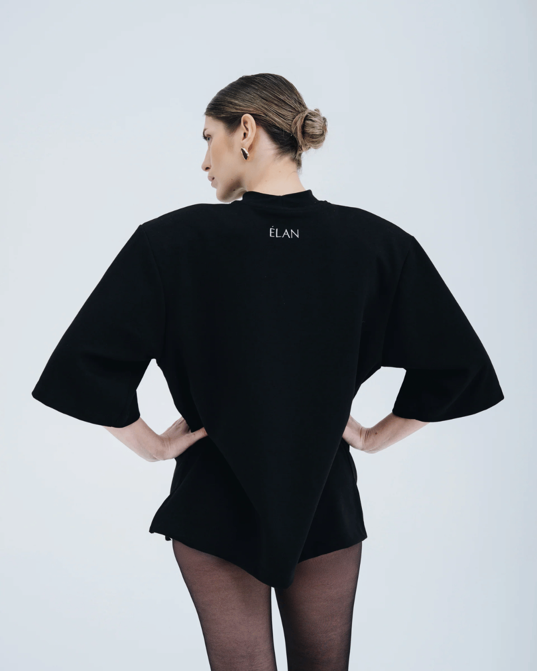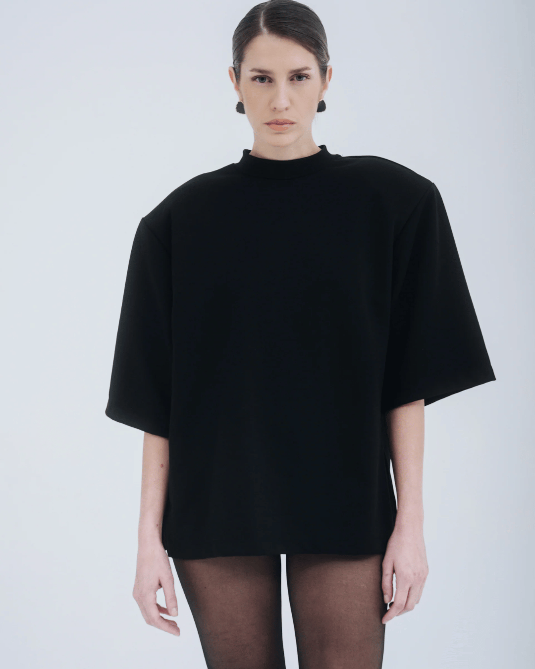 Oversized crna majica sa izraženim ramenima koja kombinuje ležernost i sofisticiran detalj. Lagan kroj pruža udobnost, dok izražena ramena daju stil i oblik, čineći je idealnom za slojevite outfite ili samostalno nošenje.