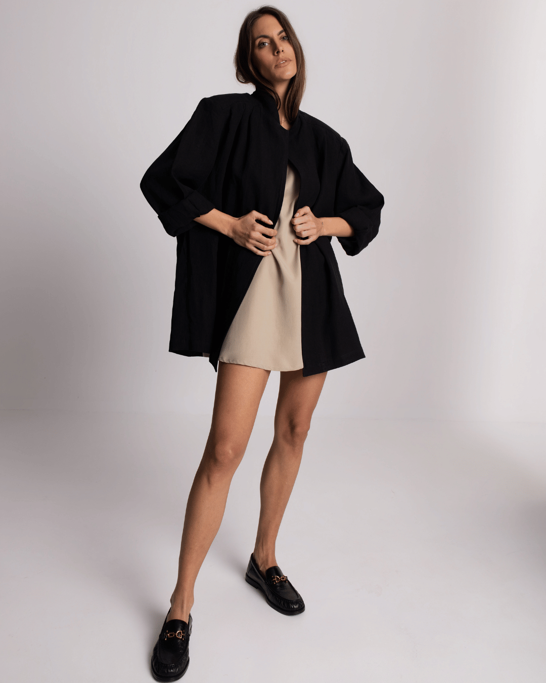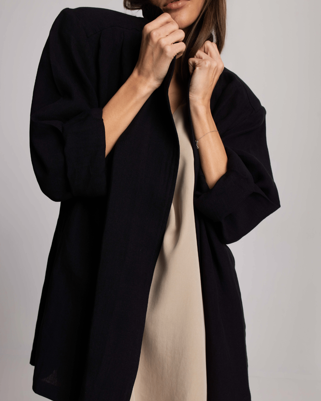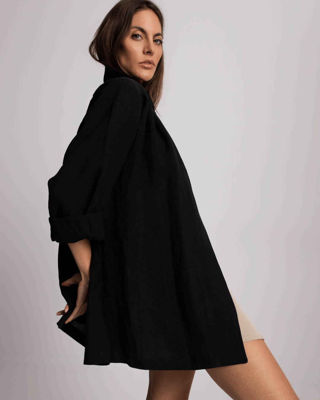 Ženska lanena košulja u crnoj boji, oversized kroja i lagane strukture, idealna za letnje kombinacije, putovanja i elegantan svakodnevni styling.