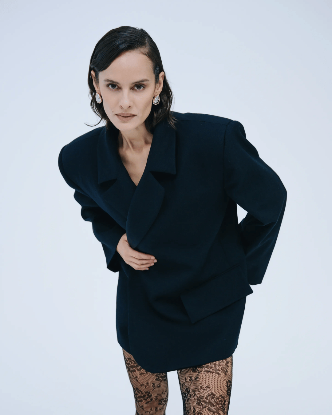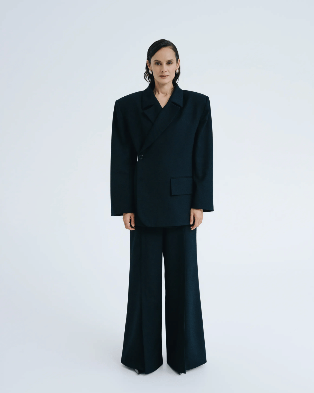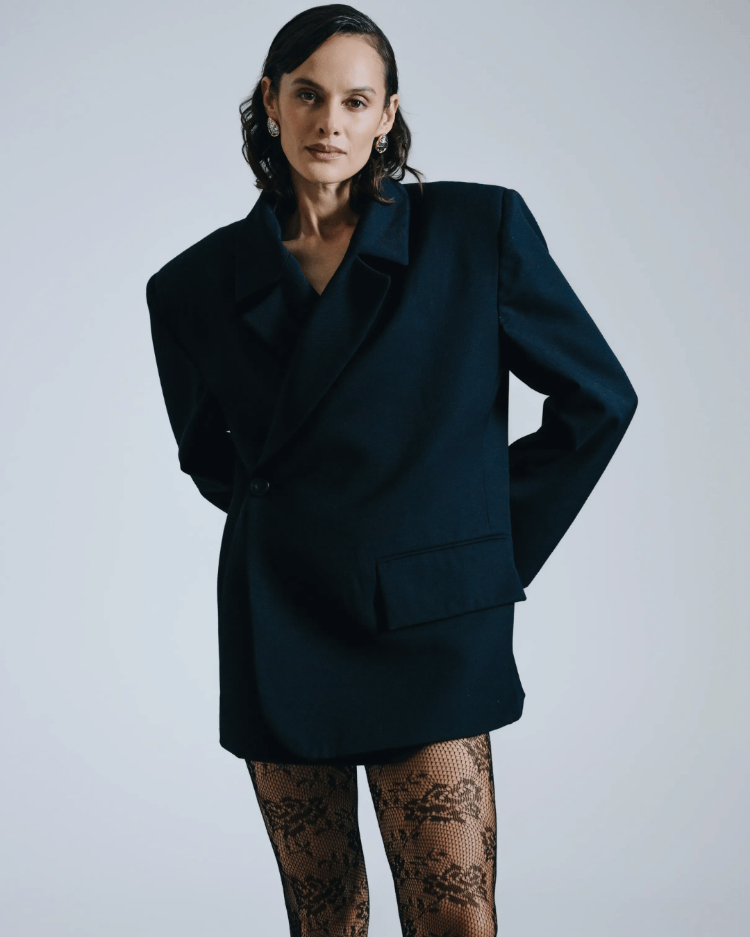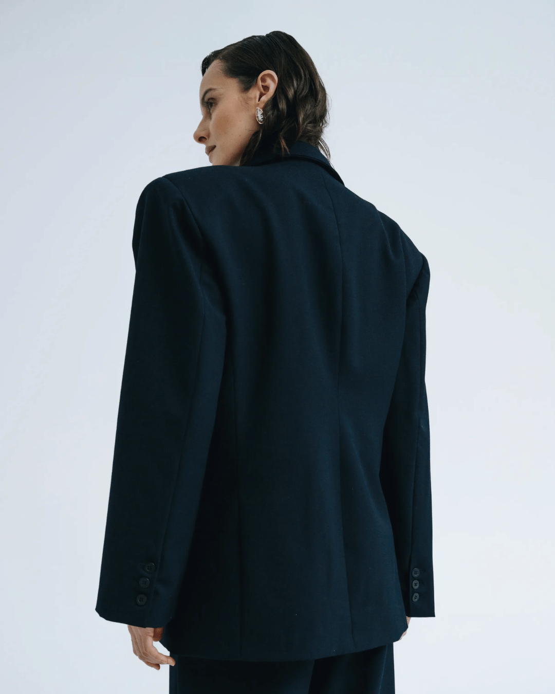 Teget oversized sako, suptilno strukiran sa naglašenim ramenima.