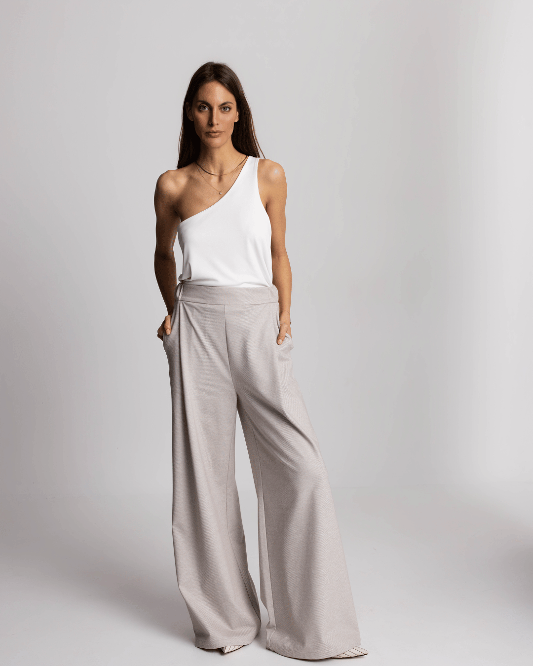 Elegantne ženske pantalone, laganog pada i opuštene siluete, idealne za posao, putovanja, večere i sofisticirane dnevne kombinacije. Opis brenda naglašava prozračan pad materijala, udobnost i lako stilizovanje.