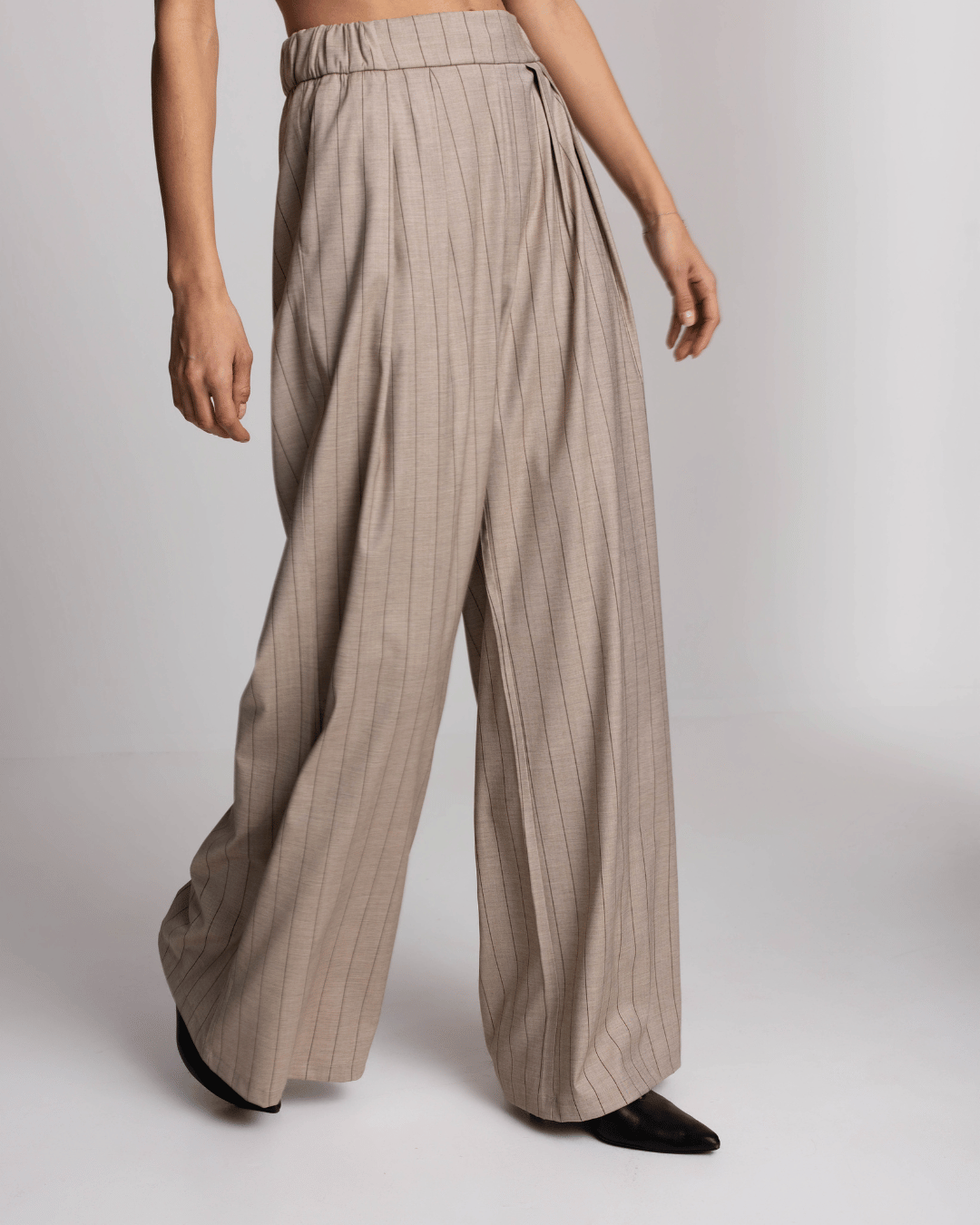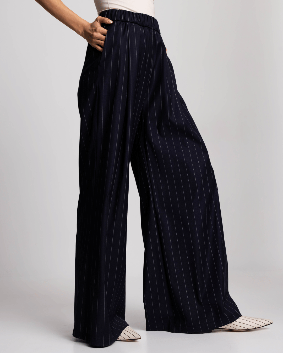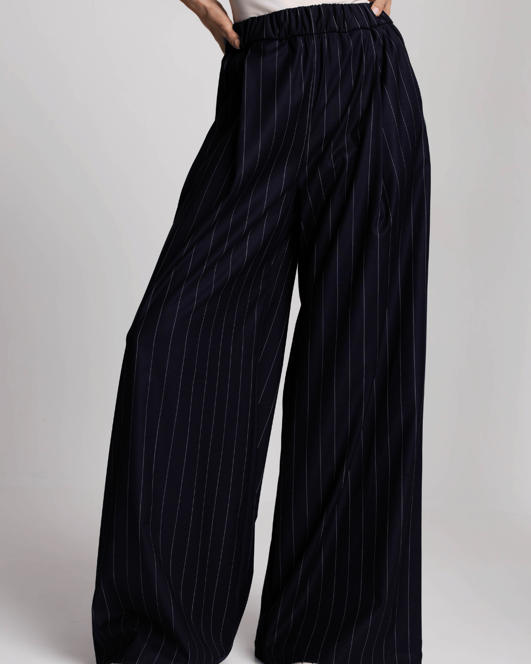 Elegantne ženske pantalone visokog struka sa prugama, širokih nogavica i lepog pada, idealne za posao, večere i sofisticirane dnevne kombinacije. Opis brenda naglašava eleganciju, svestranost i moderan izgled.