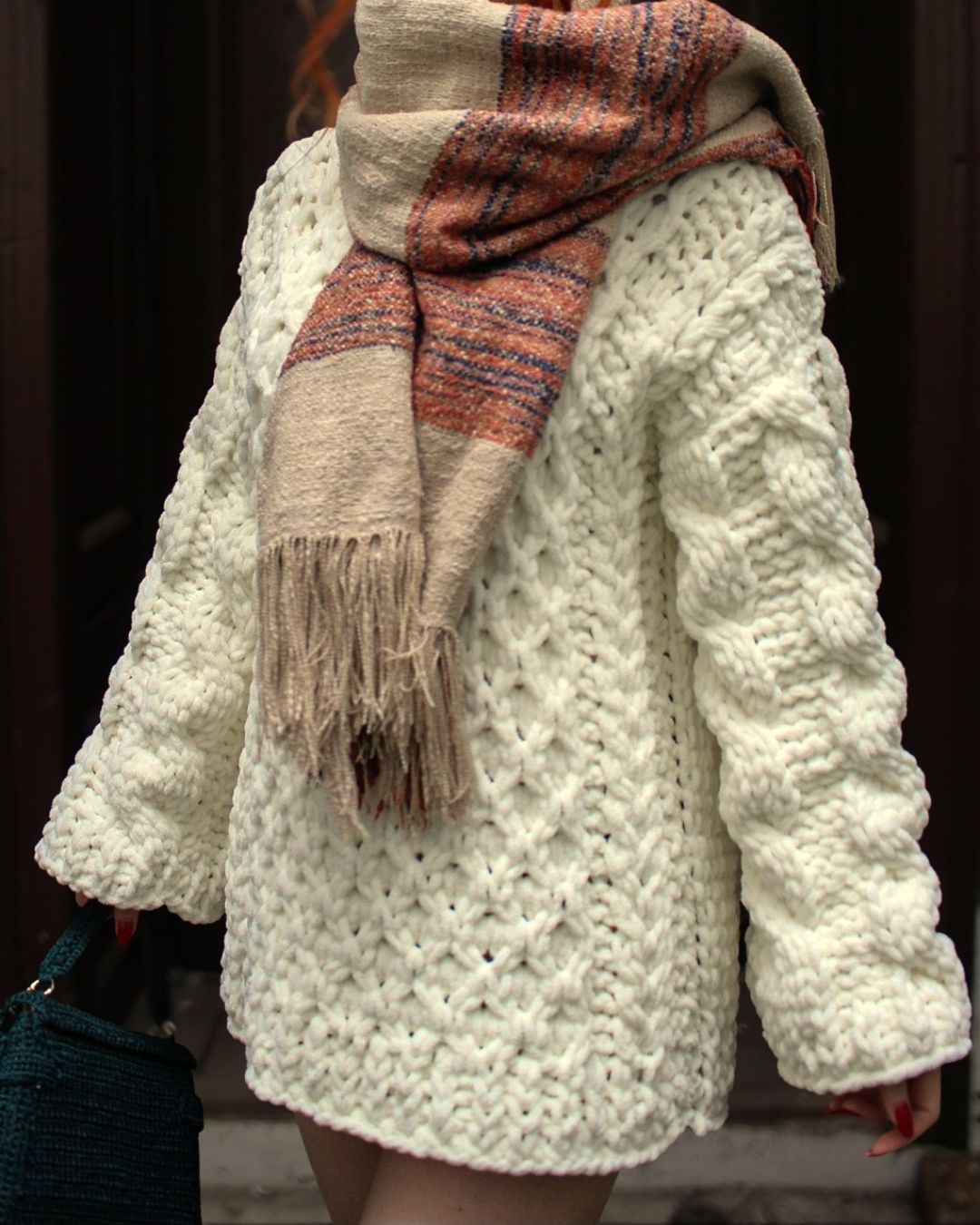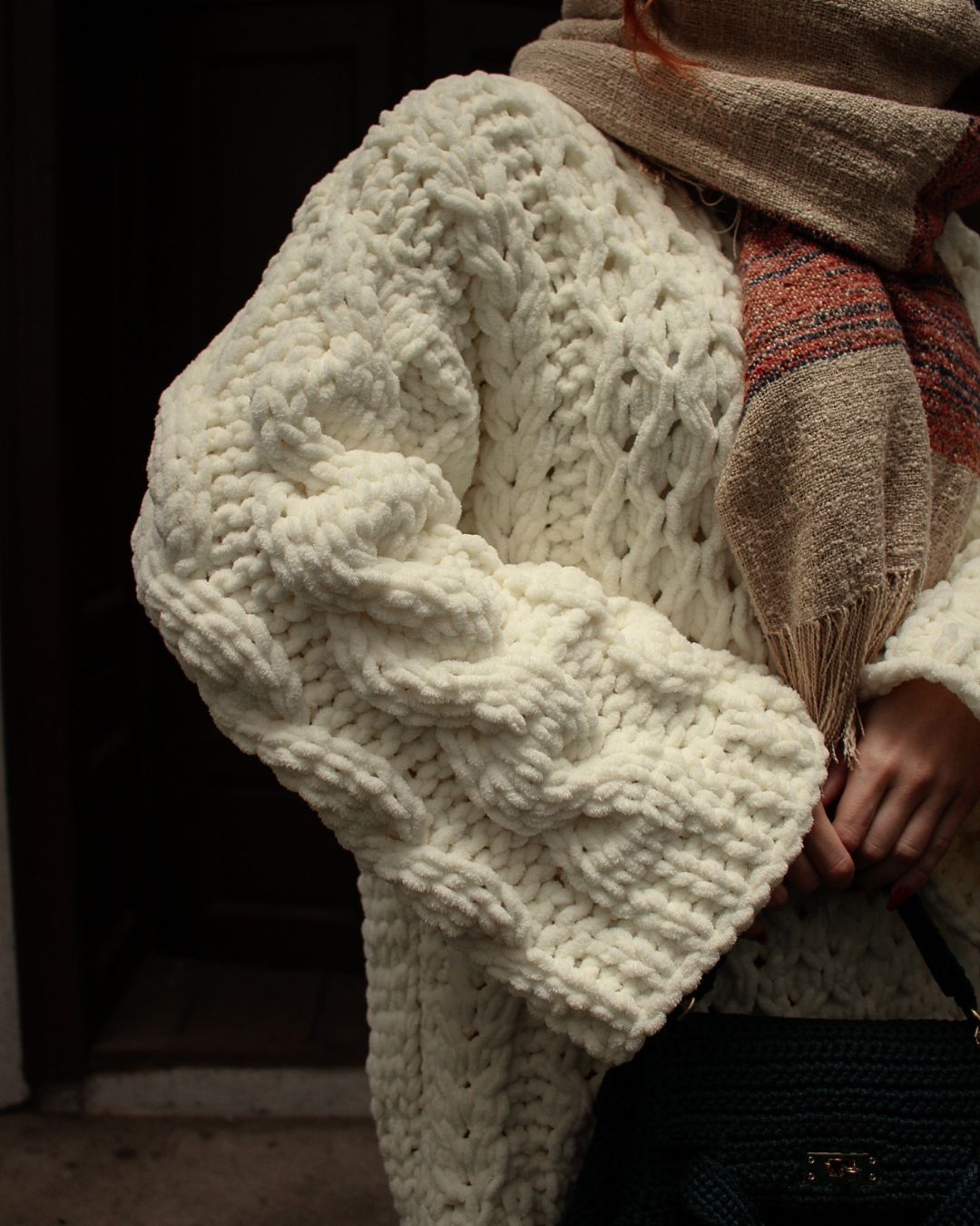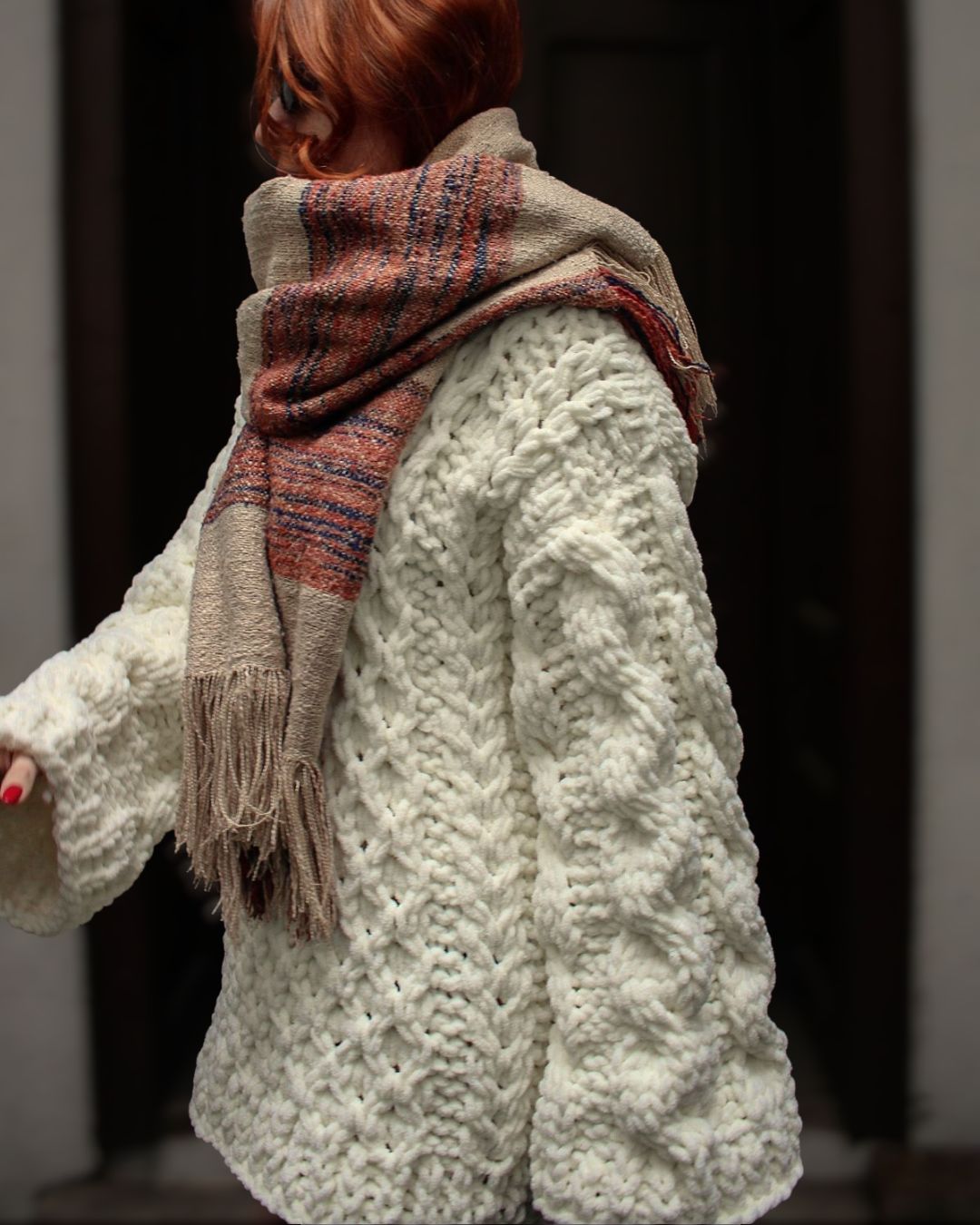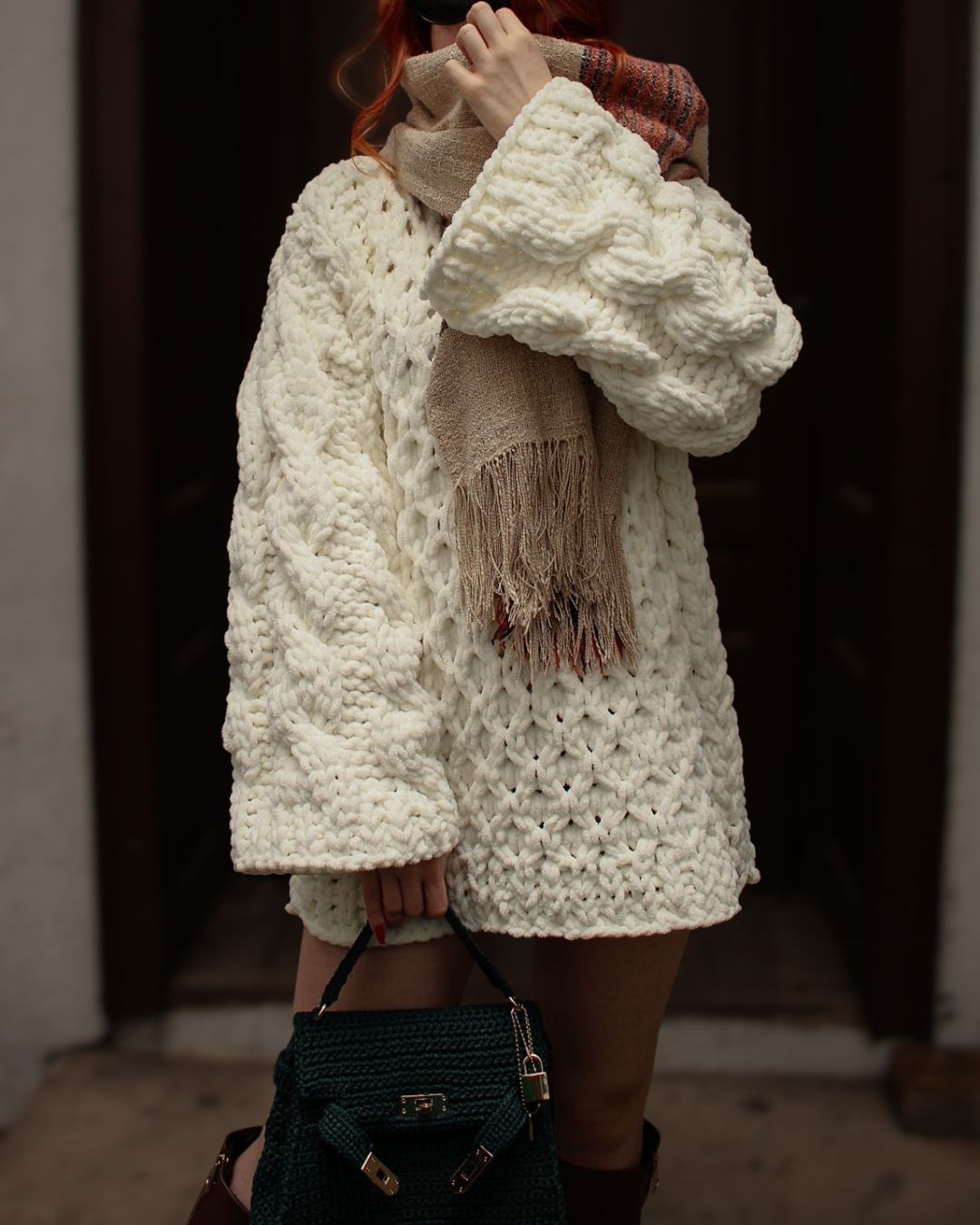 Zimska pletena haljina, u off white boji, sa pletenicama. Može se nositi kao haljina, tunika ili oversize džemper.