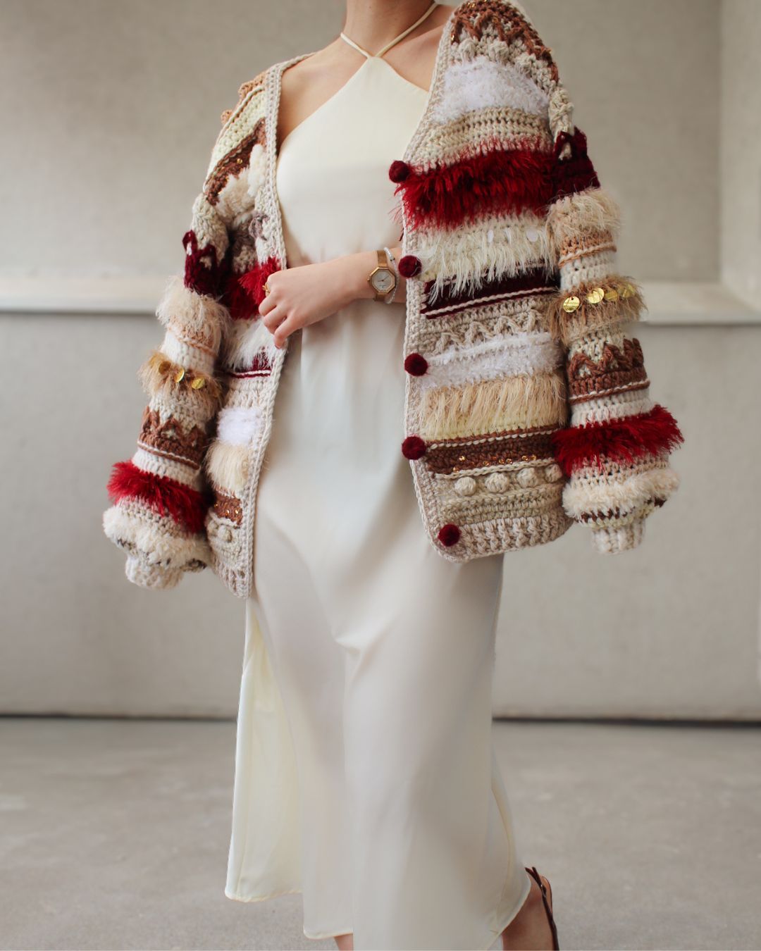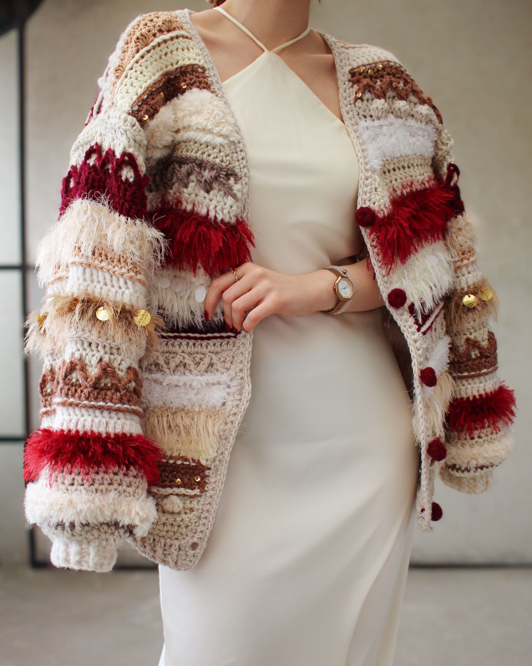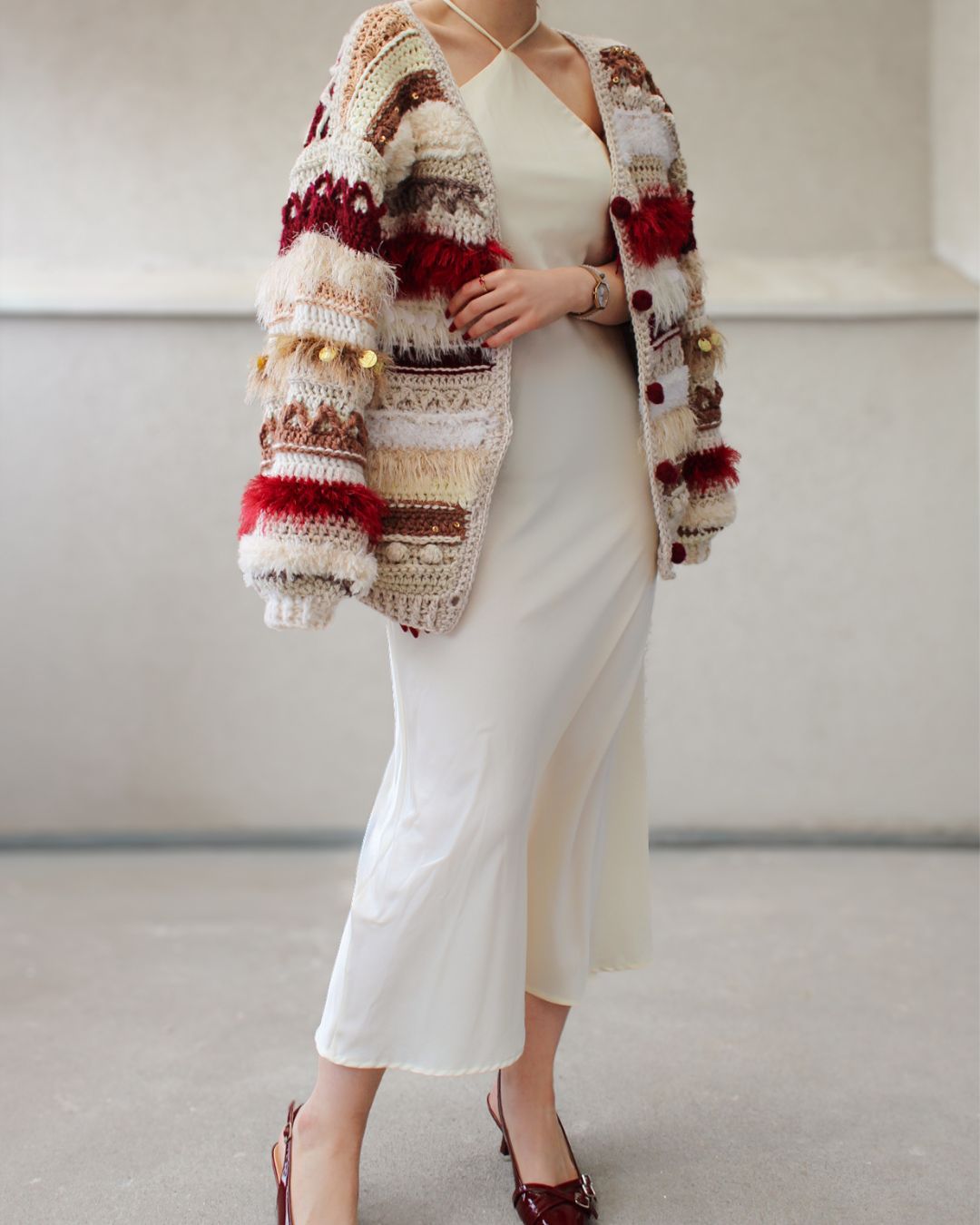 MATERIJAL: 40% vuna, 30% pamuk, 30% moher VELIČINE: XS, S, M, L, XL ODRŽAVANJE: Kardigan je periv u mašini na 30°, preporučeni programi su: ručno pranje i wool wash. Poželjno je sušiti kardigan u horizontalnom položaju, kako ne bi promenio formu, posebno u predelu ramena i rukava. OPIS: Ručno heklan ženski kardigan, u različitim nijansama bordo, krem i braon boje, šireg kroja i širokih balon rukava. Heklan je pletiva koji u svom sastavu sadrži vunu, pamuk i moher te je nežan na koži i vrlo prijatan za nošenje. Lako se kombinuje uz sve odevne kombinacije, bilo da idete na posao, u šetnju ili na planinu. Dizajn je unikatan.