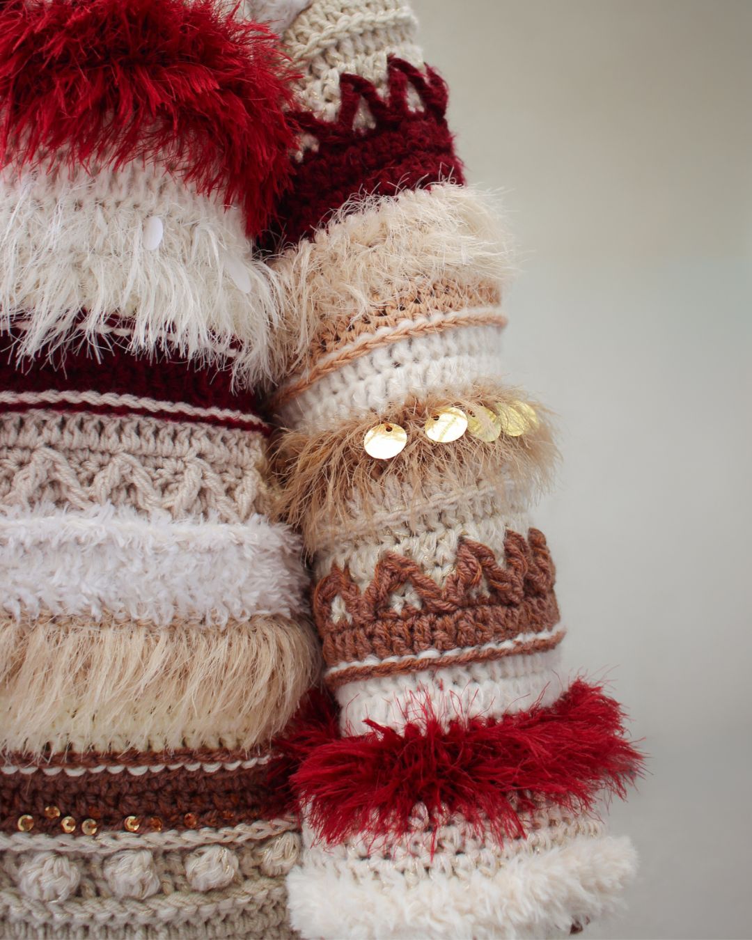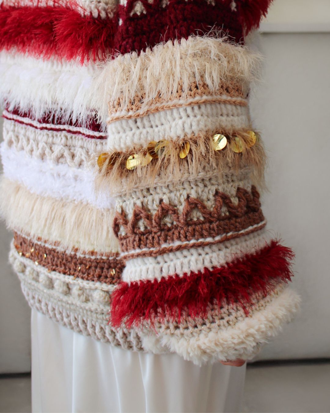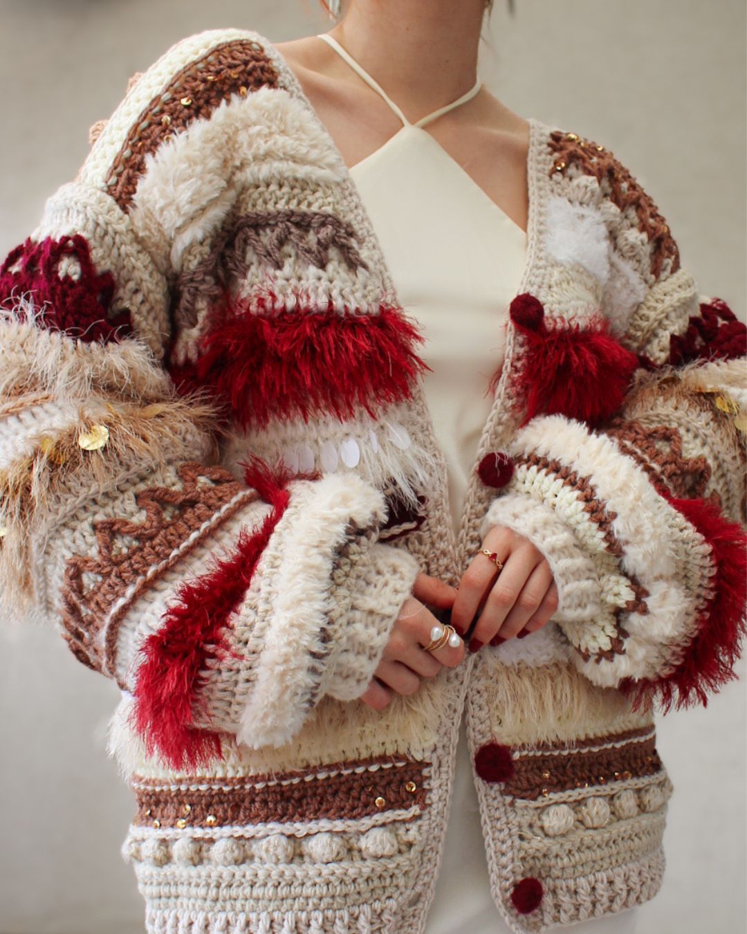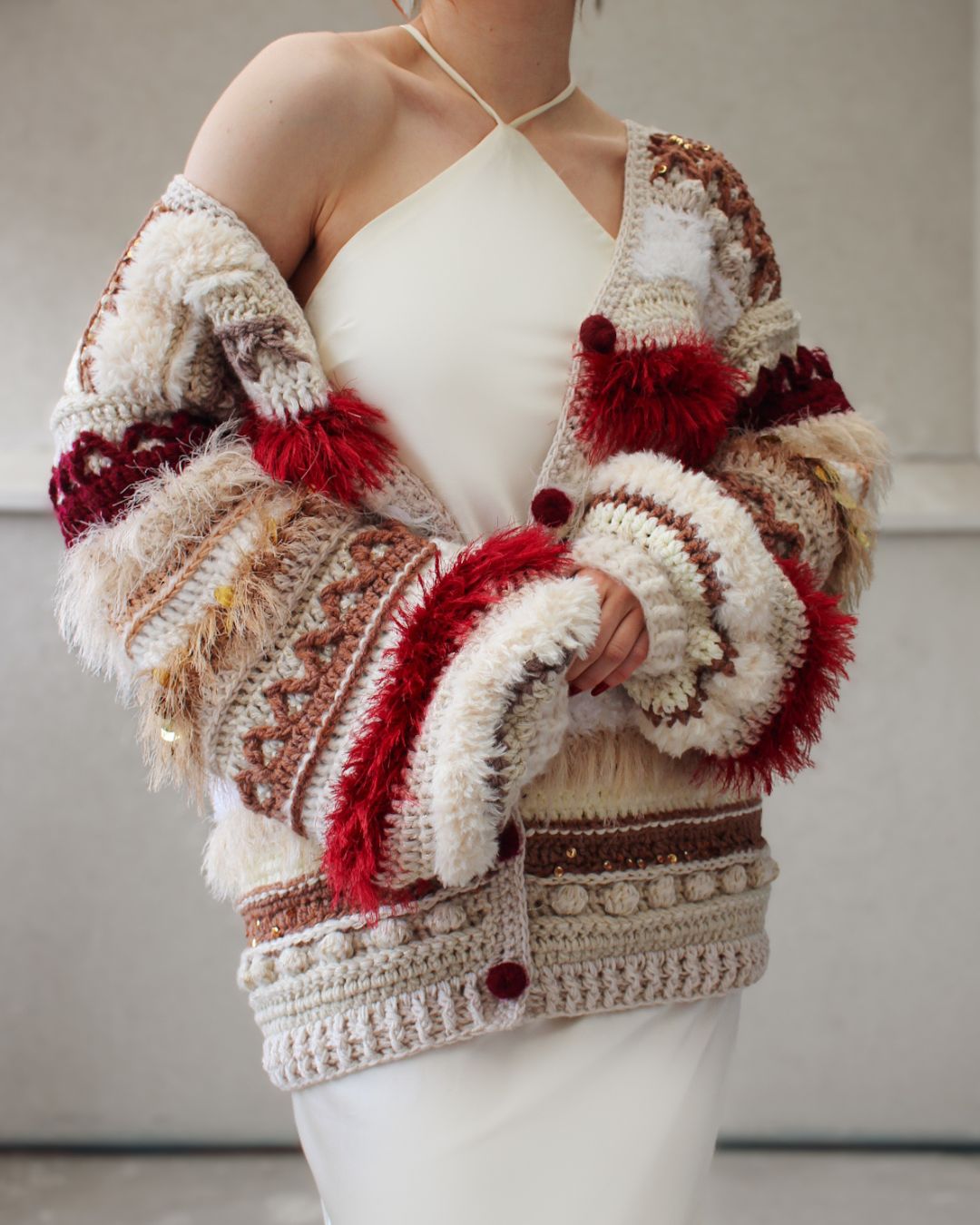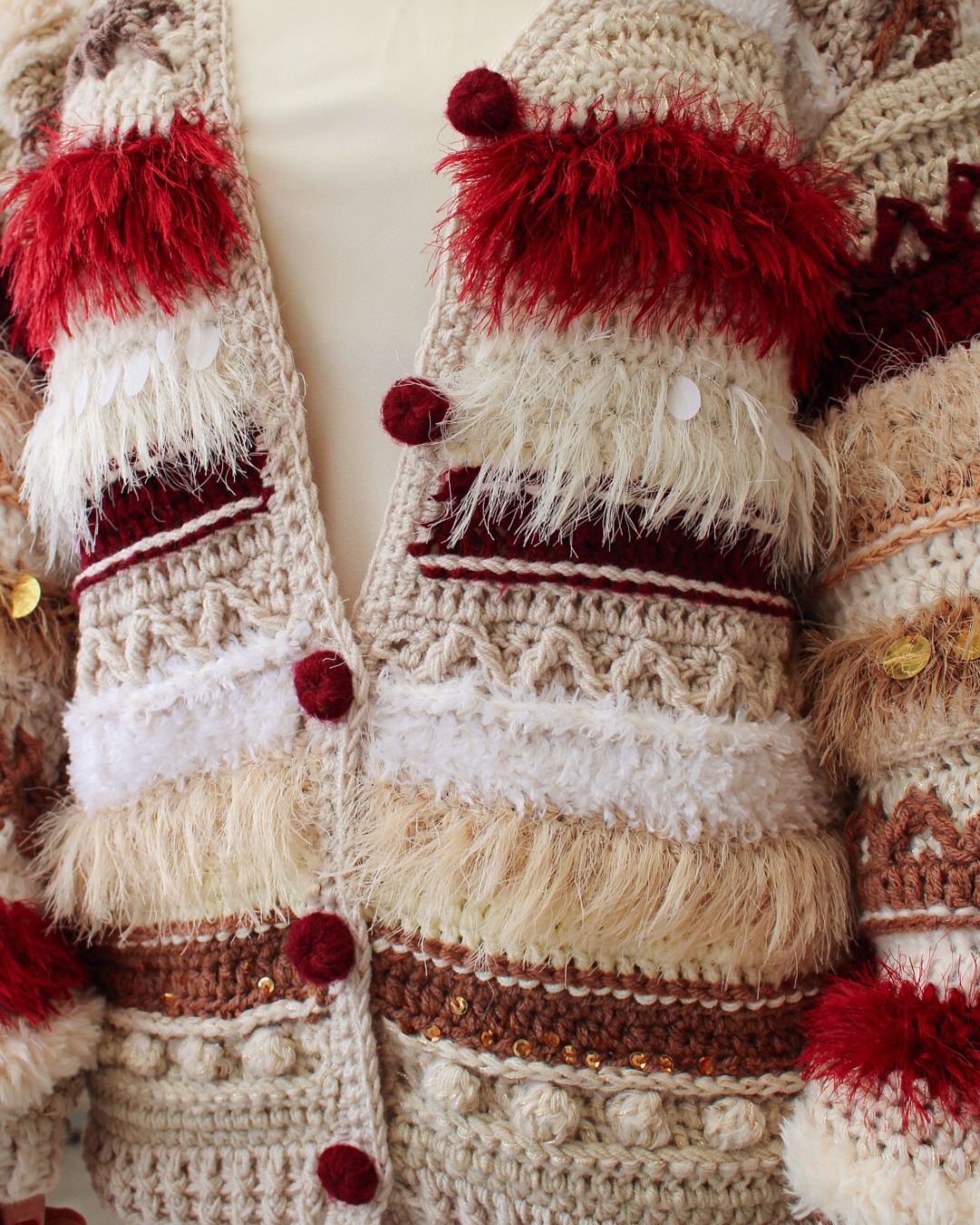Ručno heklan ženski kardigan, u različitim nijansama bordo, krem i braon boje, šireg kroja i širokih balon rukava.