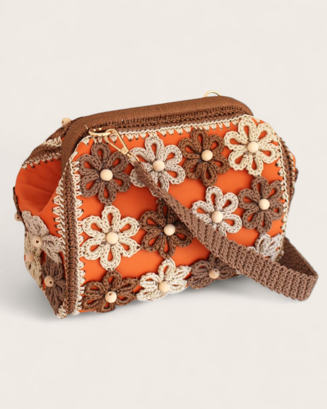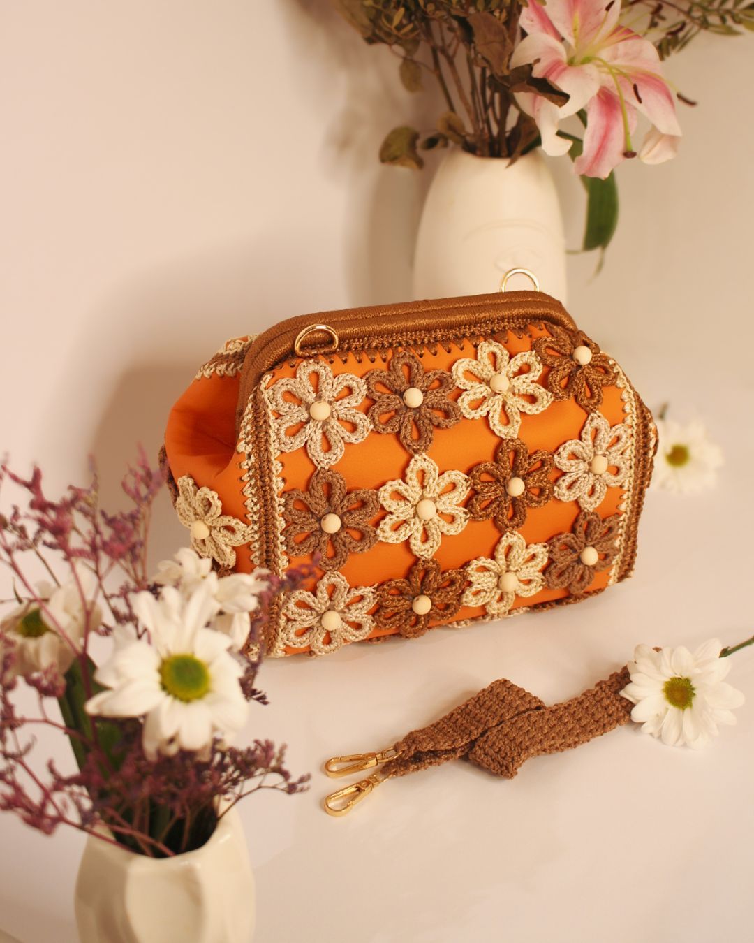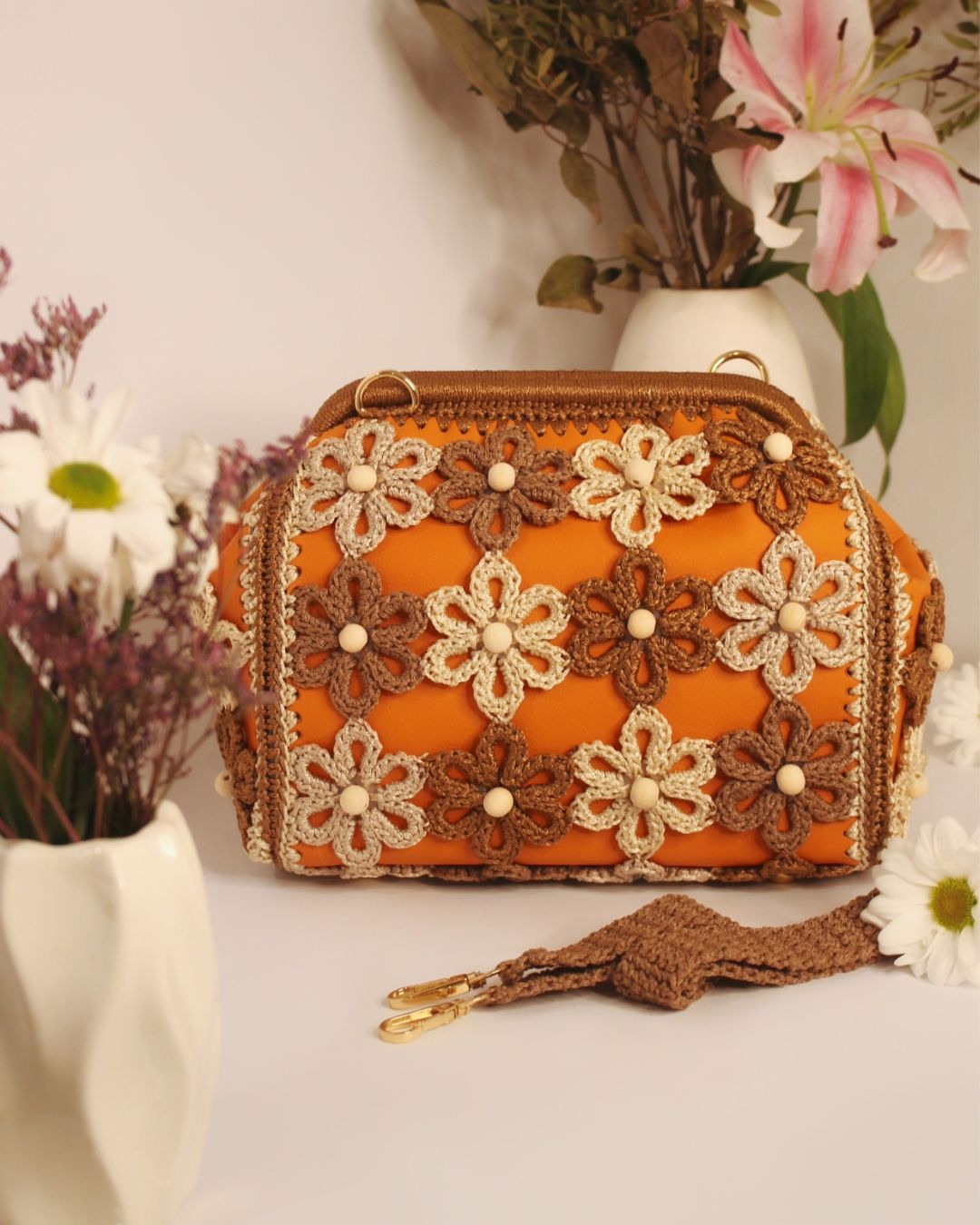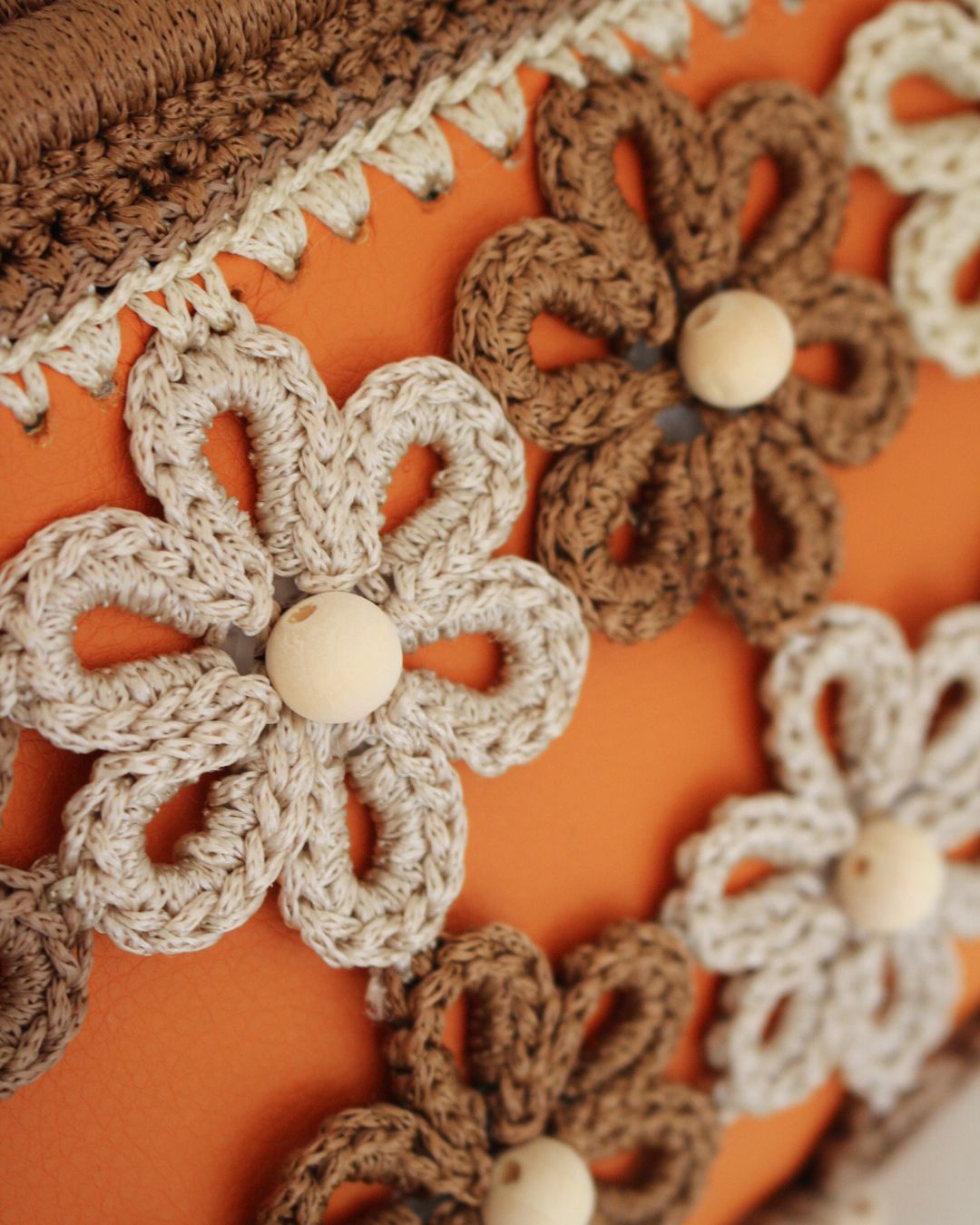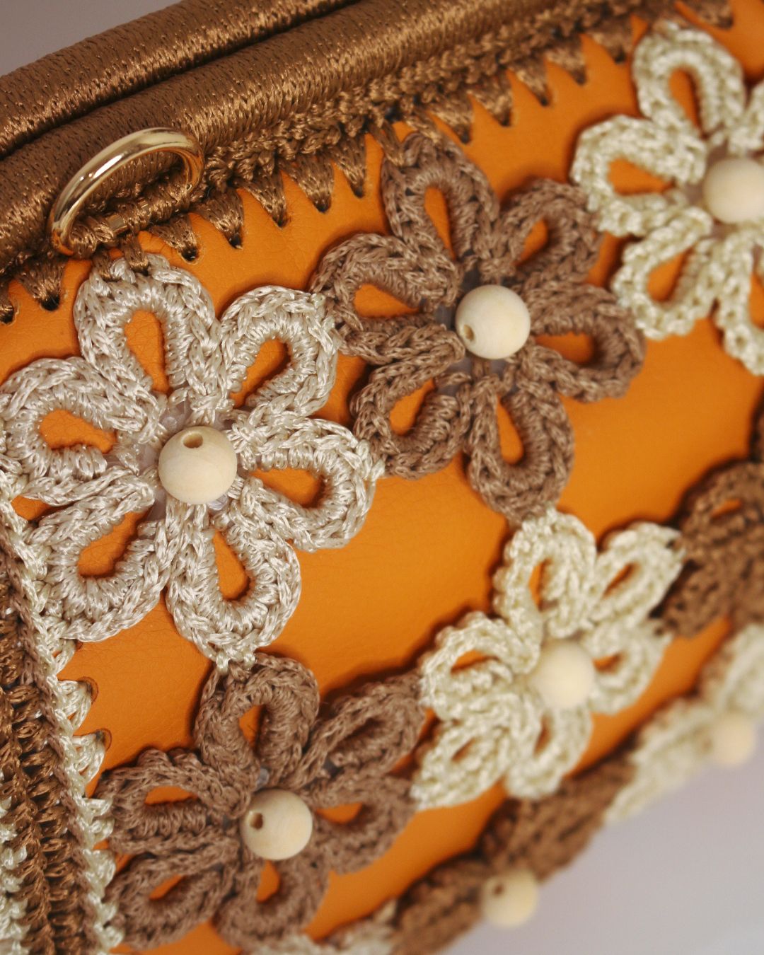 Ručno rađena clutch torba sa heklanim cvetovima, od veštačke kože u narandžastoj boji, može se nositi na dva načina: kao clutch torba ili preko ramena (ima skidajući kaiš).