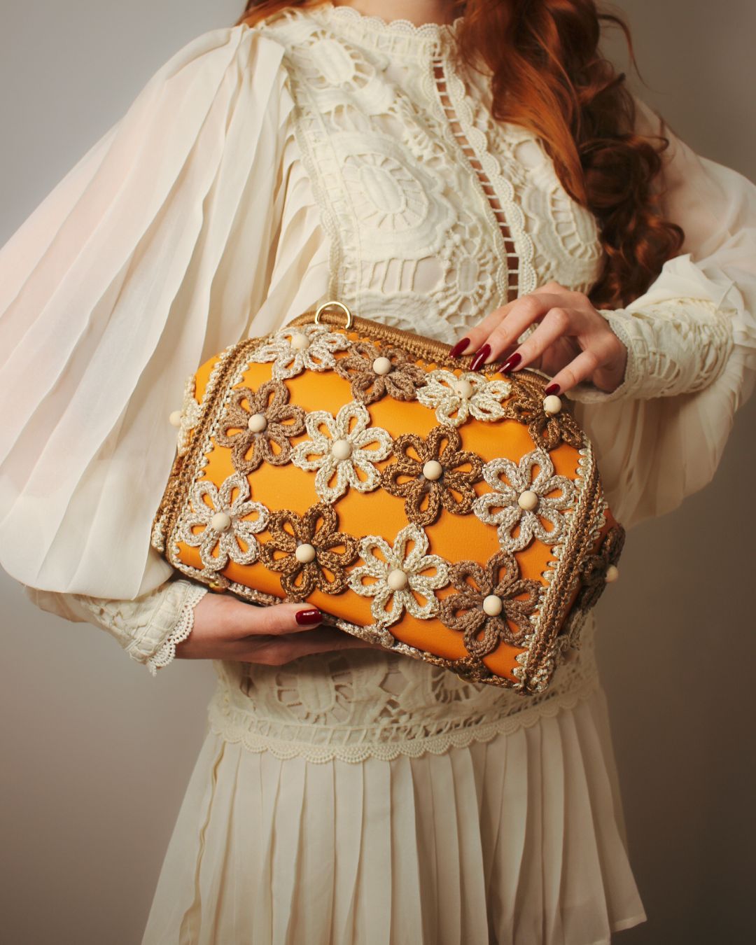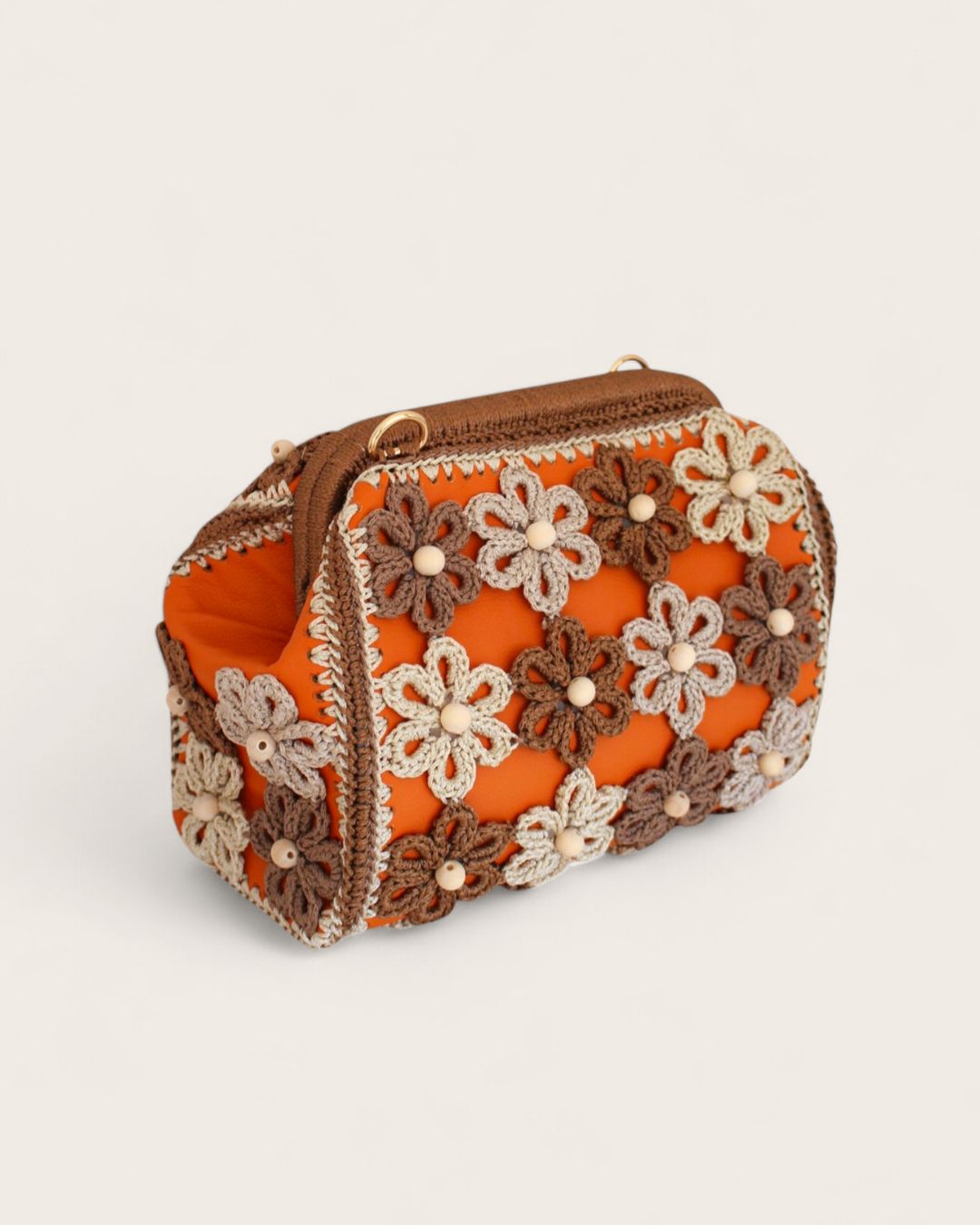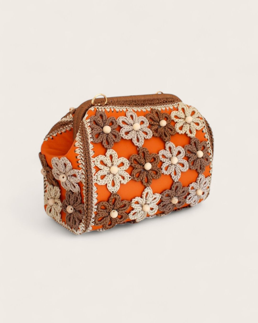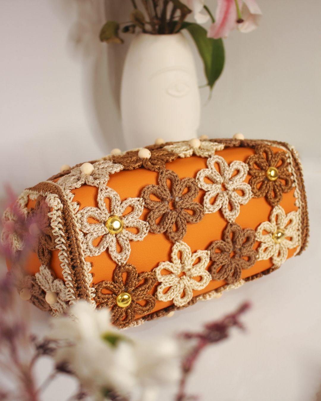 Ručno rađena clutch torba sa heklanim cvetovima, od veštačke kože u narandžastoj boji, može se nositi na dva načina: kao clutch torba ili preko ramena (ima skidajući kaiš).