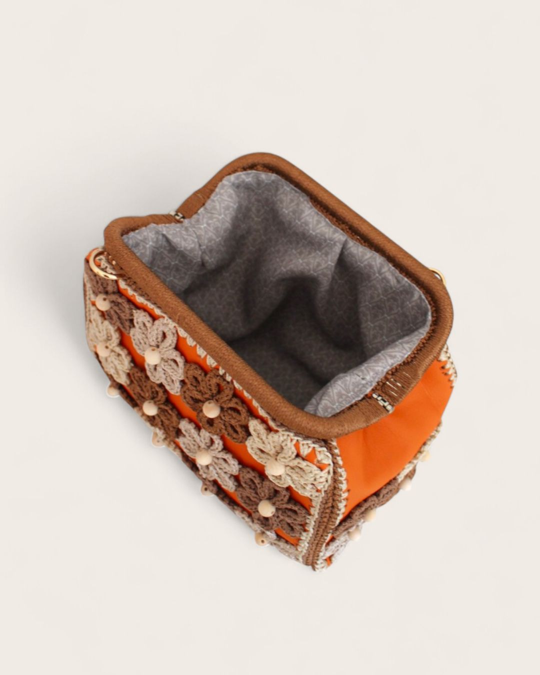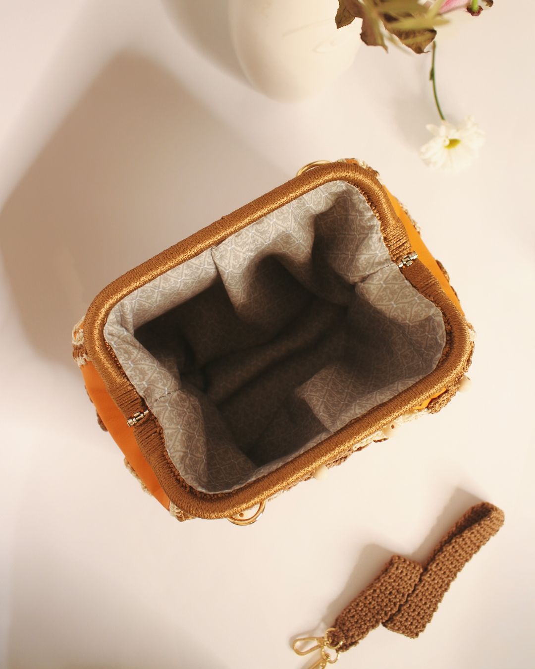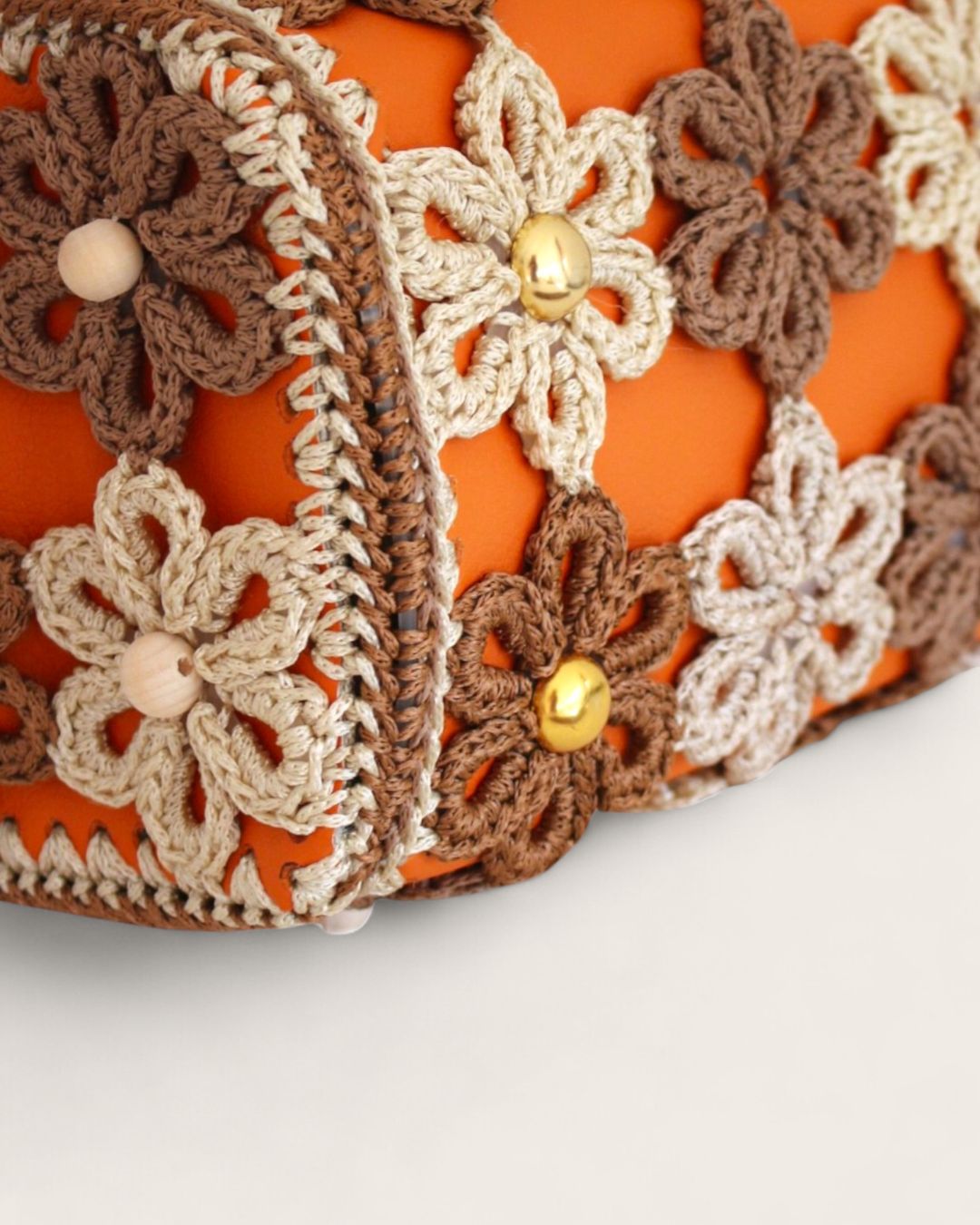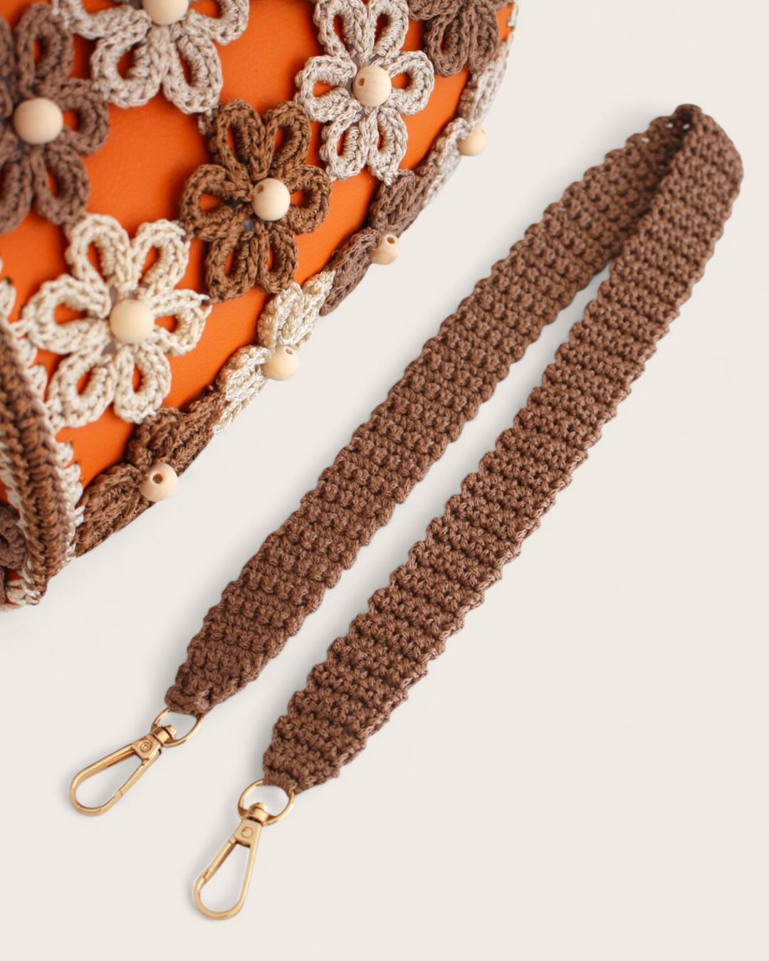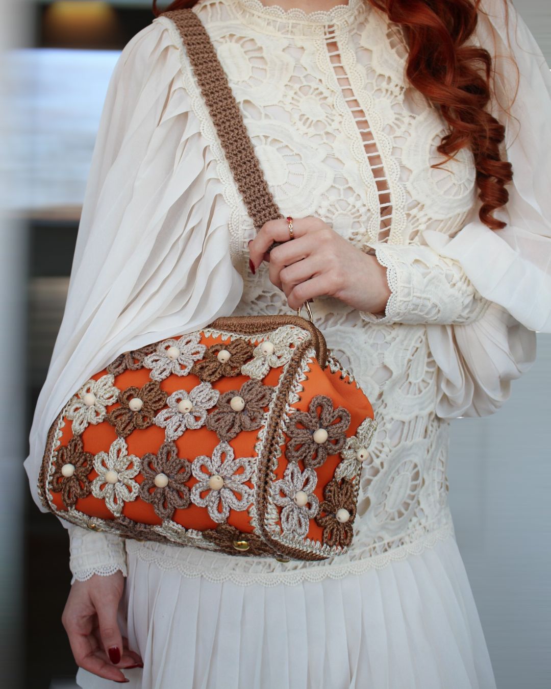 Ručno rađena clutch torba sa heklanim cvetovima, od veštačke kože u narandžastoj boji, može se nositi na dva načina: kao clutch torba ili preko ramena (ima skidajući kaiš).