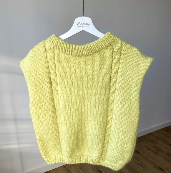 SASTAV: Ručno štrikan od merino vune. ODRŽAVANJE: Ručno pranje u hladnoj vodi. Odnosite se prema njemu pažljivo i biće lep dugo, dugo vremena. OPIS: Nia prsluk, unikatan, ručno pleten, izrađen od najfinije merino vune. Ovaj prsluk kombinuje toplinu, mekoću i izdržljivost prirodnog materijala, savršen za hladnije dane. S prednje strane ukrašen je dvema prefinjenim pletenicama, koje mu daju elegantan, ali i rustičan izgled. Dostupan je u devet prekrasnih boja, što omogućava da ga lako kombinujete uz različite stilove. Prsluk je savršen dodatak svakom garderoberu – nosiv preko košulje ili rolke, za slojevito oblačenje ili kao modni detalj koji pruža toplinu i stil. Dizajniran s ljubavlju i pažnjom, ovaj prsluk nije samo modni komad, već i trajno ulaganje u kvalitet i udobnost. ROK IZRADE: 15 dana