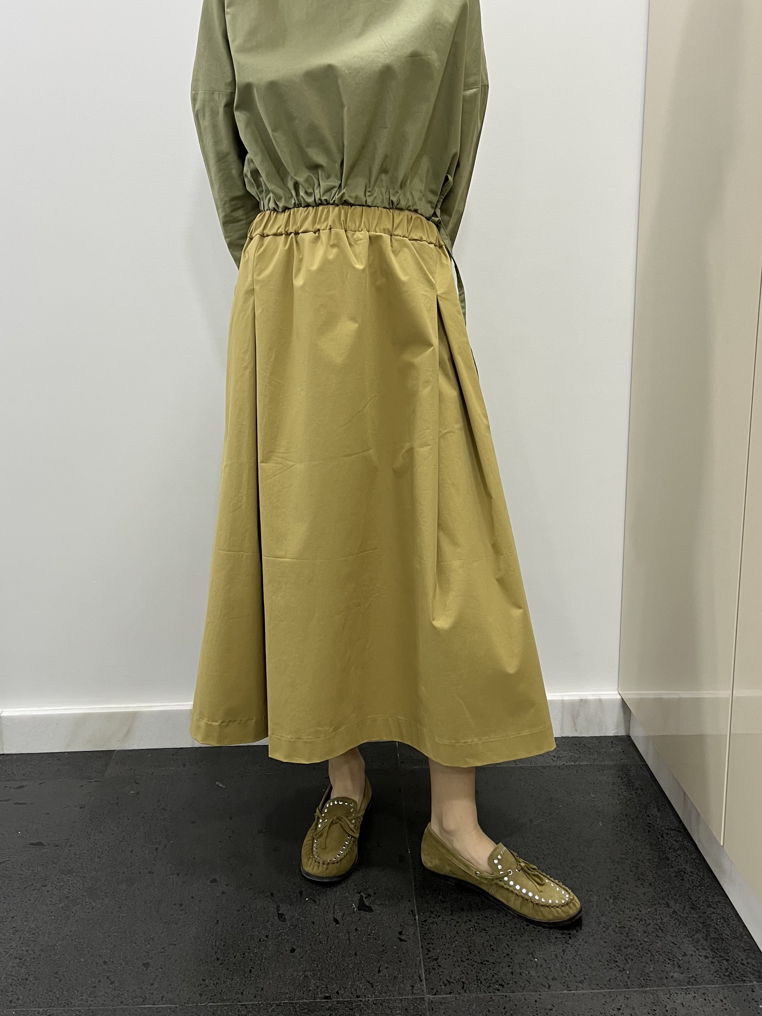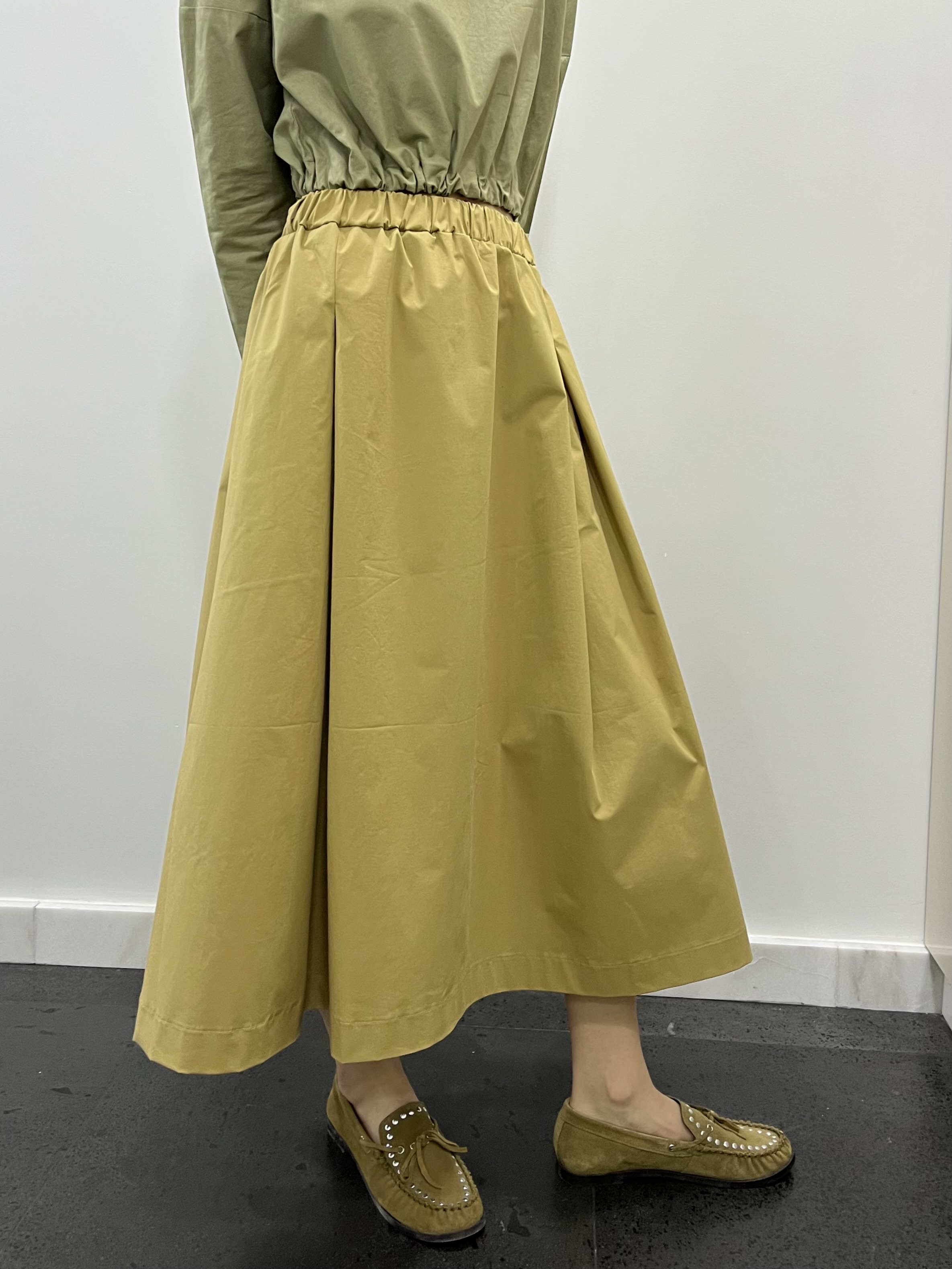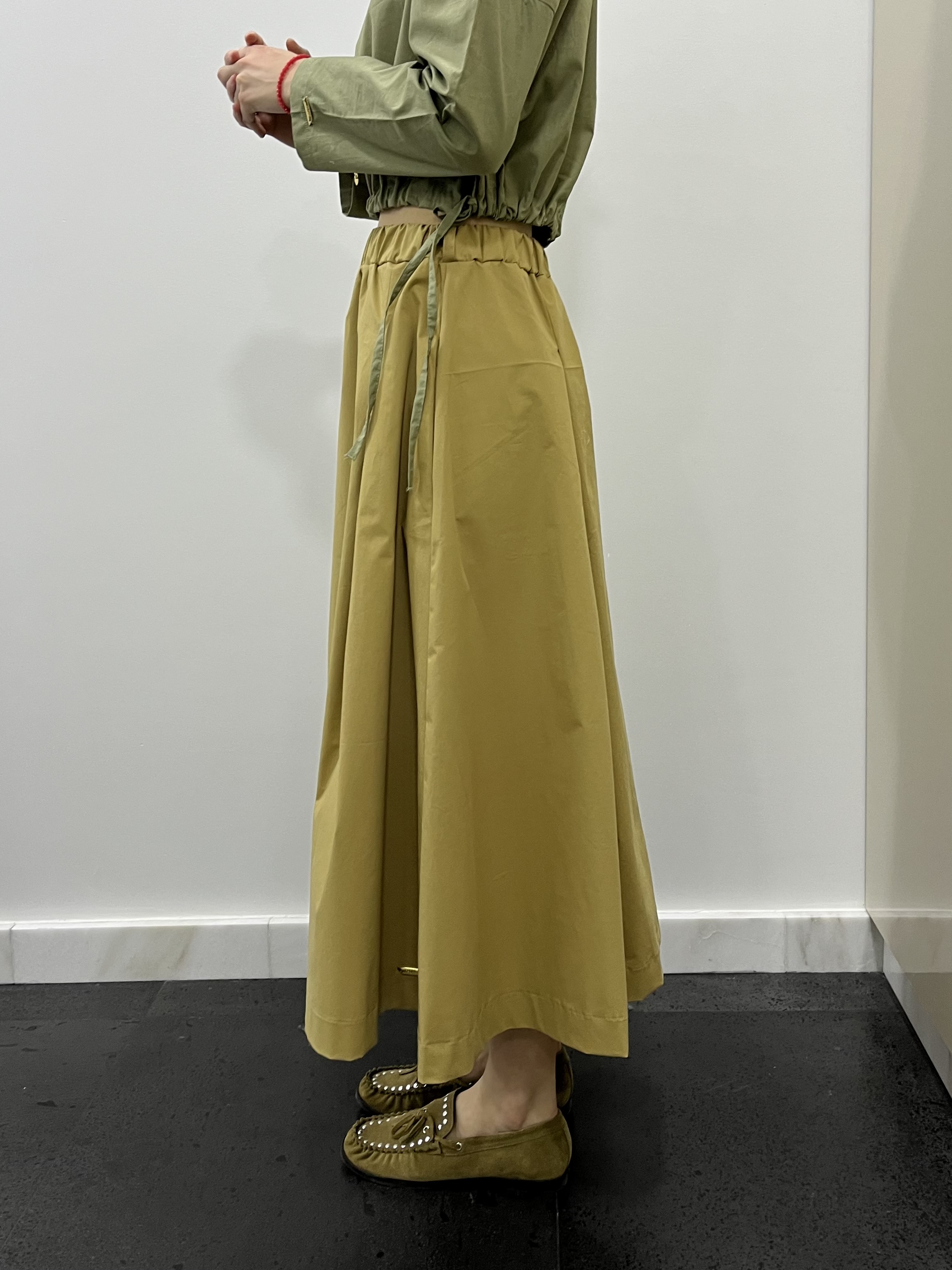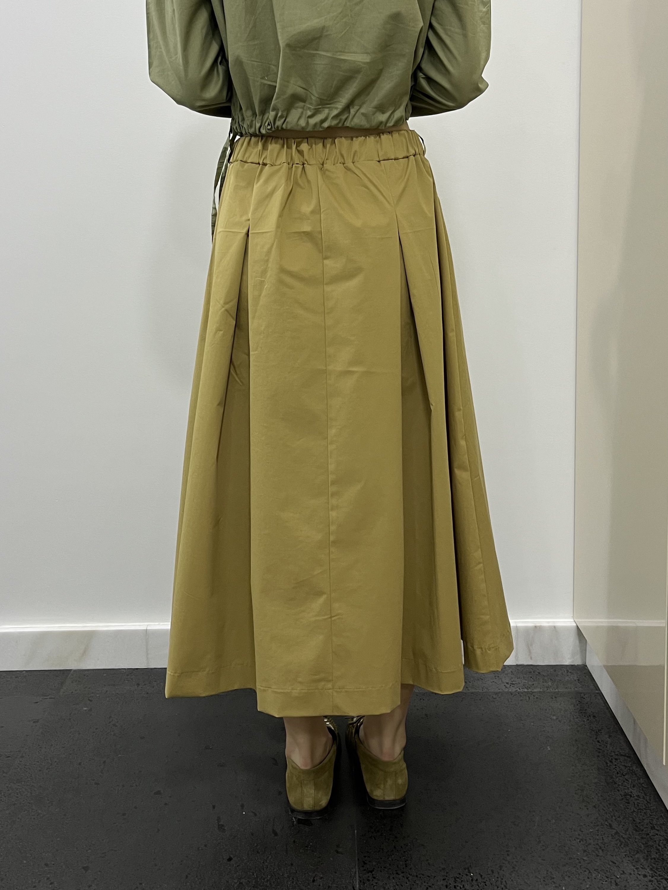ONE SIZE midi suknja od pamučnog kepera sa elastičnim pojasom sa gajkicama, dve falte napred i pozadi i džepovima sa strane u šavu. Odgovara veličinama od S-L.